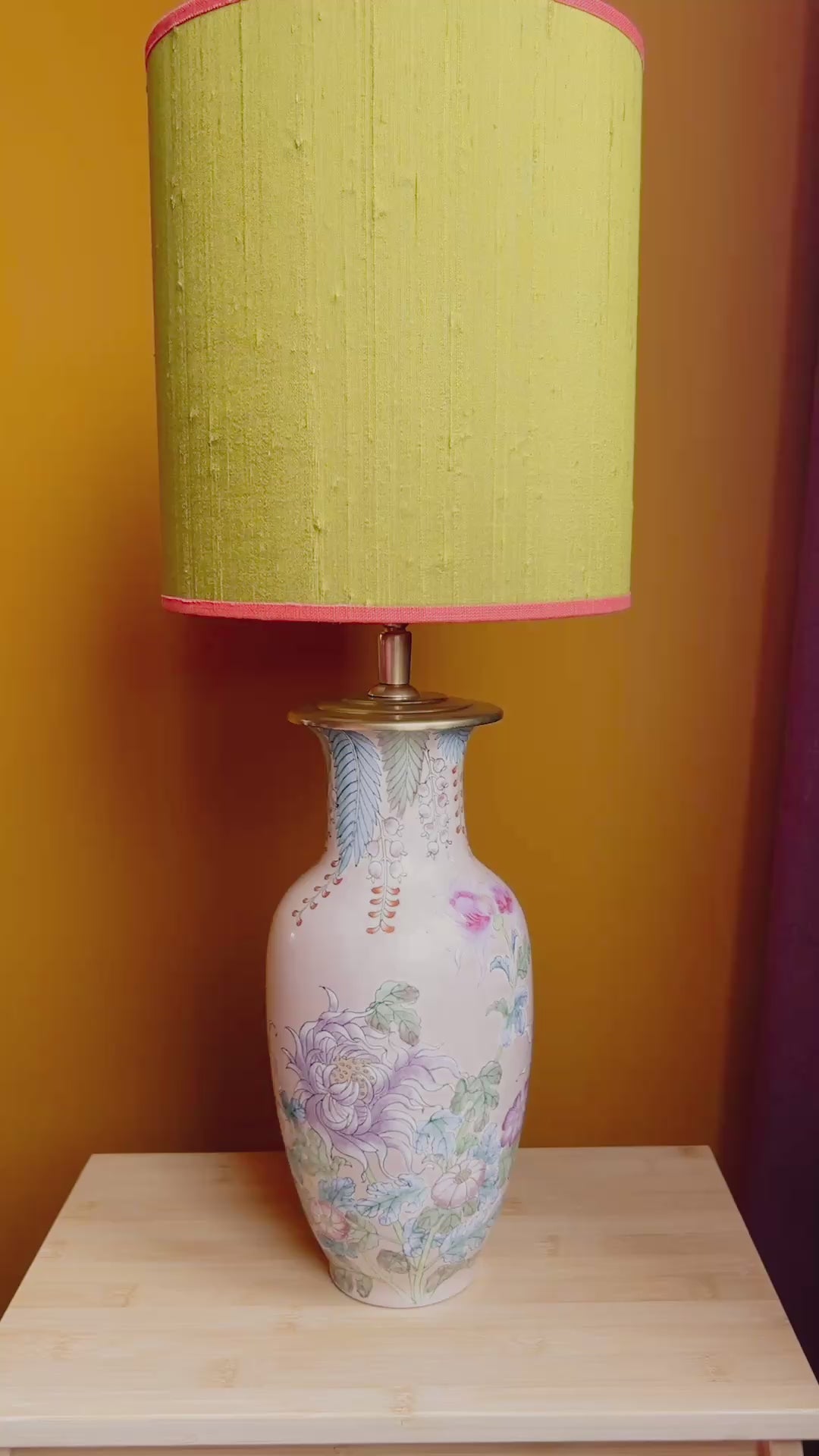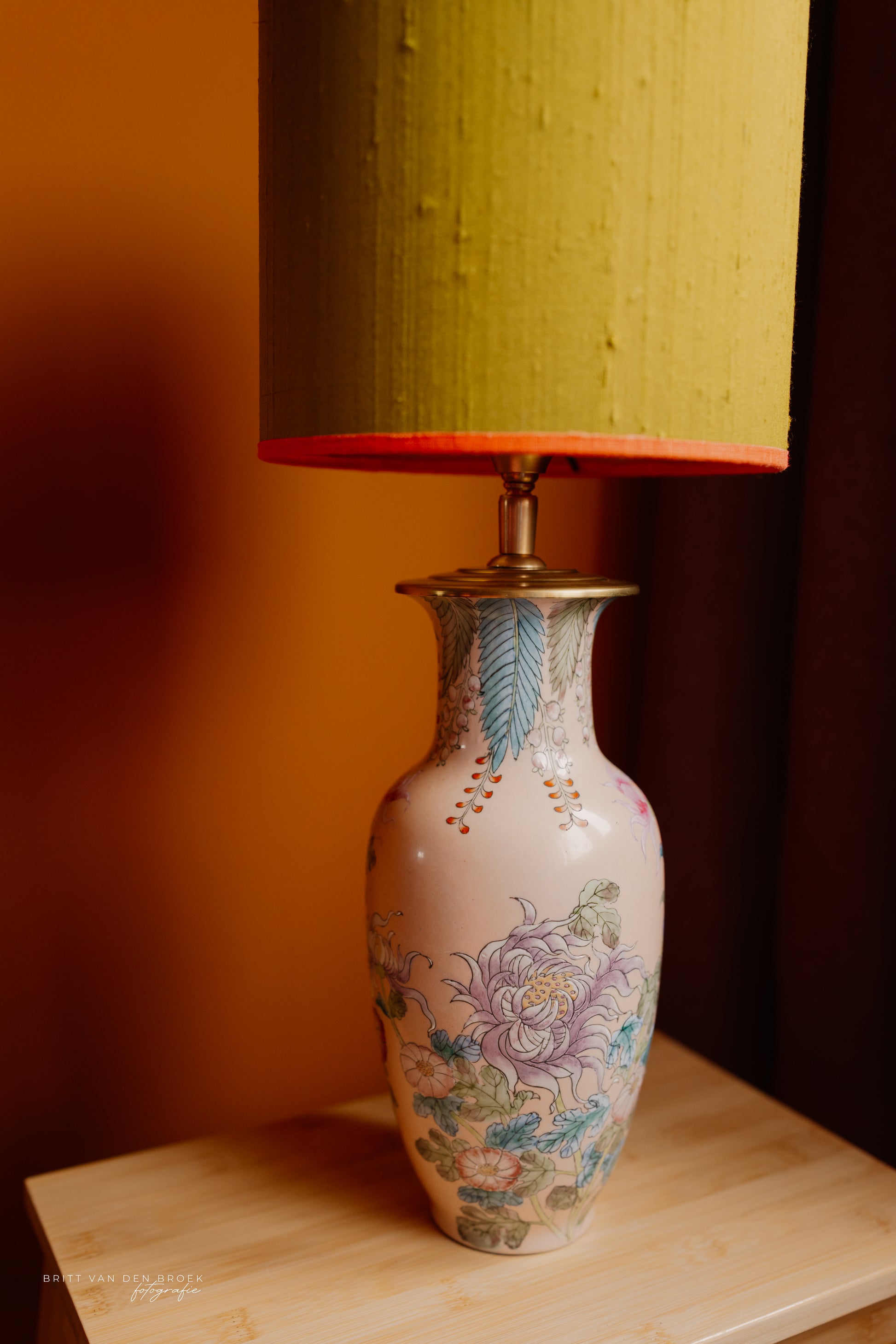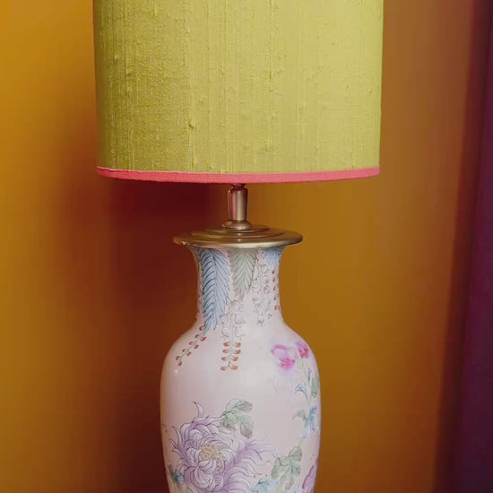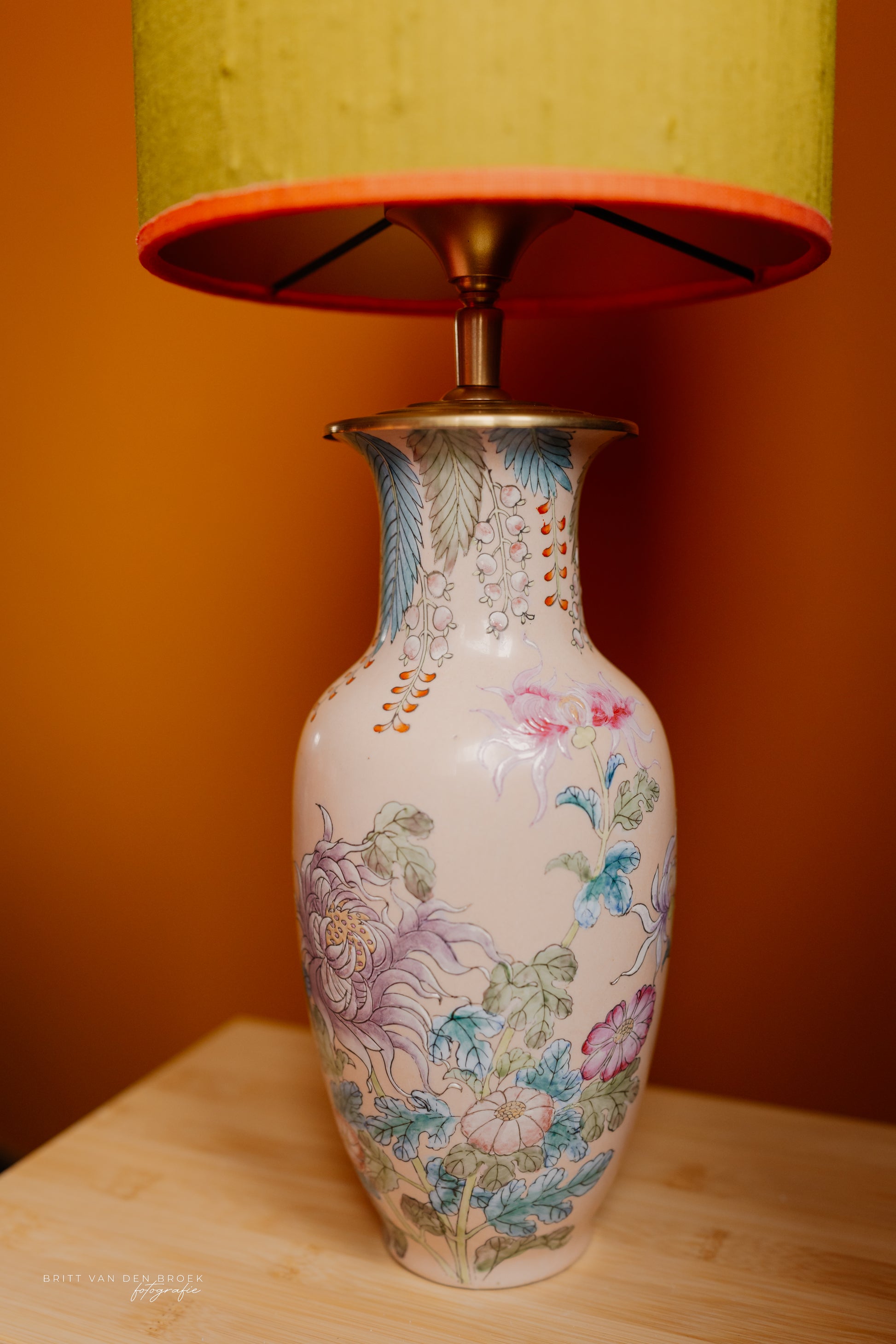 Deze lampenvoet staat vol met gekleurde bloemen in pasteltinten; de basiskleur is beige/roze. Hij is tot de fitting 30 cm hoog. Op de foto's staat er op de lampenvoet een lampenkap met een doorsnee van 25 cm en hoogte van 20 cm. Dit maakt de set zoals op de foto 50 cm hoog.