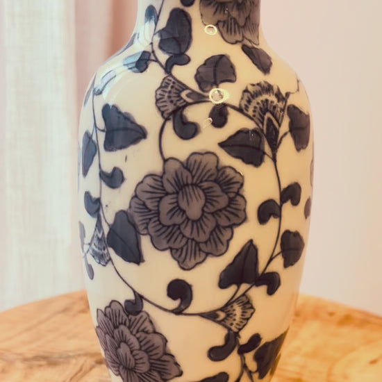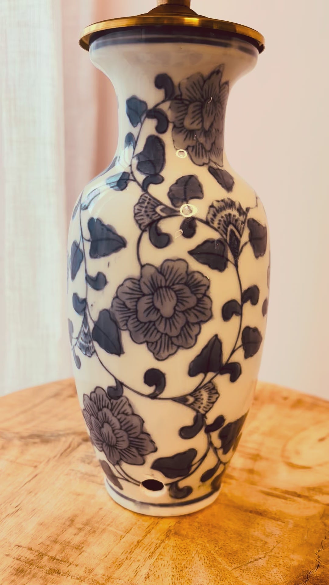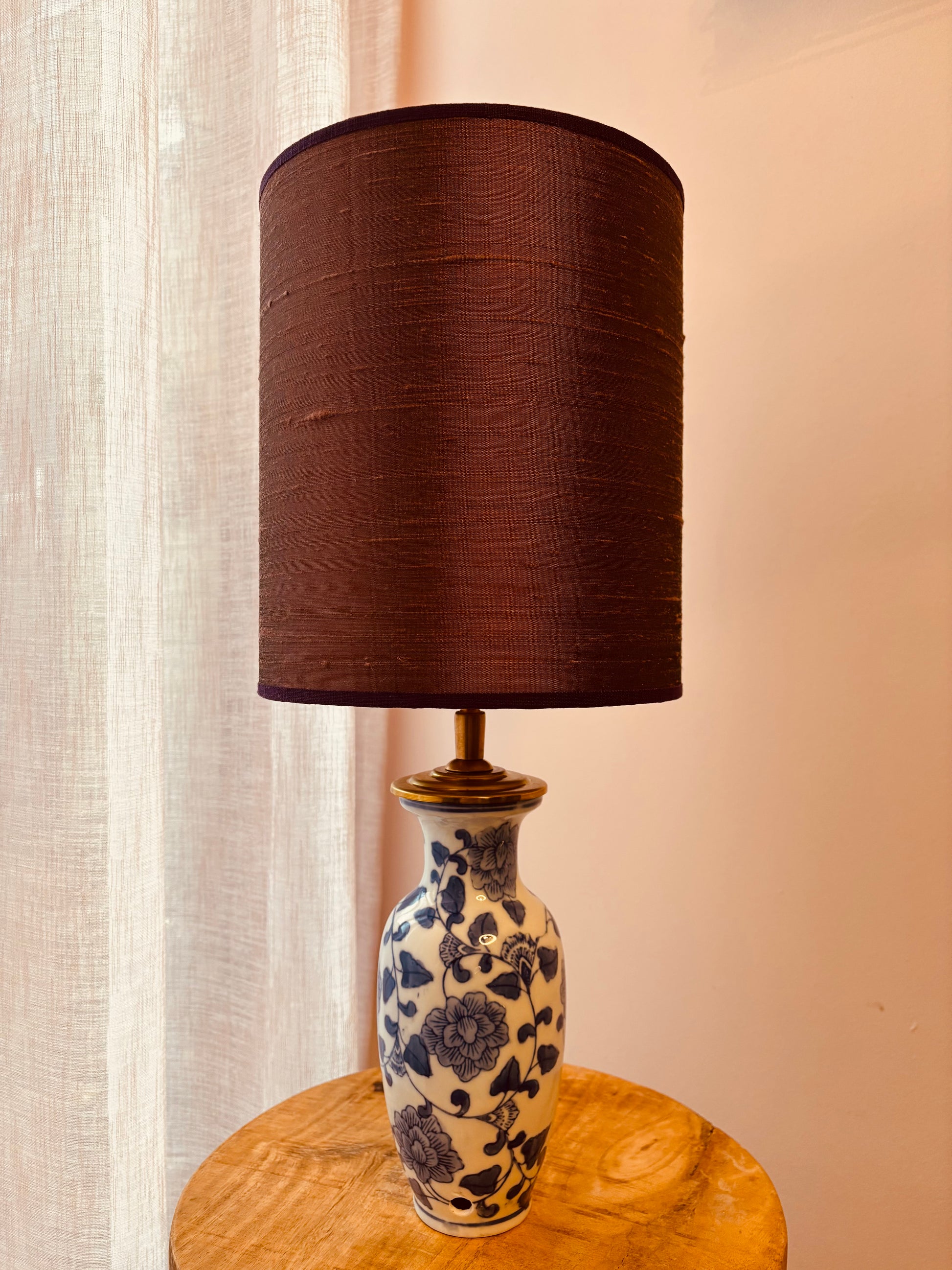 Deze lampenvoet staat vol met blauwe bloemen en blaadjes; de basiskleur is wit. Hij is tot de fitting 25 cm hoog. Op de foto staat er op de voet een lampenkap met een doorsnee van 20 cm en hoogte van 23 cm. Dit maakt de set zoals op de foto 48 cm hoog.
