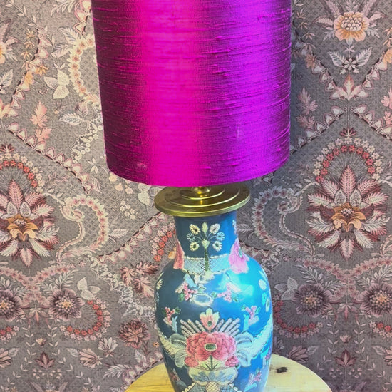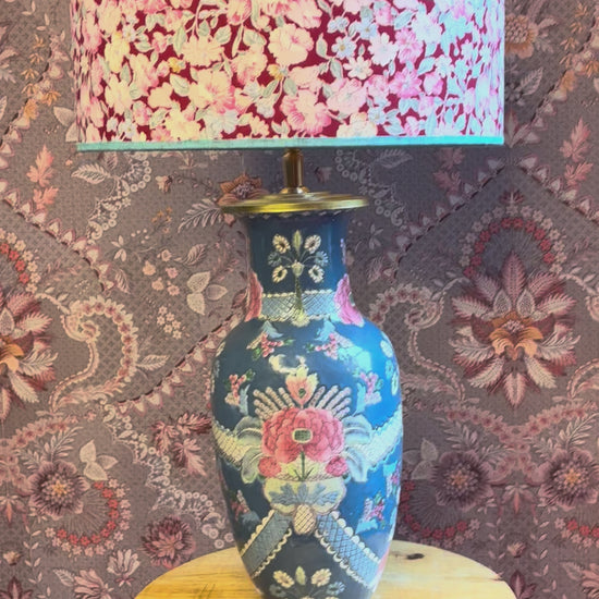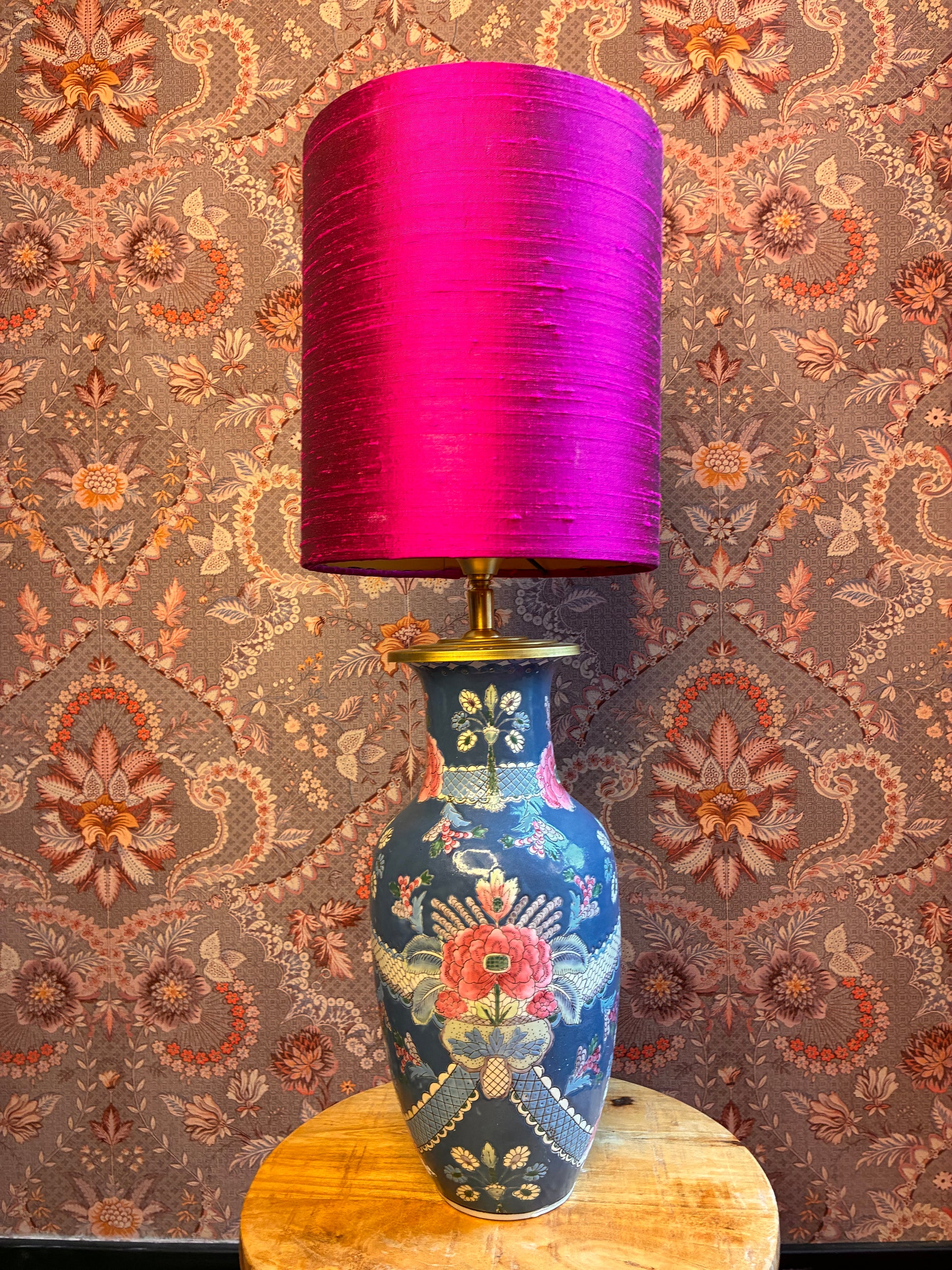 Deze lampenvoet is gemaakt van een blauwe (of voor sommige mensen paarse) vaas. Op de lampenvoet staan roze bloemen en versiersels. Hij is tot de fitting 34 cm hoog. Op de foto staat er op de voet twee lampen kappen. De fuchsia lampenkap heeft een doorsnee van 20 cm en hoogte van 23 cm. Dit maakt de set 57 cm hoog. De gebloemde lampenkap heeft een doorsnee van 30 cm en hoogte van 20 cm. Dit maakt deze set 54 cm hoog.