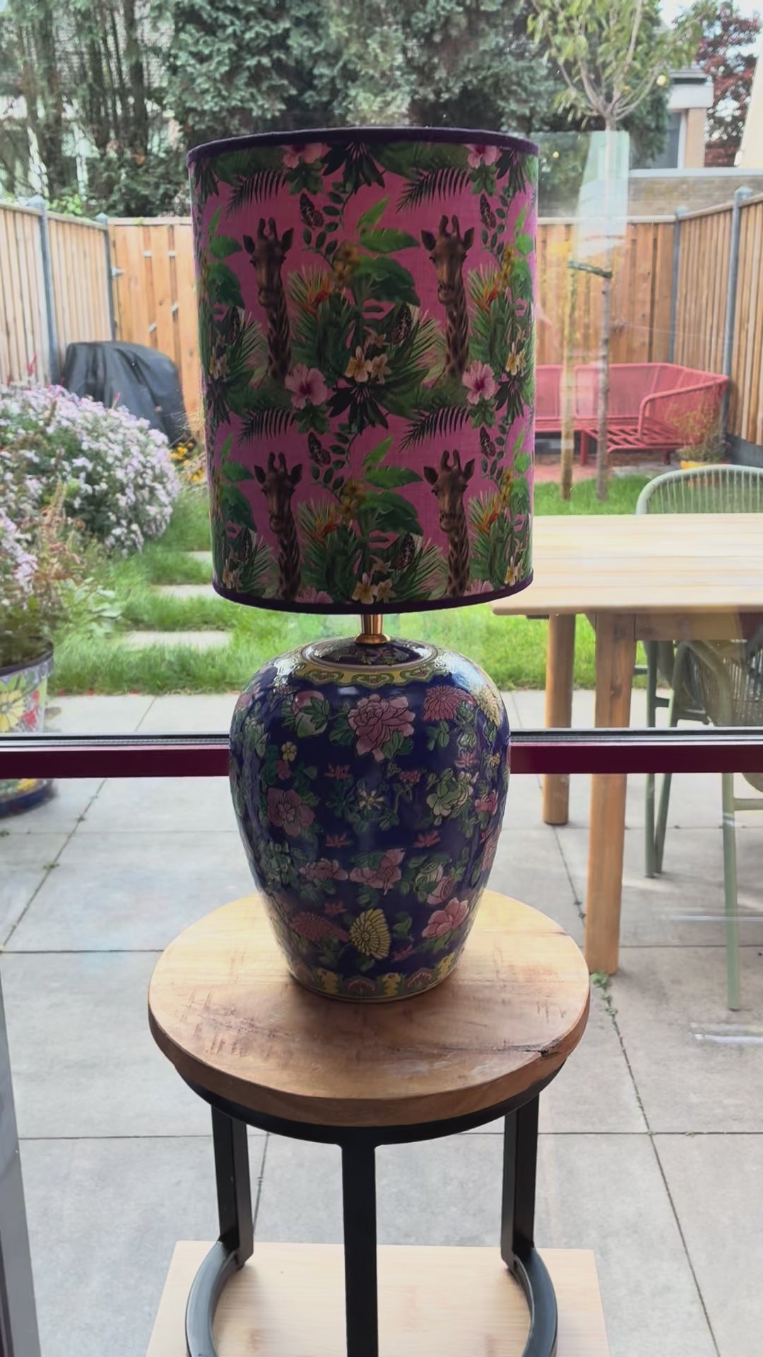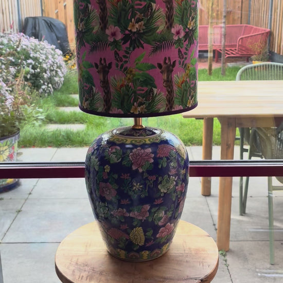 Deze lampenvoet is gemaakt van een blauwe dekselvaas. Op de lampenvoet staan bloemen in verschillende kleuren. Hij is tot de fitting 27 cm hoog. Op de foto staat er op de voet een lampenkap met een doorsnee van 20 cm en hoogte van 25 cm. Dit maakt de set 52 cm hoog.