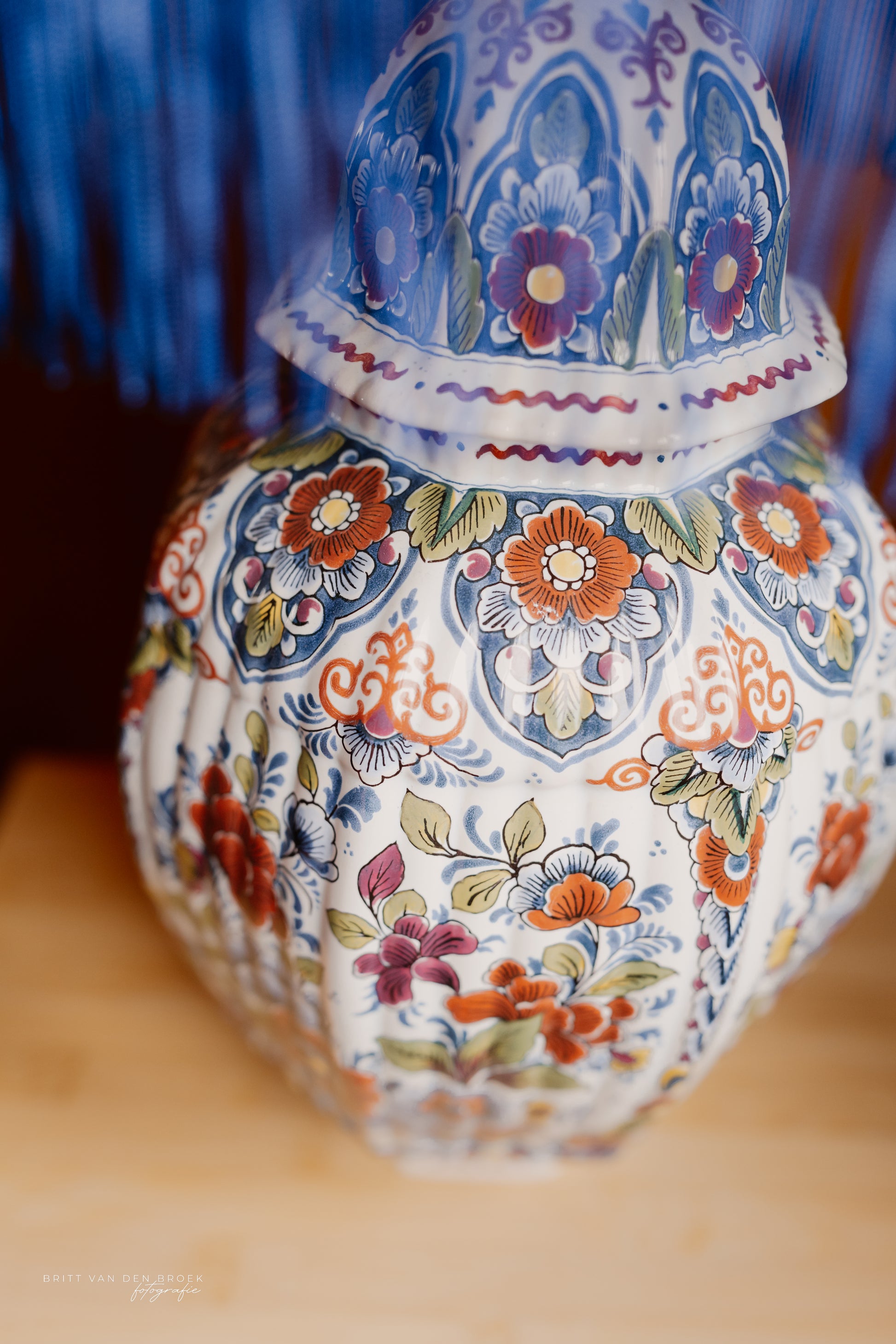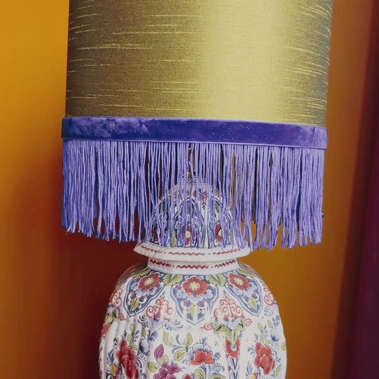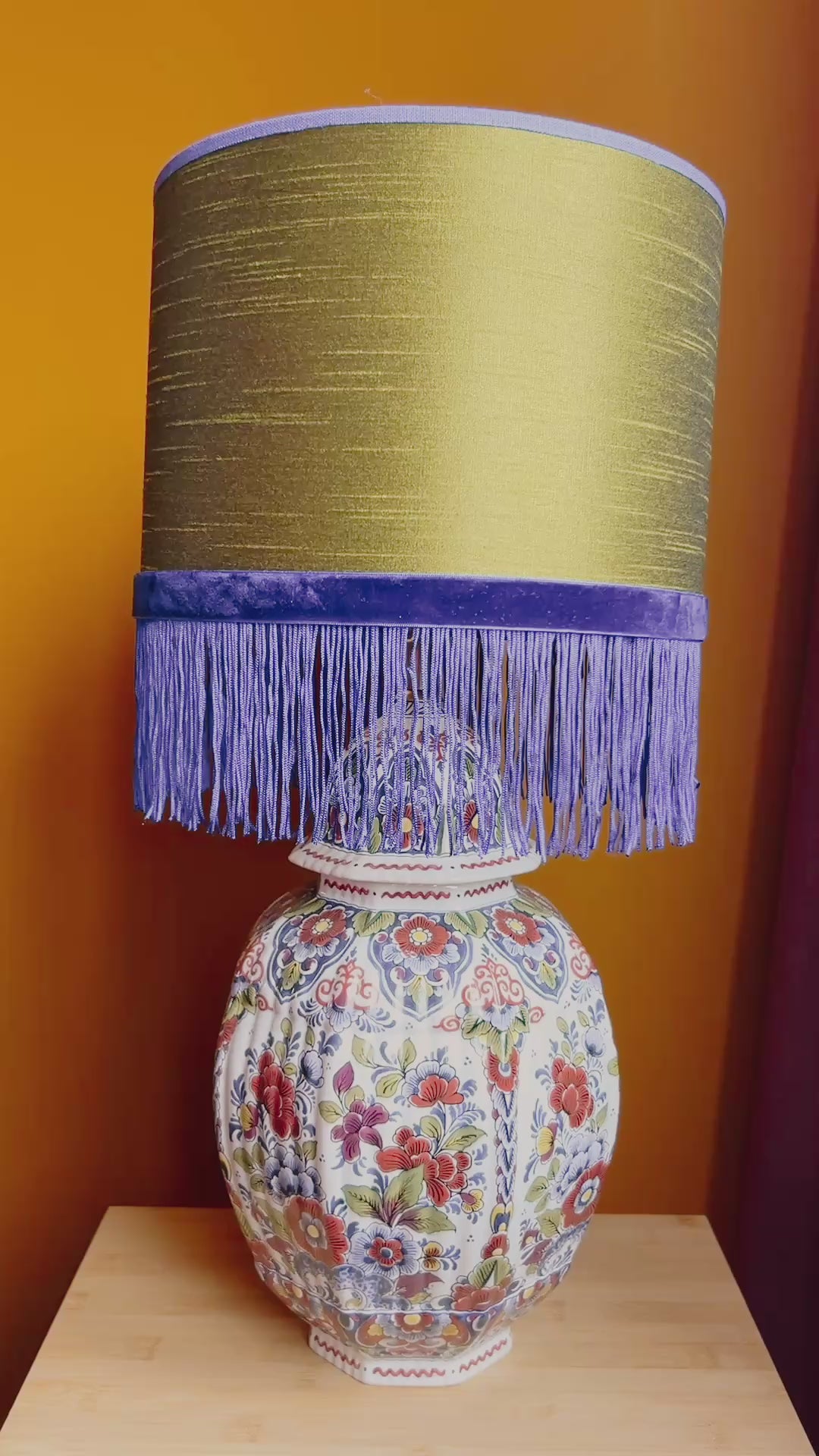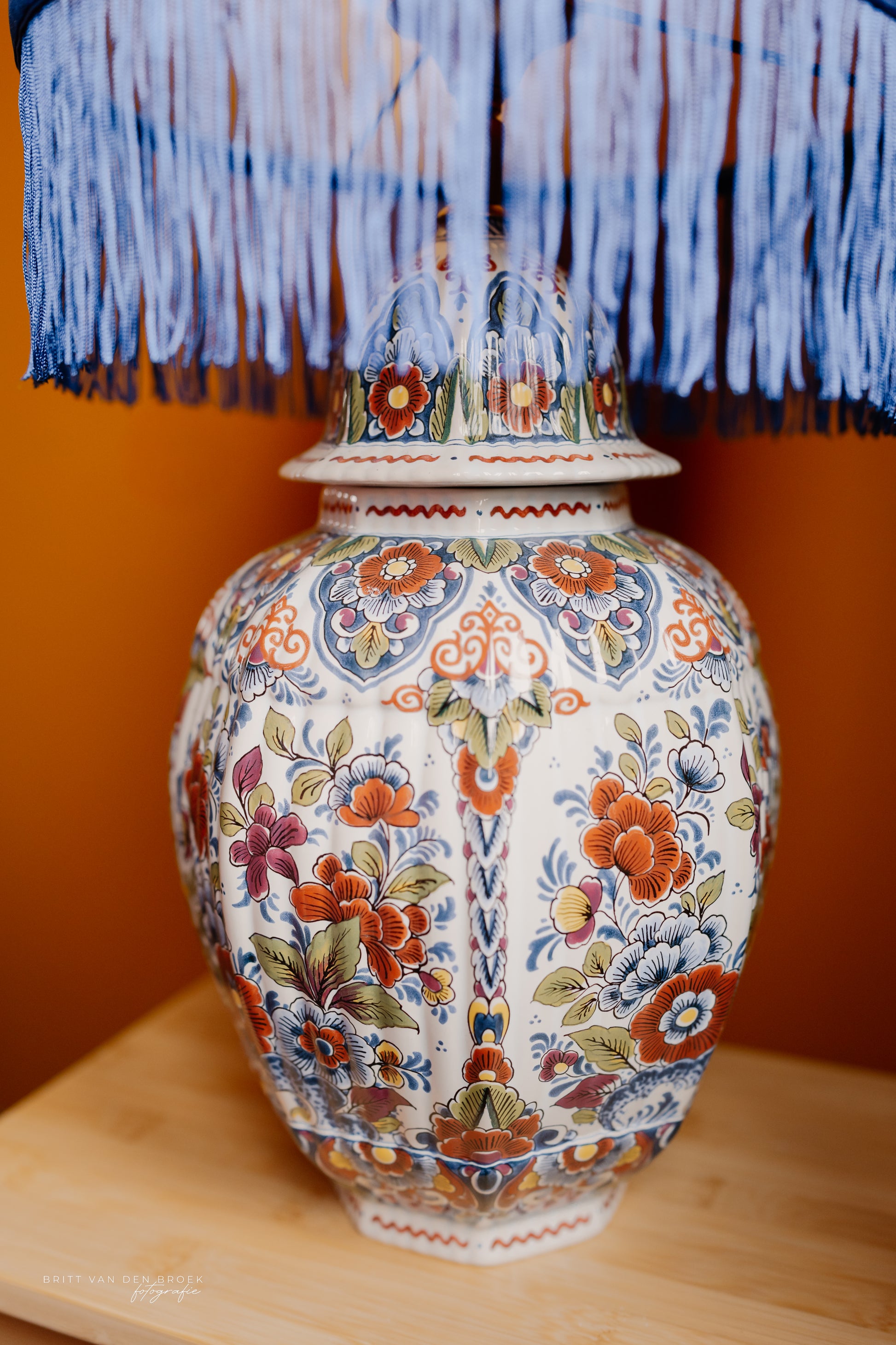 Deze lampenvoet is gemaakt van een Delftsblauwe dekselvaas met veel bloemen en blaadjes in meer kleuren dan alleen blauw. Hij is tot de fitting 34 cm hoog. Op de foto's staat er op de lampenvoet een lampenkap met een doorsnee van 25 cm en hoogte van 18 cm. Dit maakt de set zoals op de foto 52 cm hoog.