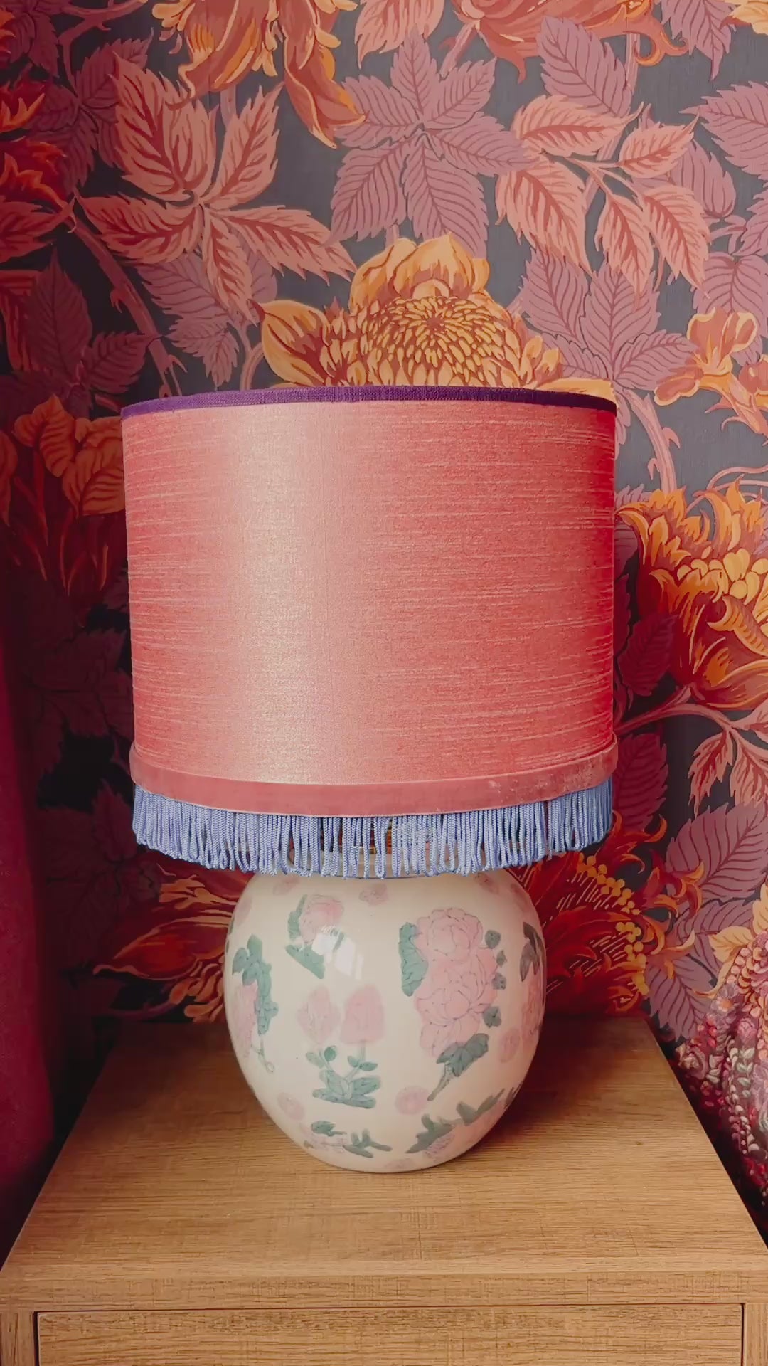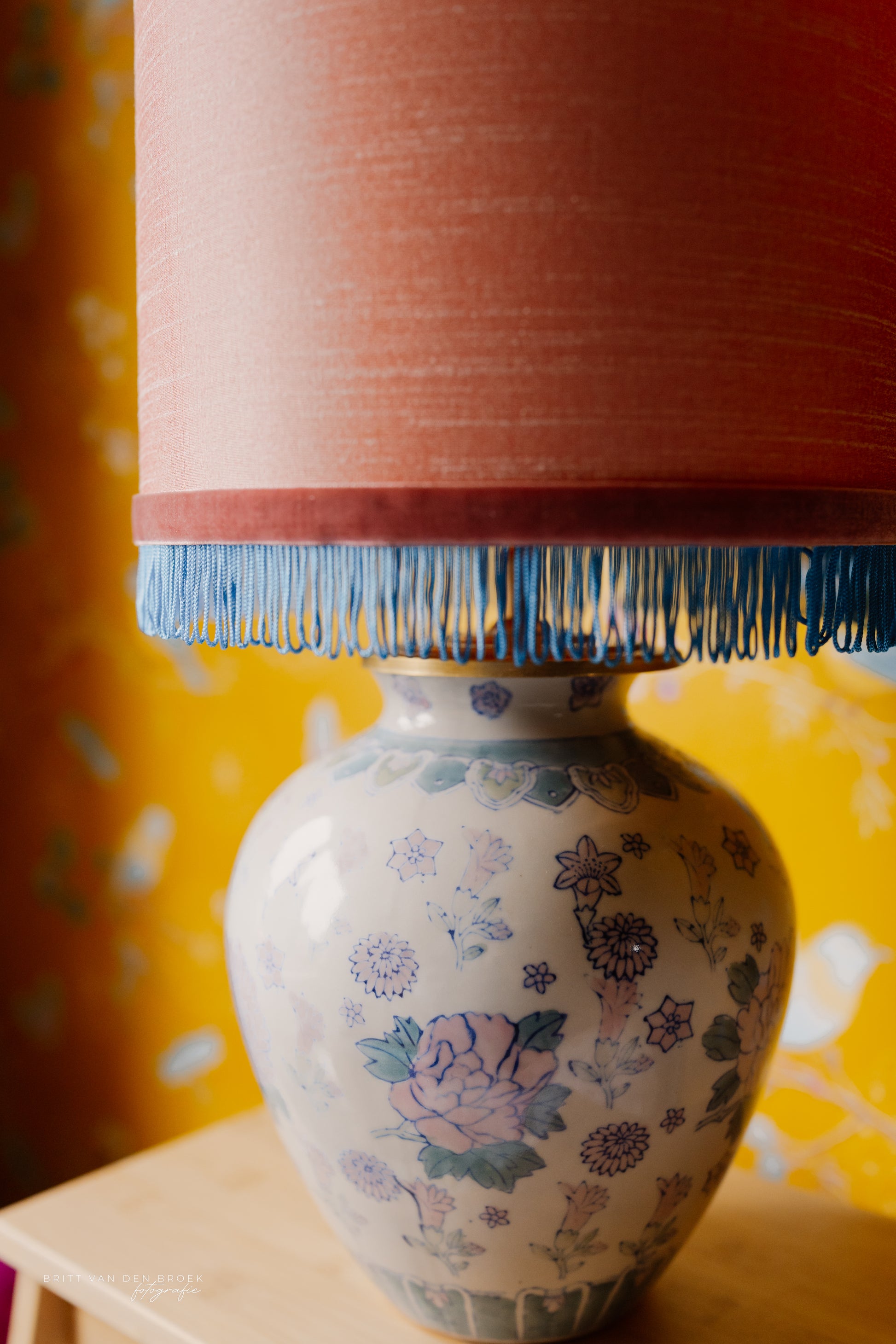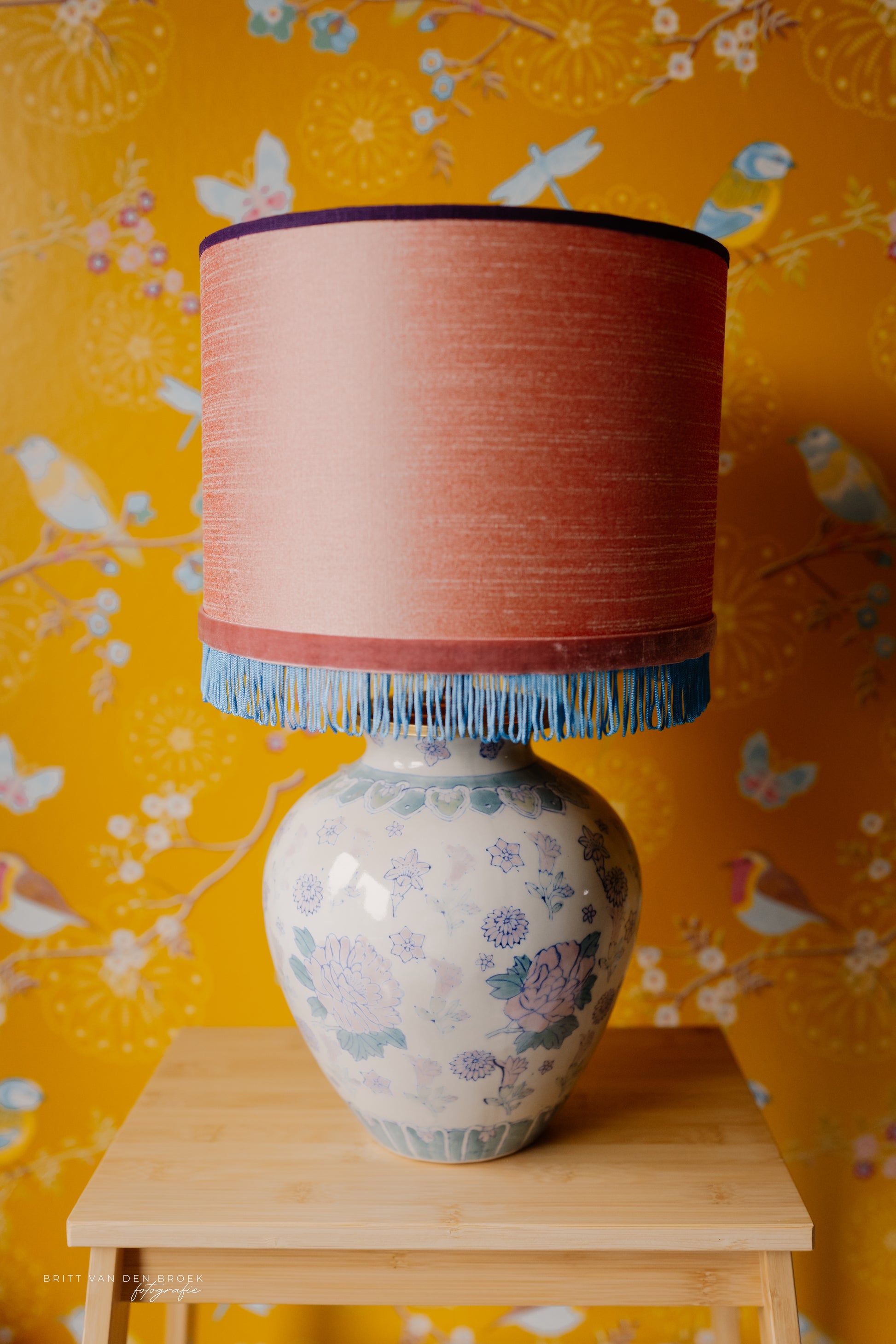 Deze lampenvoet is gemaakt van een witte dekselvaas met bloemen, planten en dieren en is 23 cm hoog tot de fitting. Op deze lampenvoet staat een lampenkap met een doorsnee van 25 cm en hoogte van 18 cm (exclusief franjes). De set zoals op de foto is 41 cm hoog.