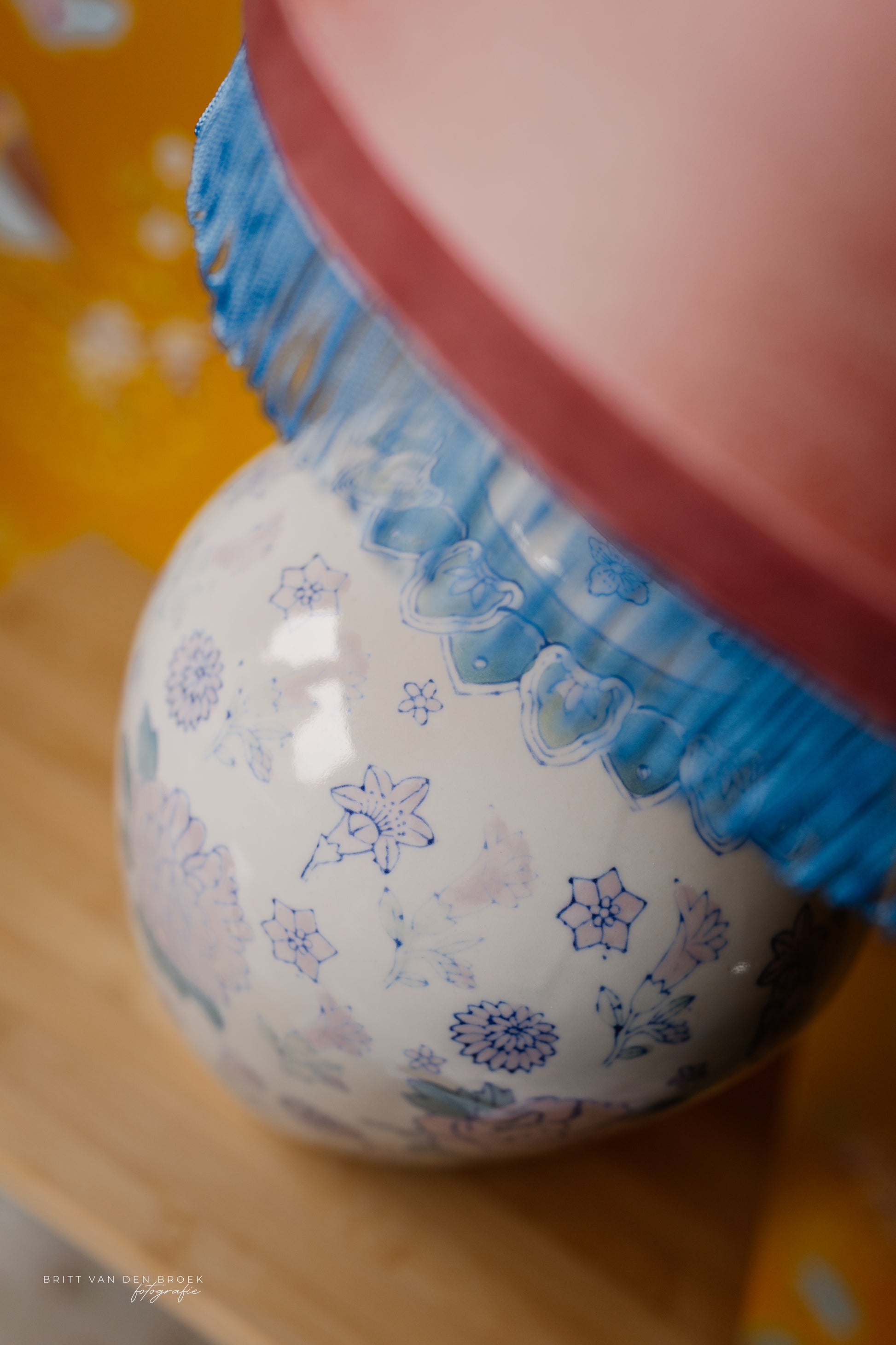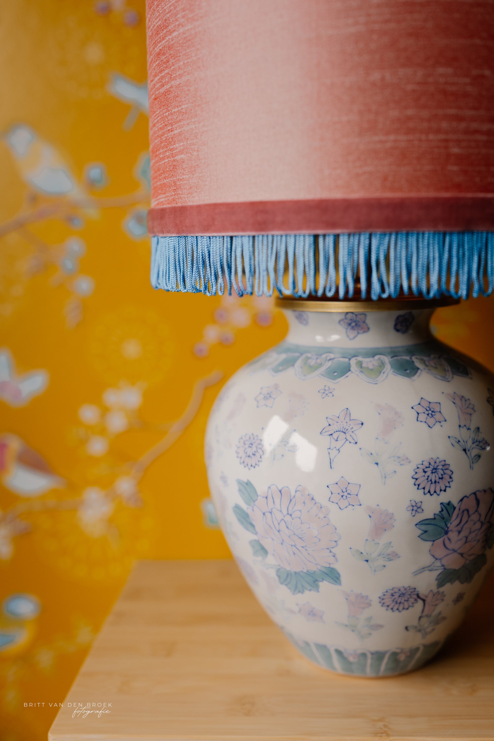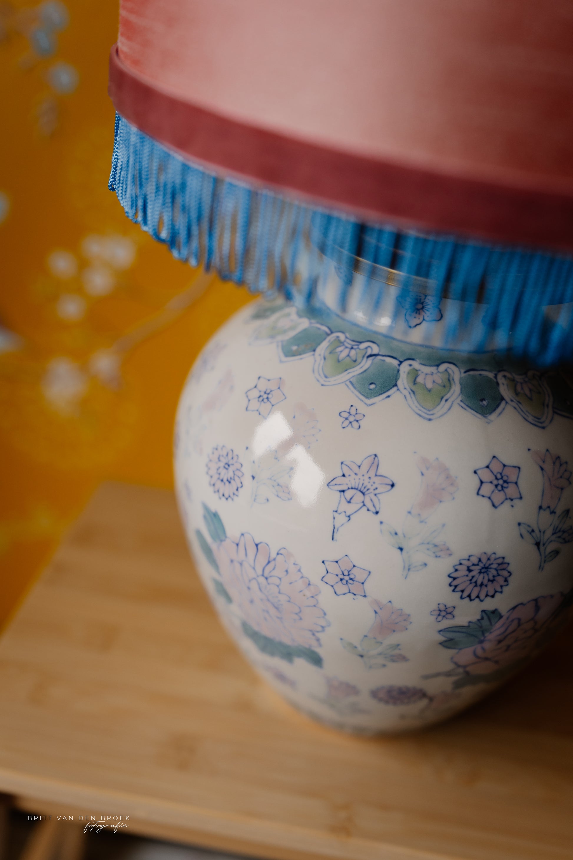 Deze lampenvoet is gemaakt van een witte dekselvaas met bloemen, planten en dieren en is 23 cm hoog tot de fitting. Op deze lampenvoet staat een lampenkap met een doorsnee van 25 cm en hoogte van 18 cm (exclusief franjes). De set zoals op de foto is 41 cm hoog.