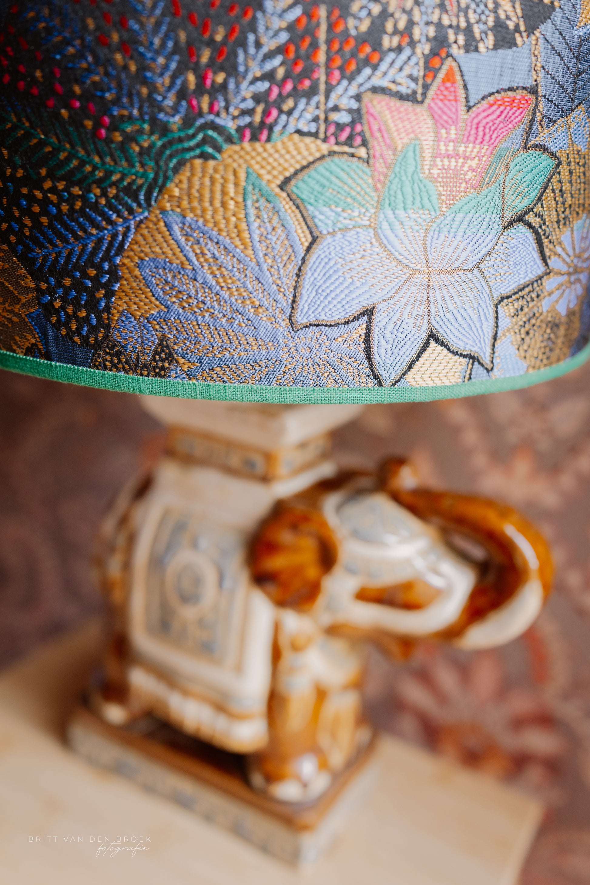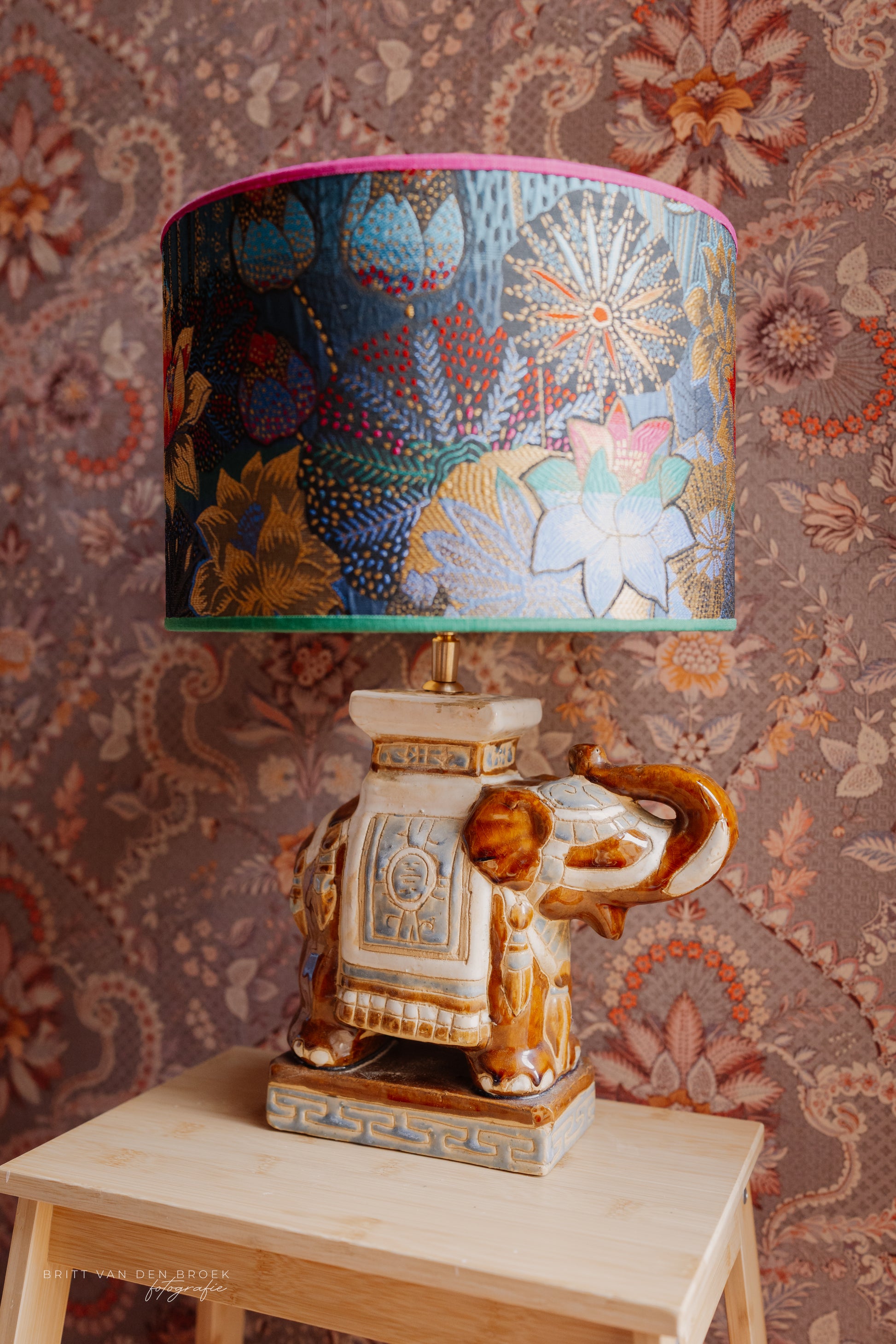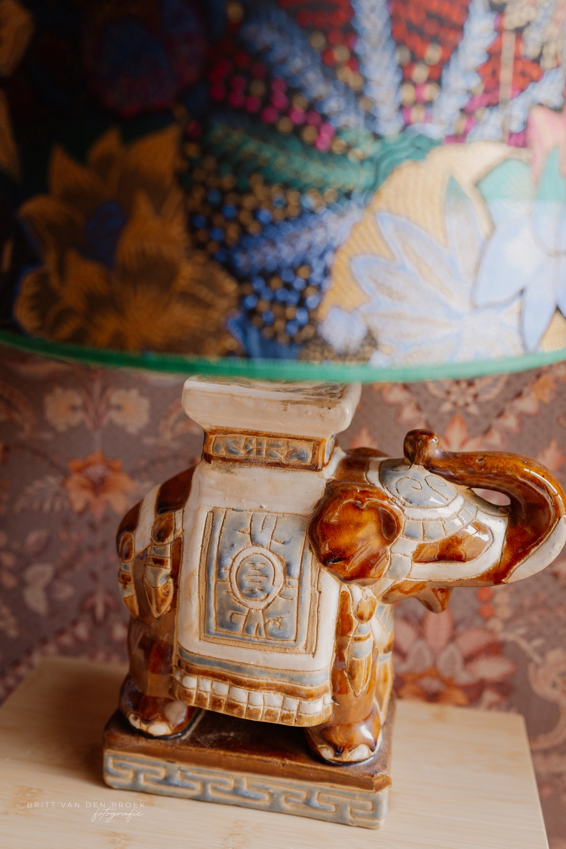 Deze lampenvoet is gemaakt van een bruin beeld van een olifant en is 27 cm hoog tot de fitting. Op deze lampenvoet staat een lampenkap met een doorsnee van 20 cm en hoogte van 20 cm. De set zoals op de foto is 47 cm hoog.