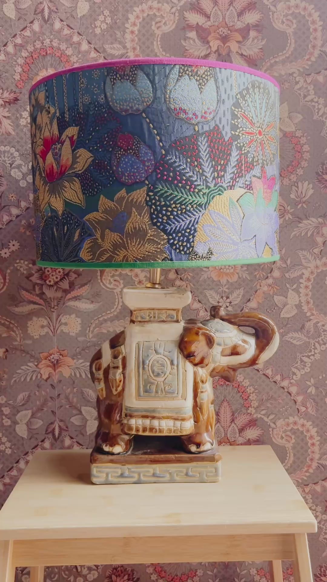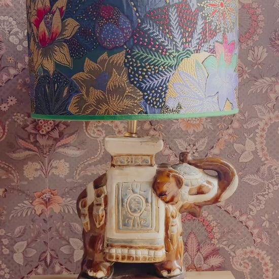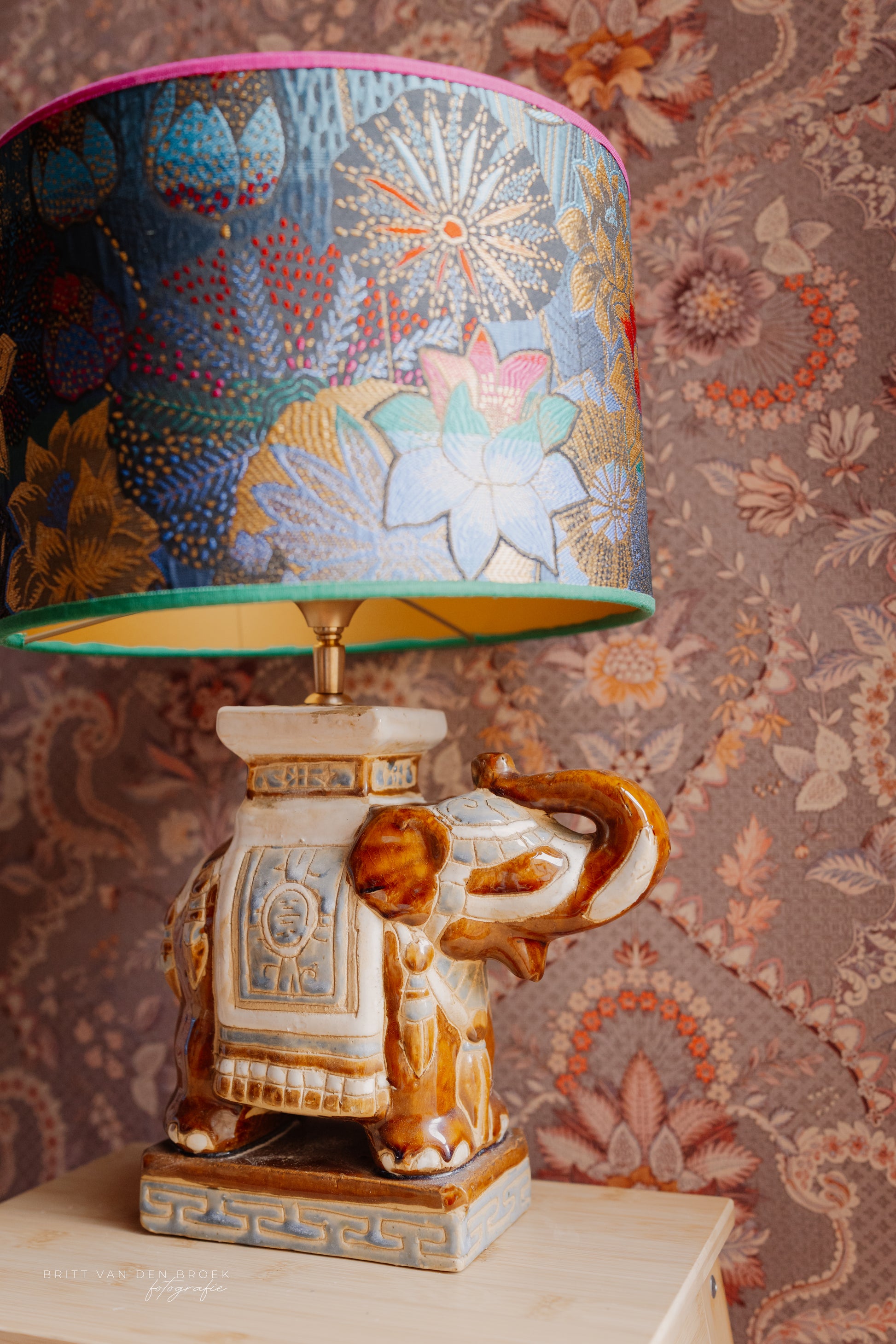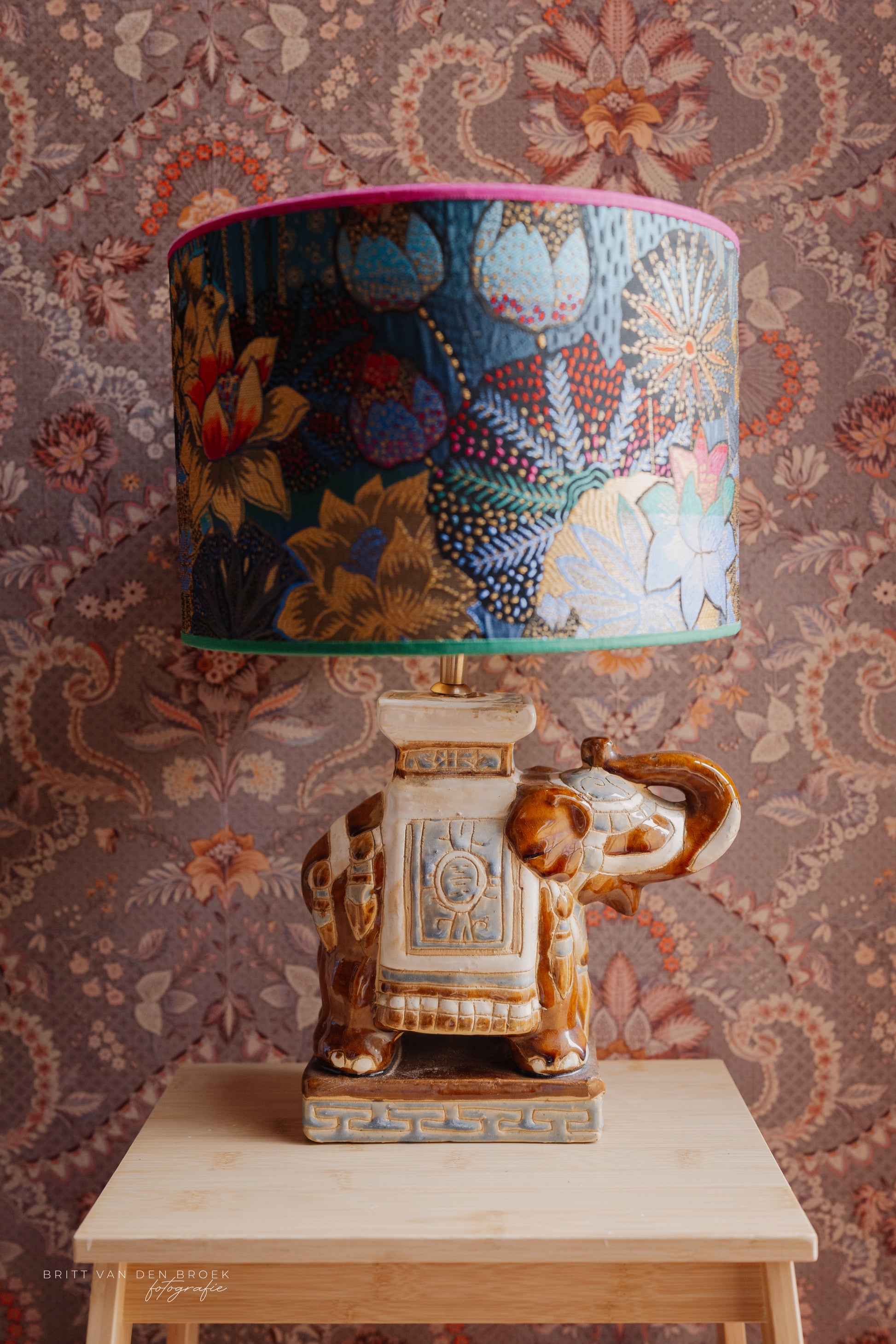 Deze lampenvoet is gemaakt van een bruin beeld van een olifant en is 27 cm hoog tot de fitting. Op deze lampenvoet staat een lampenkap met een doorsnee van 20 cm en hoogte van 20 cm. De set zoals op de foto is 47 cm hoog.