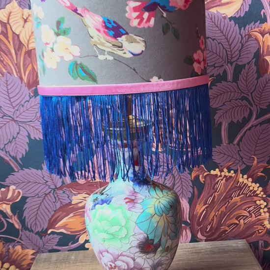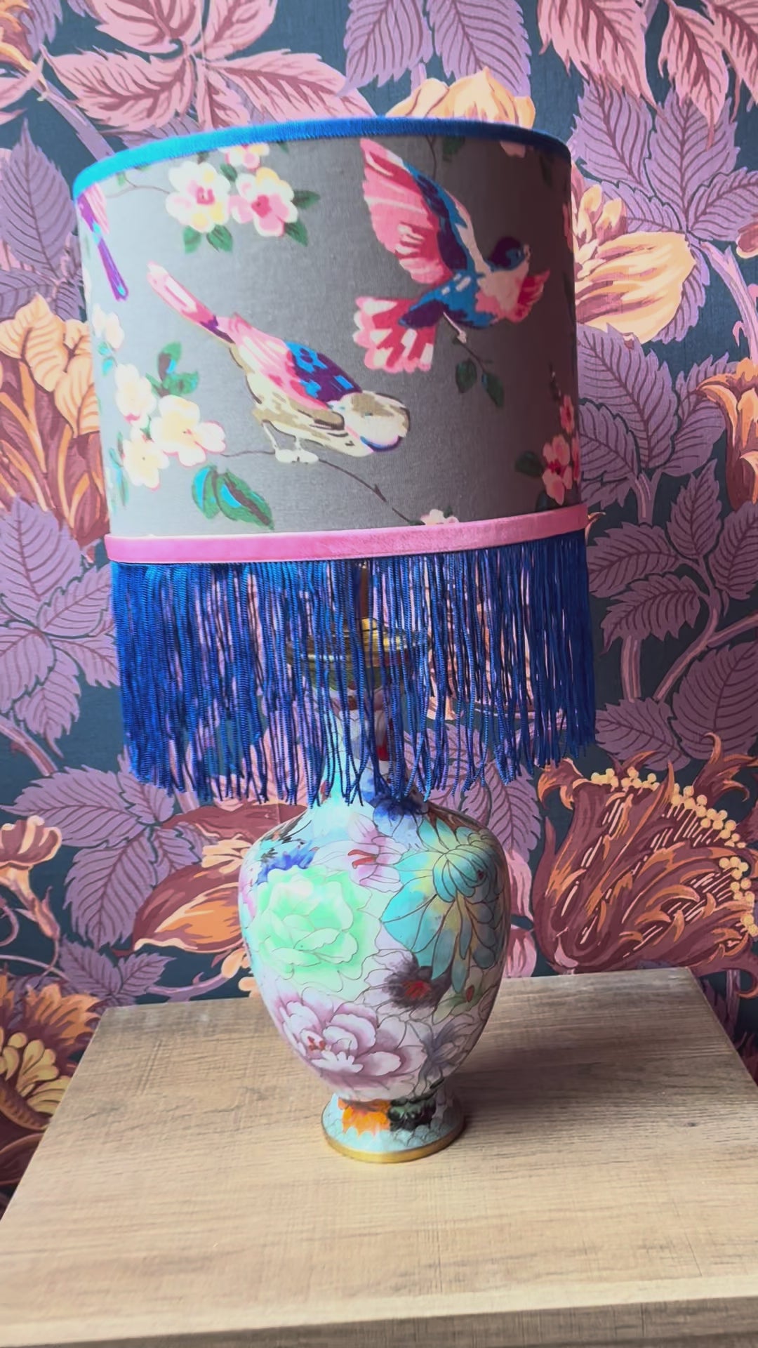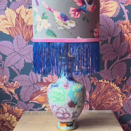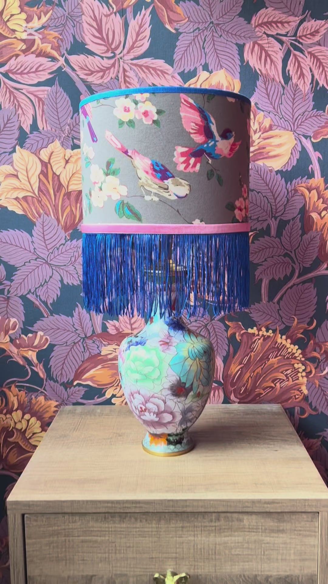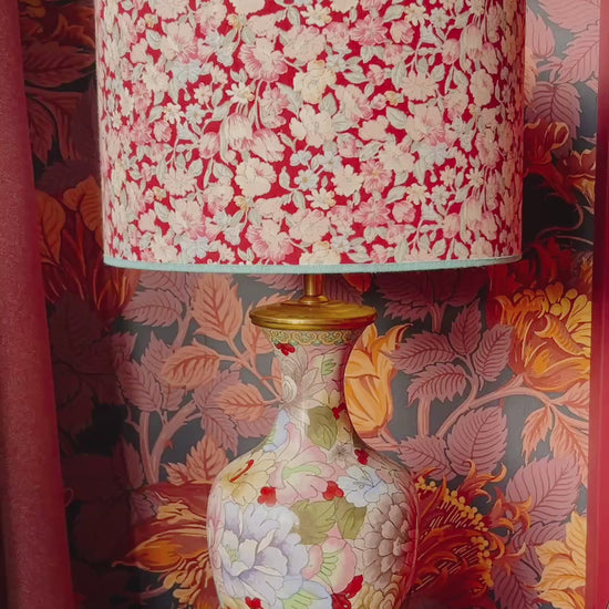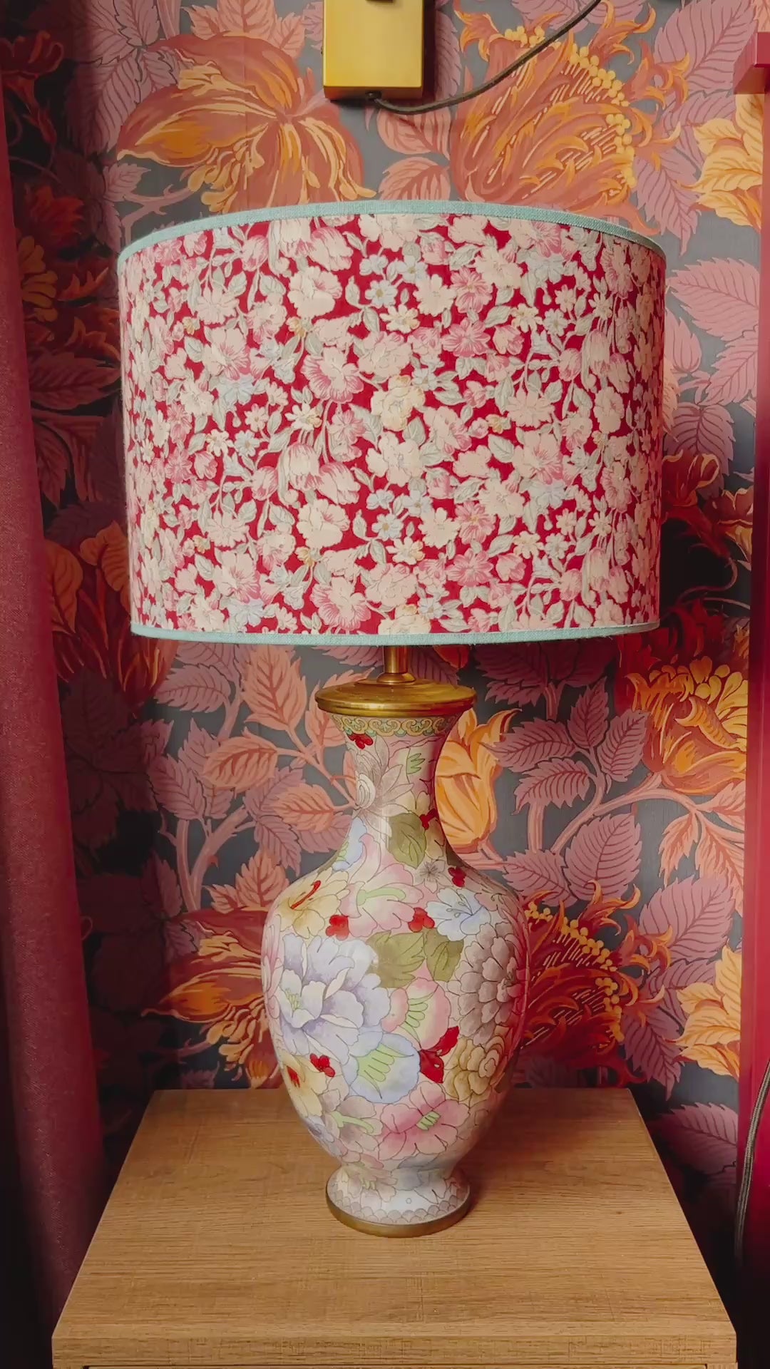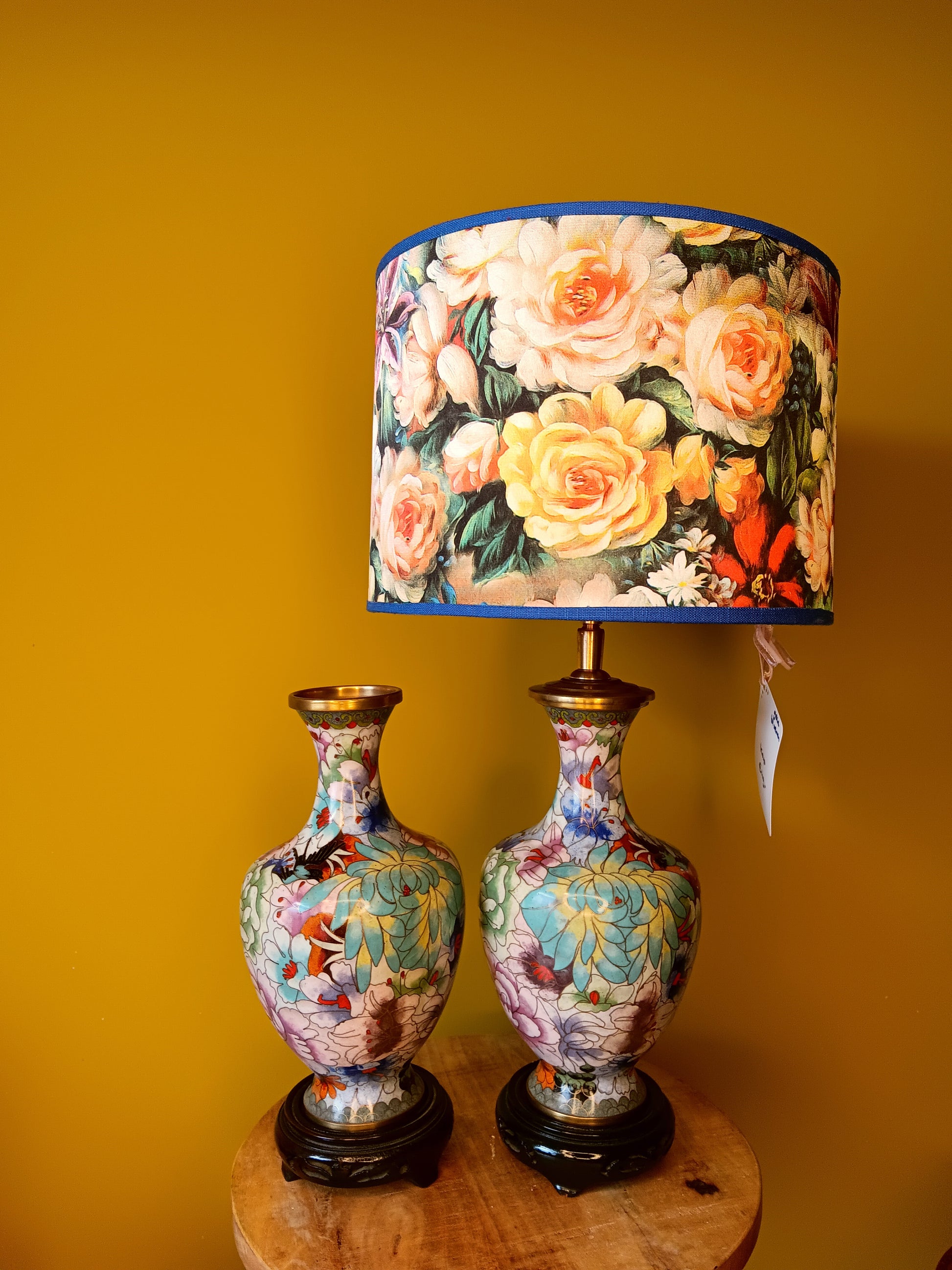 Deze lampenvoet is gemaakt van een cloissoné-vaas en is 30 cm hoog tot de fitting, als hij op het plateautje staat. Als je het plateautje niet mooi vindt, kun je deze weg laten (deze zit namelijk los). Dan is de lampenvoet 27 cm hoog tot de fitting.