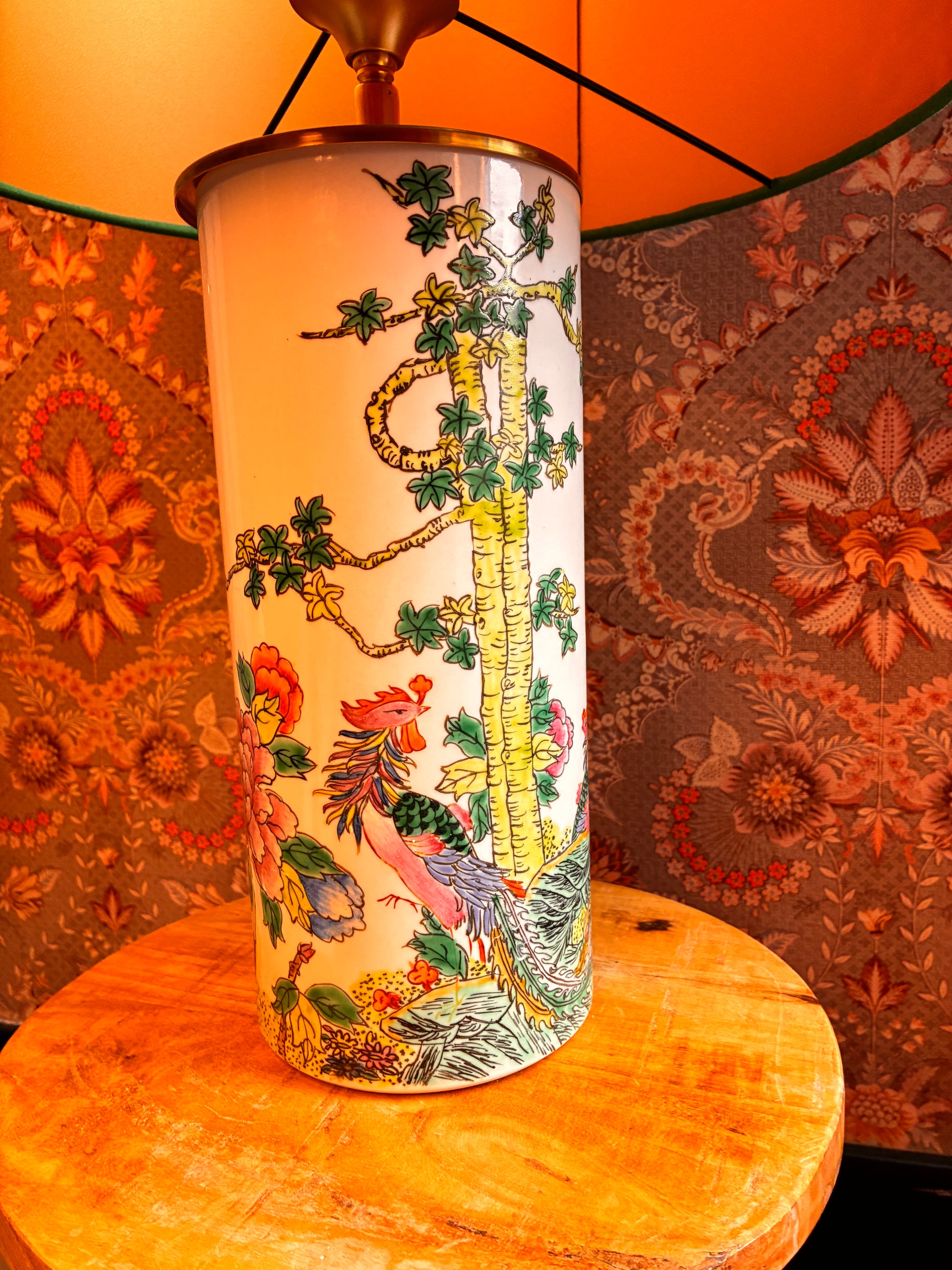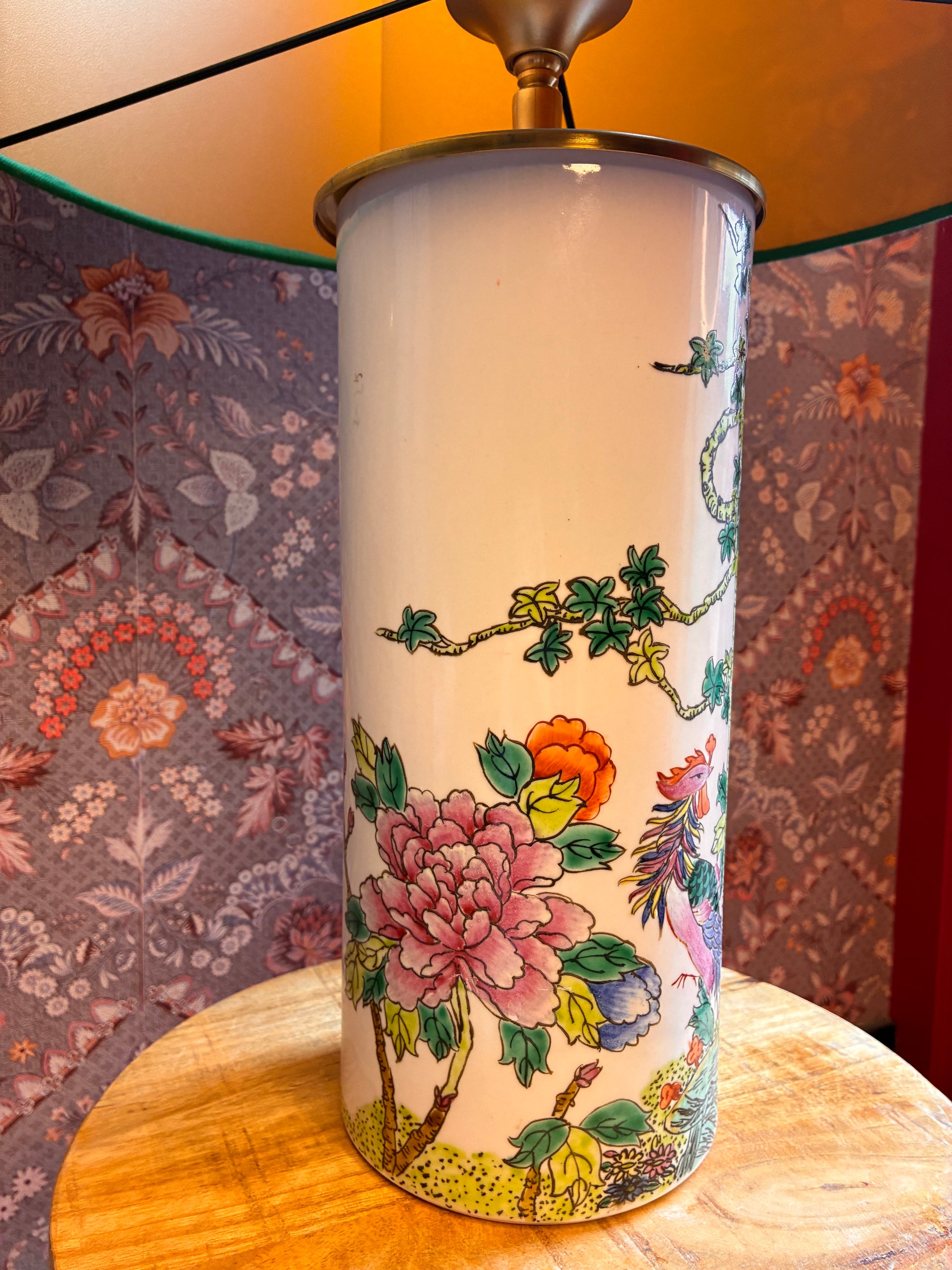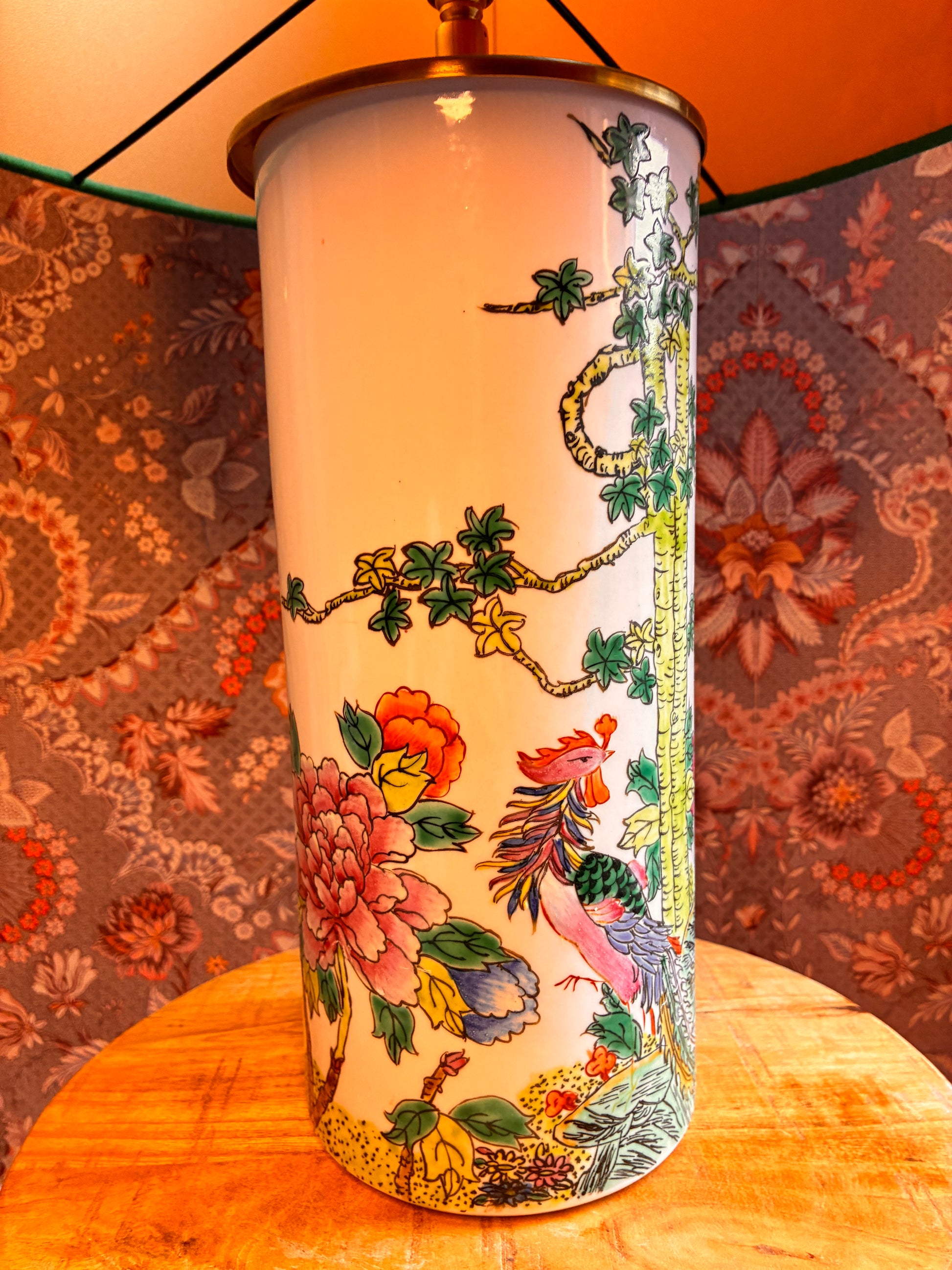 Deze lampenvoet is gemaakt van een cilindervormige vaas. Op de lampenvoet staan bloemen en vogels. Hij is tot de fitting 32 cm hoog. Op de foto staat er op de voet een lampenkap met een doorsnee van 40 cm en hoogte van 30 cm. Dit maakt de set 63 cm hoog.