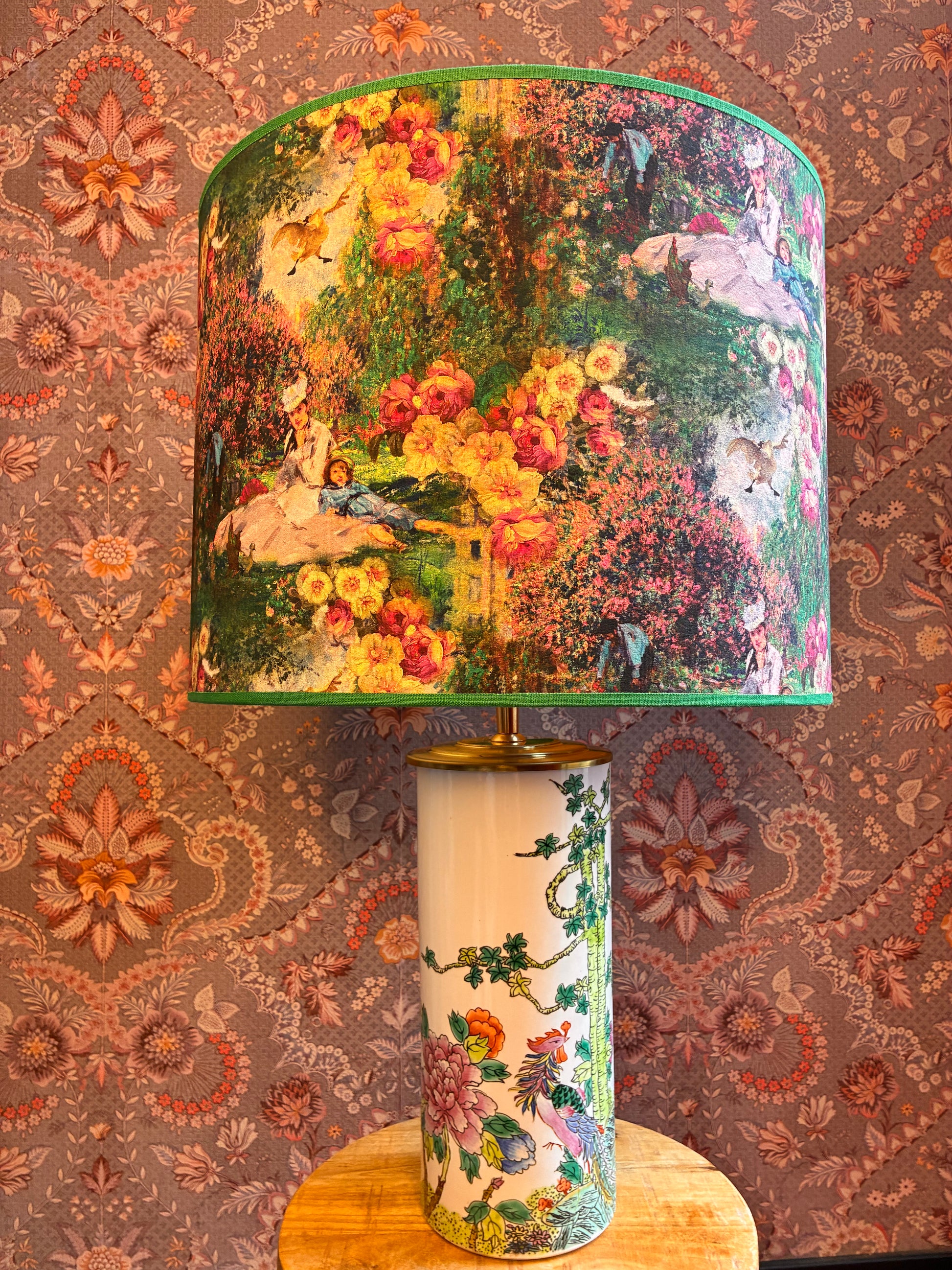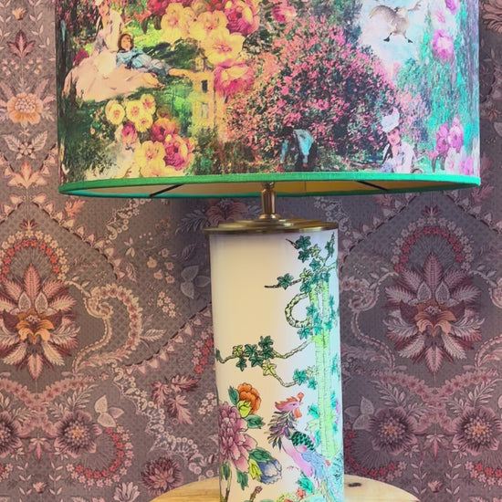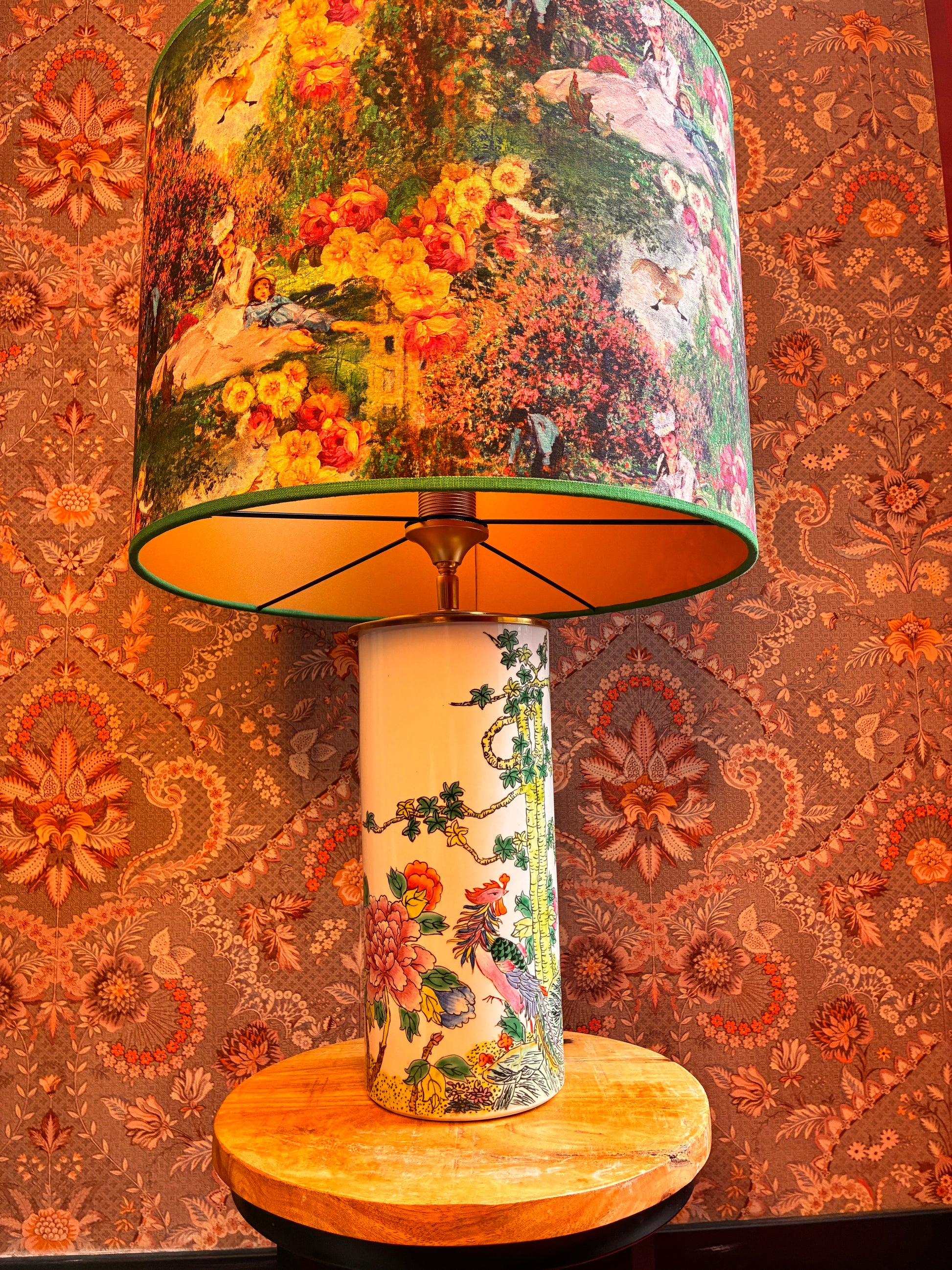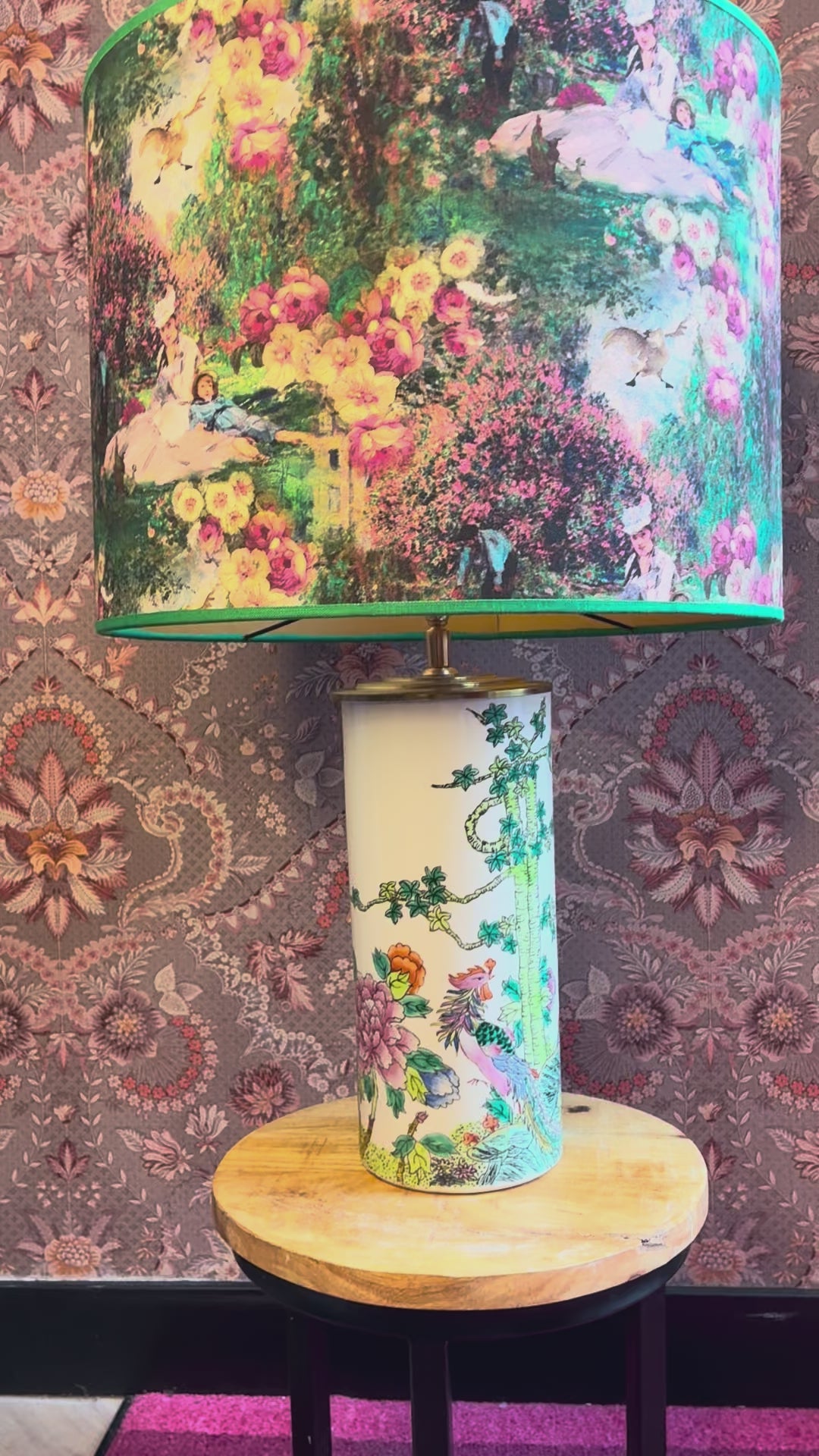 Deze lampenvoet is gemaakt van een cilindervormige vaas. Op de lampenvoet staan bloemen en vogels. Hij is tot de fitting 32 cm hoog. Op de foto staat er op de voet een lampenkap met een doorsnee van 40 cm en hoogte van 30 cm. Dit maakt de set 63 cm hoog.
