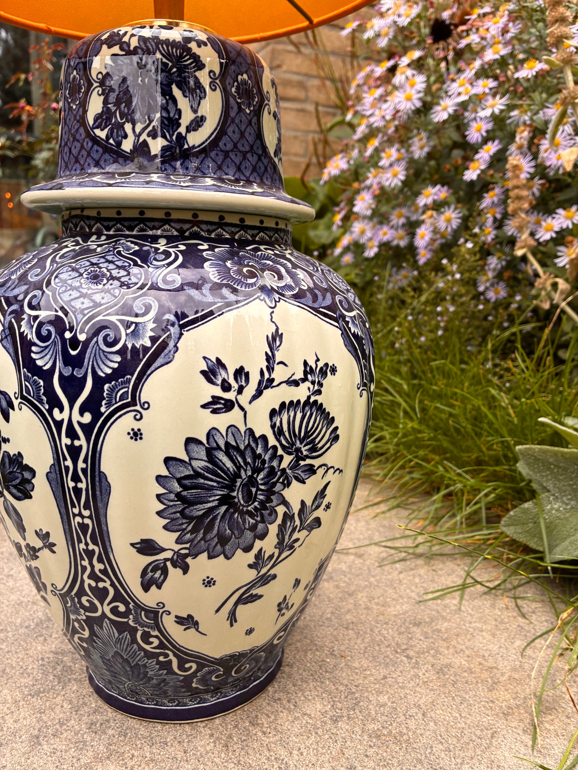 Deze lampenvoet is gemaakt van een Delftsblauwe dekselvaas. Op de lampenvoet staan bloemen in verschillende kleuren. Hij is tot de fitting 36 cm hoog. Op de foto staat er op de voet een lampenkap met een doorsnee van 25 cm en hoogte van 25 cm. Dit maakt de set 61 cm hoog.