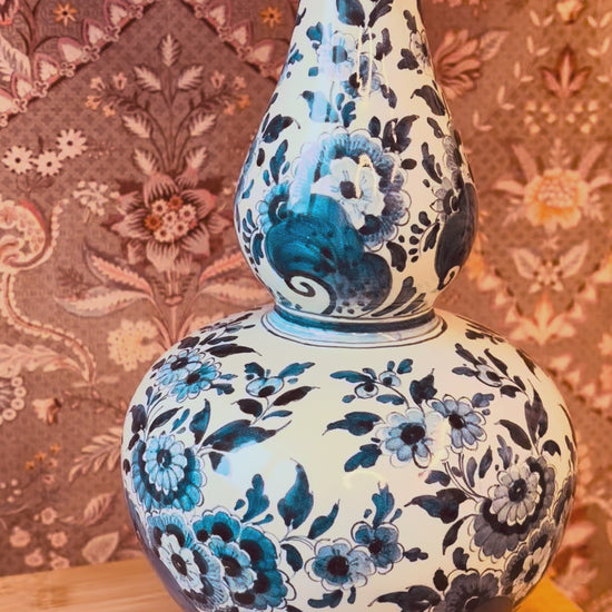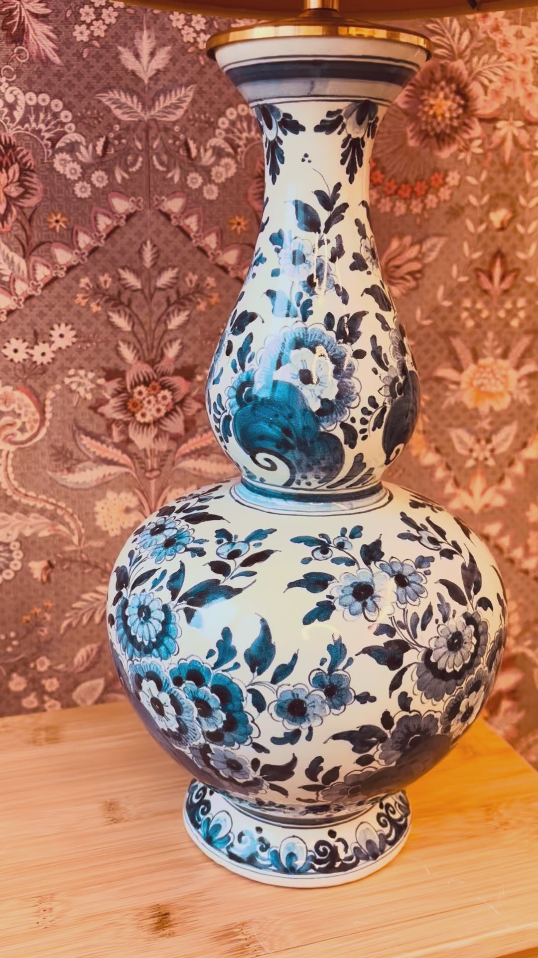 Deze lampenvoet is gemaakt van een grote Delftsblauwe vaas en is 39 cm hoog tot de fitting. Op de foto staat er een lampenkap op de lampenvoet met een doorsnee van 30 cm en hoogte van 32cm. De set zoals op de foto is 71 cm hoog.