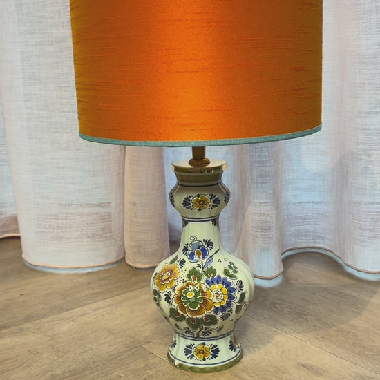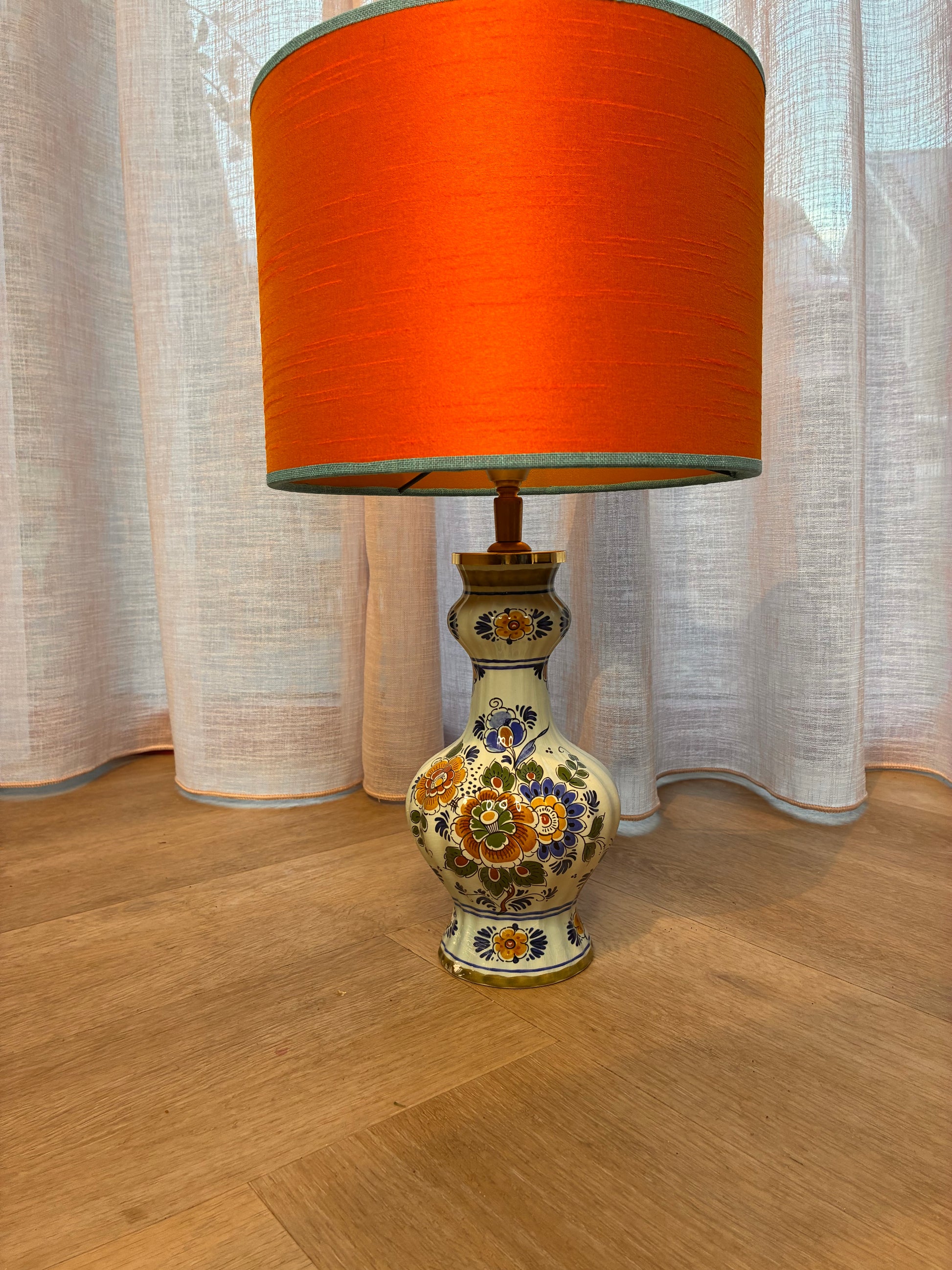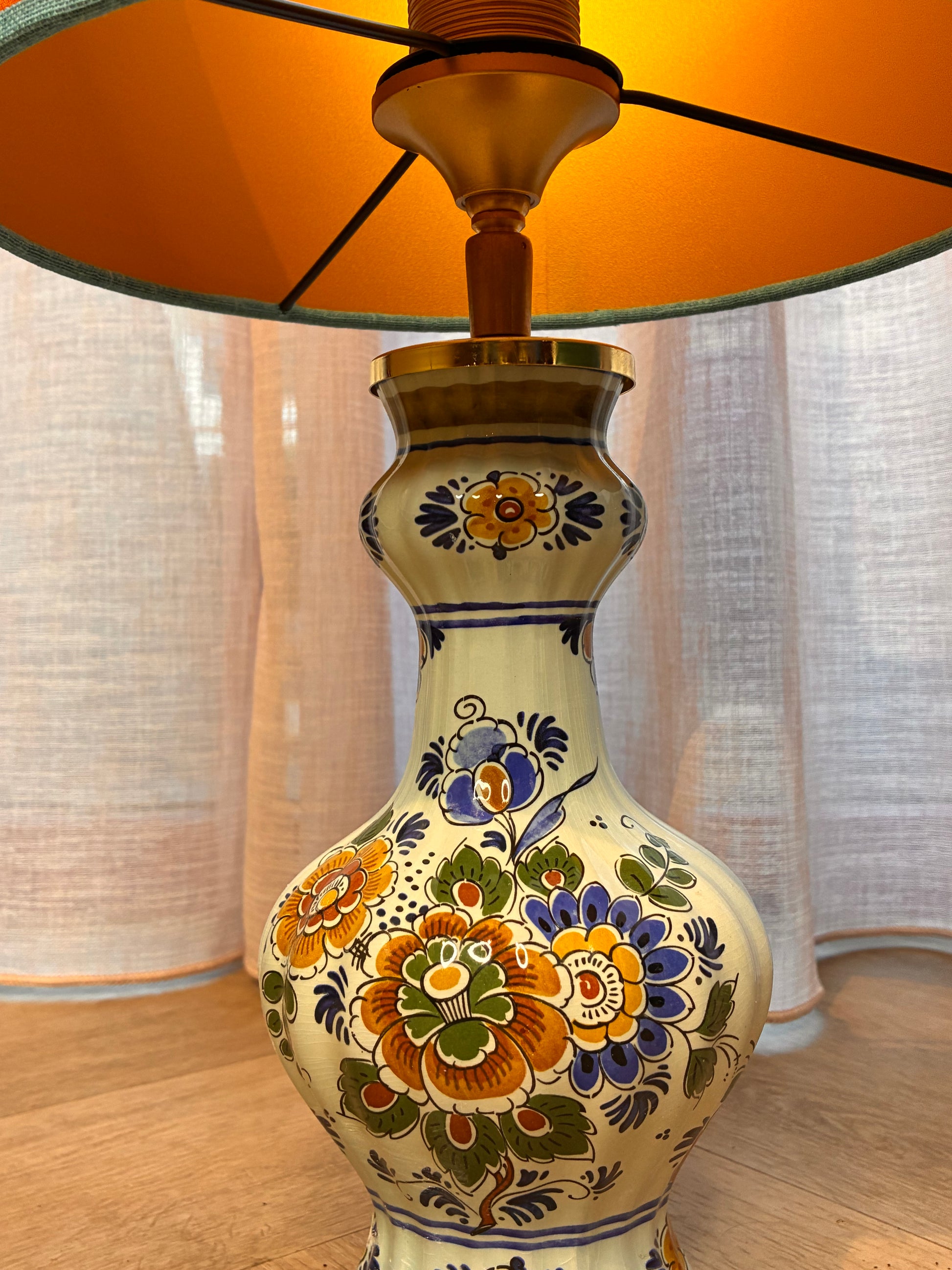 Deze Delftsblauwe lampenvoet heeft naast blauw ook groene en oranje of bruine kleuren; de basiskleur is wit. Hij is tot de fitting 25 cm hoog. Op de foto staat er op de voet een lampenkap met een doorsnee van 25 cm en hoogte van 18 cm. Dit maakt de set zoals op de foto 43 cm hoog.