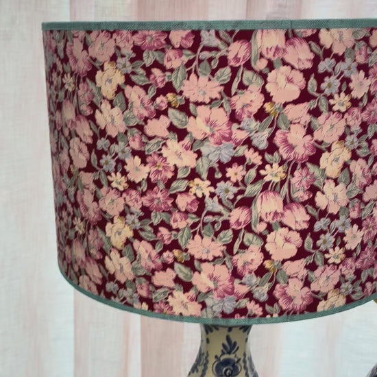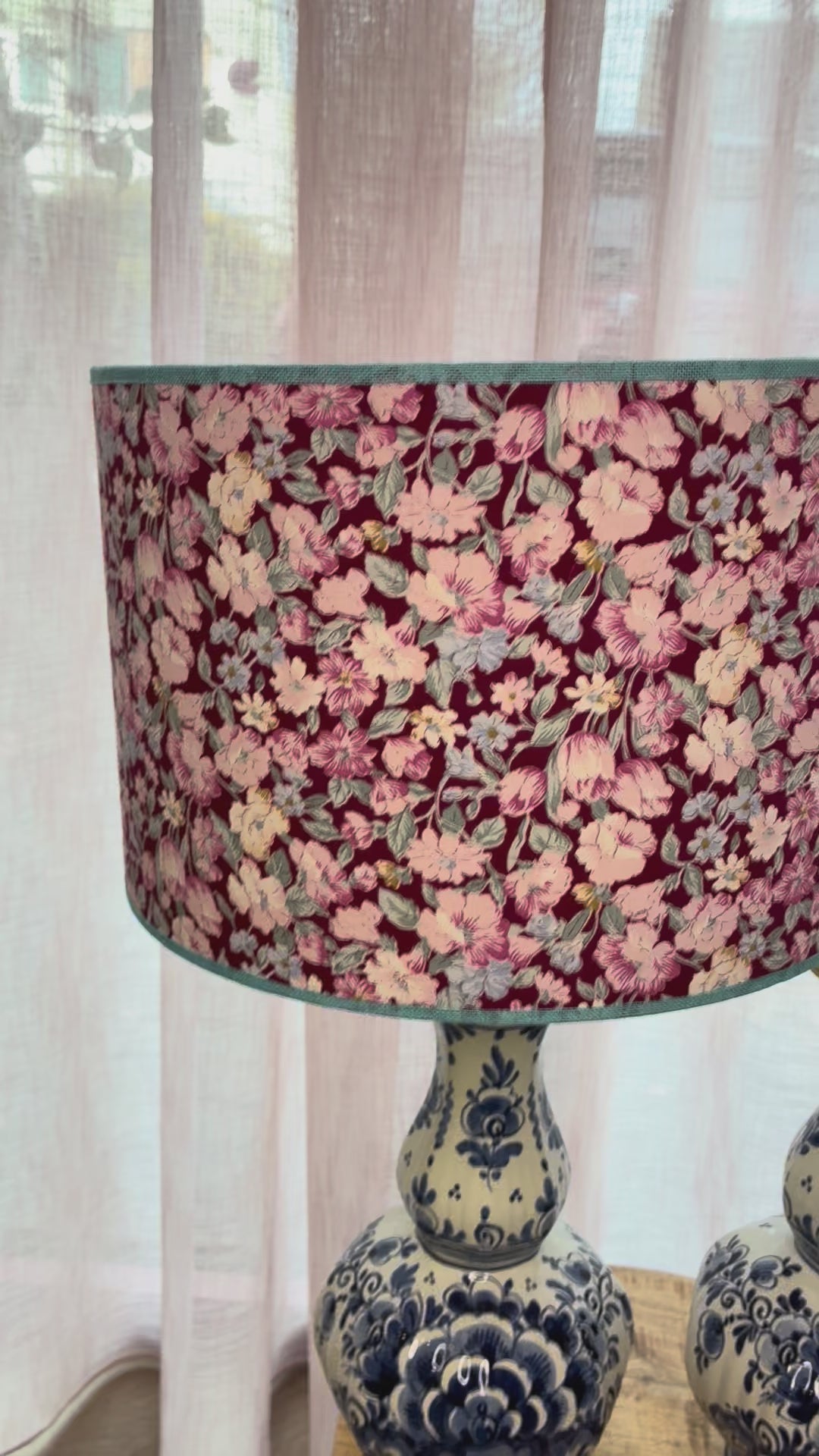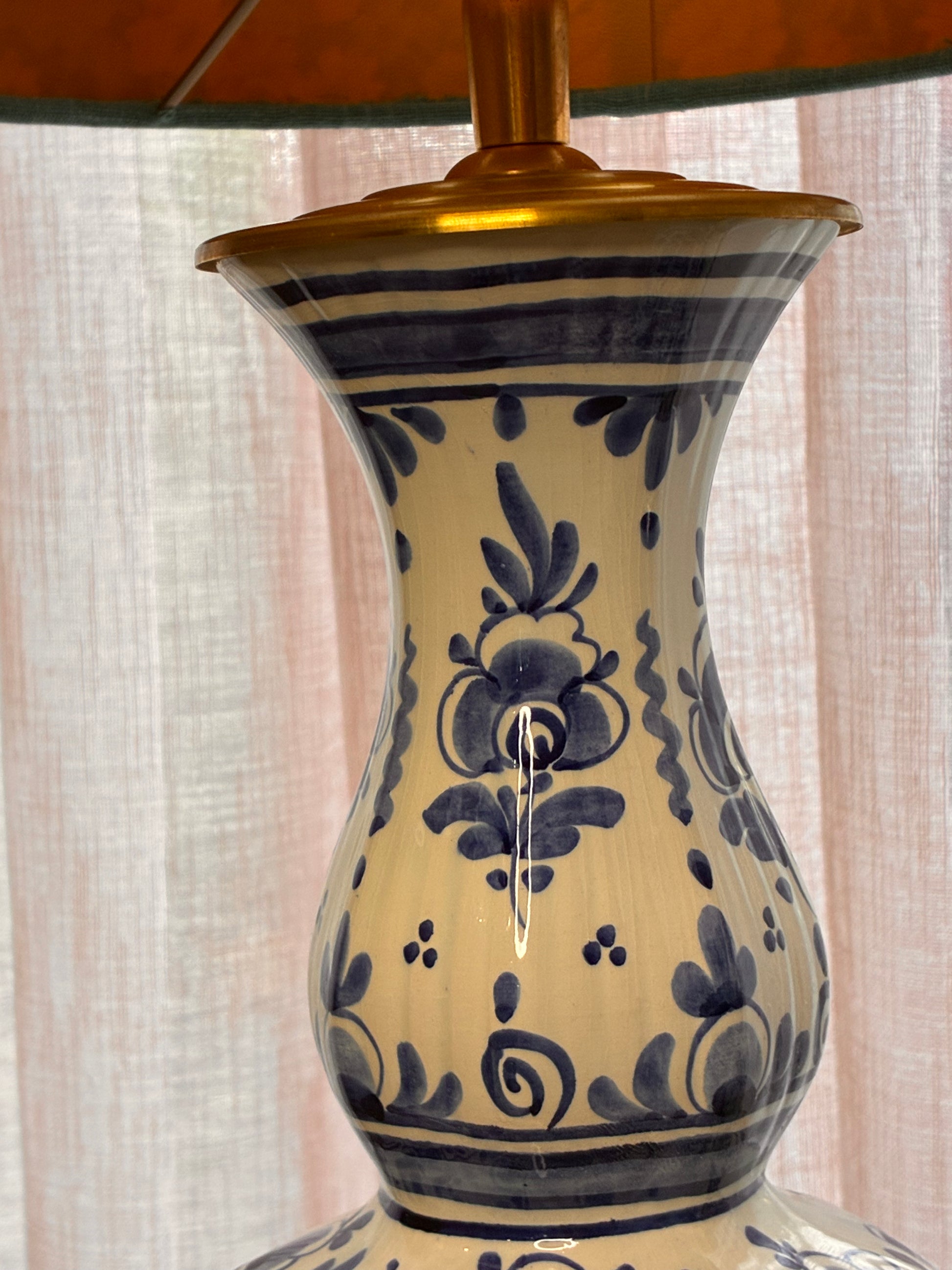 De lampenvoeten zijn gemaakt van twee mooie Delftsblauwe vazen en zijn tot de fitting 30 cm hoog. Op de eerste foto staat er een lampenkap op de rechter lampenvoet met een doorsnee van 30 cm en hoogte van 20 cm. De set is 50 cm hoog.