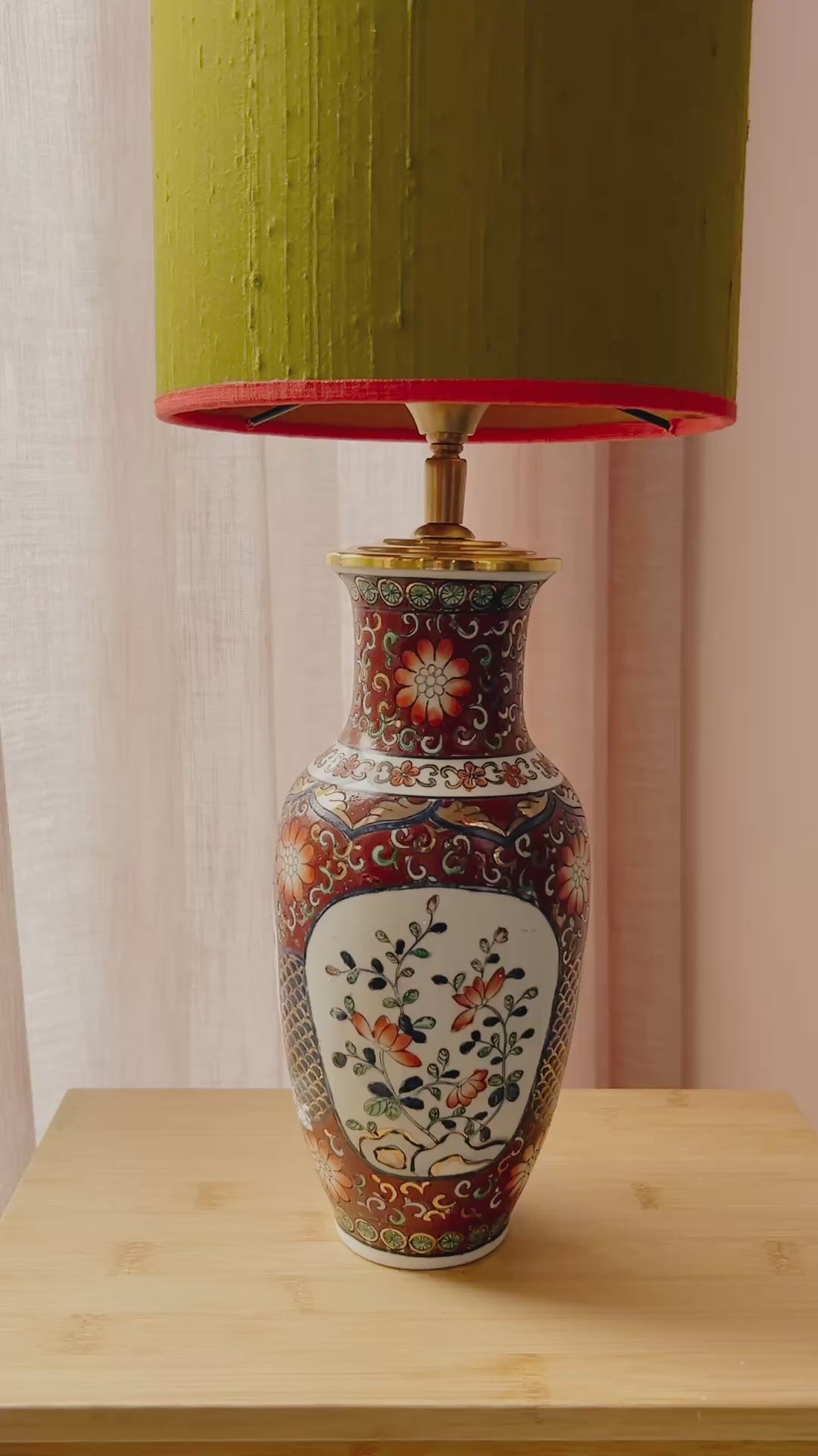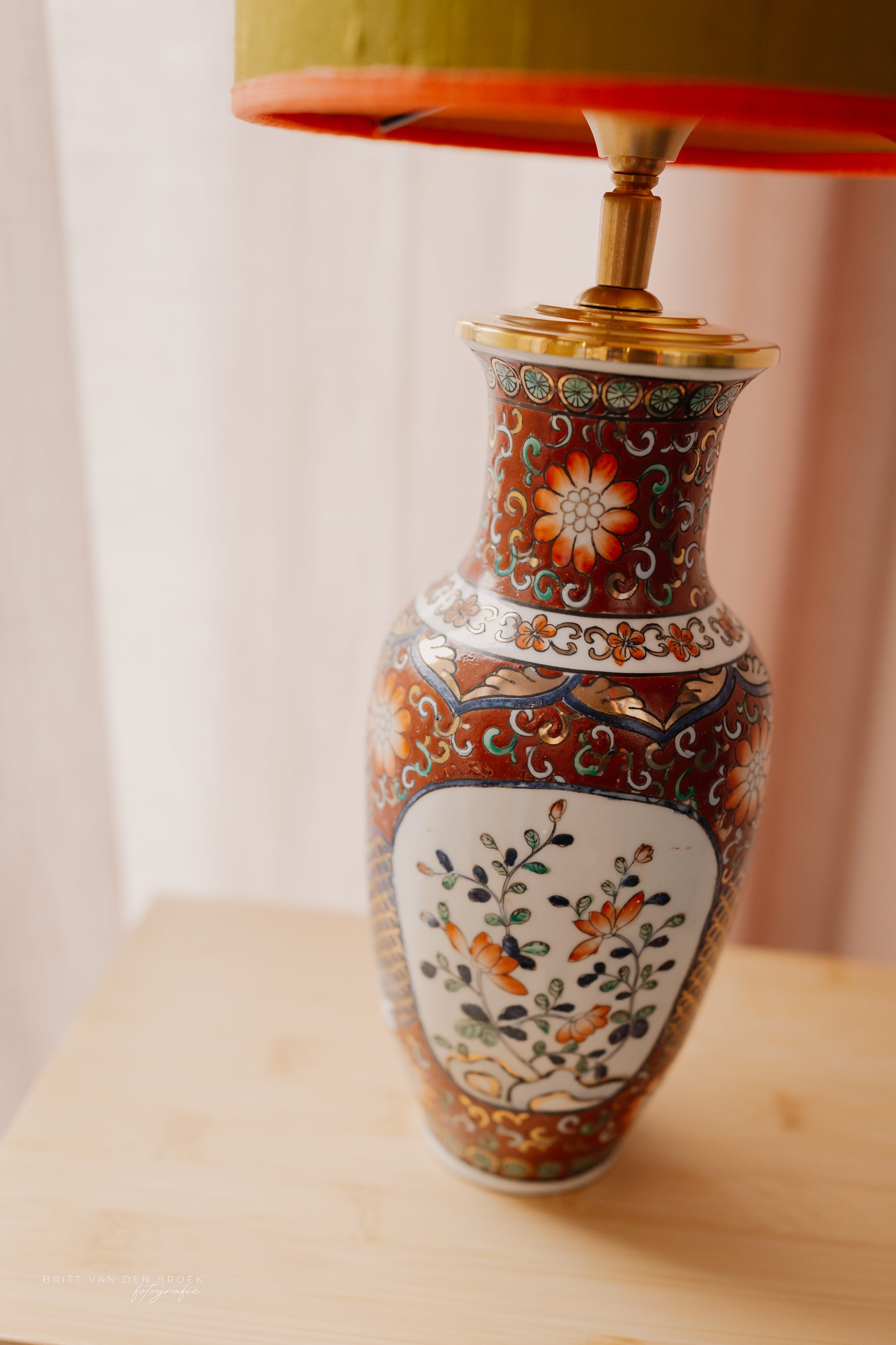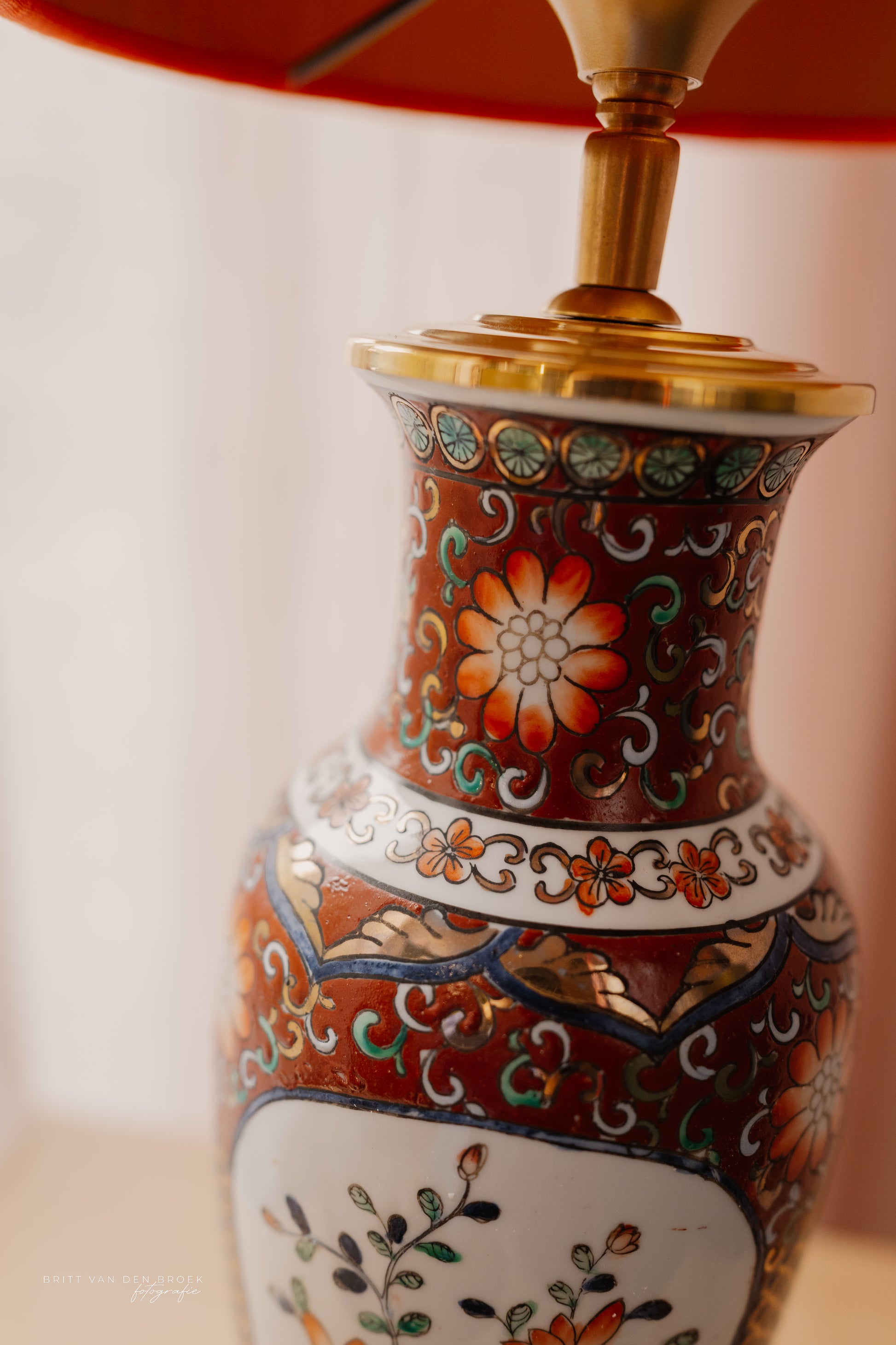 Deze lampenvoet is gemaakt van een donkerrode vaas met mooie details. Hij is tot de fitting 29 cm hoog. Op de foto's staat er op de lampenvoet een lampenkap met een doorsnee van 20 cm en hoogte van 22 cm. Dit maakt de set zoals op de foto 51 cm hoog.