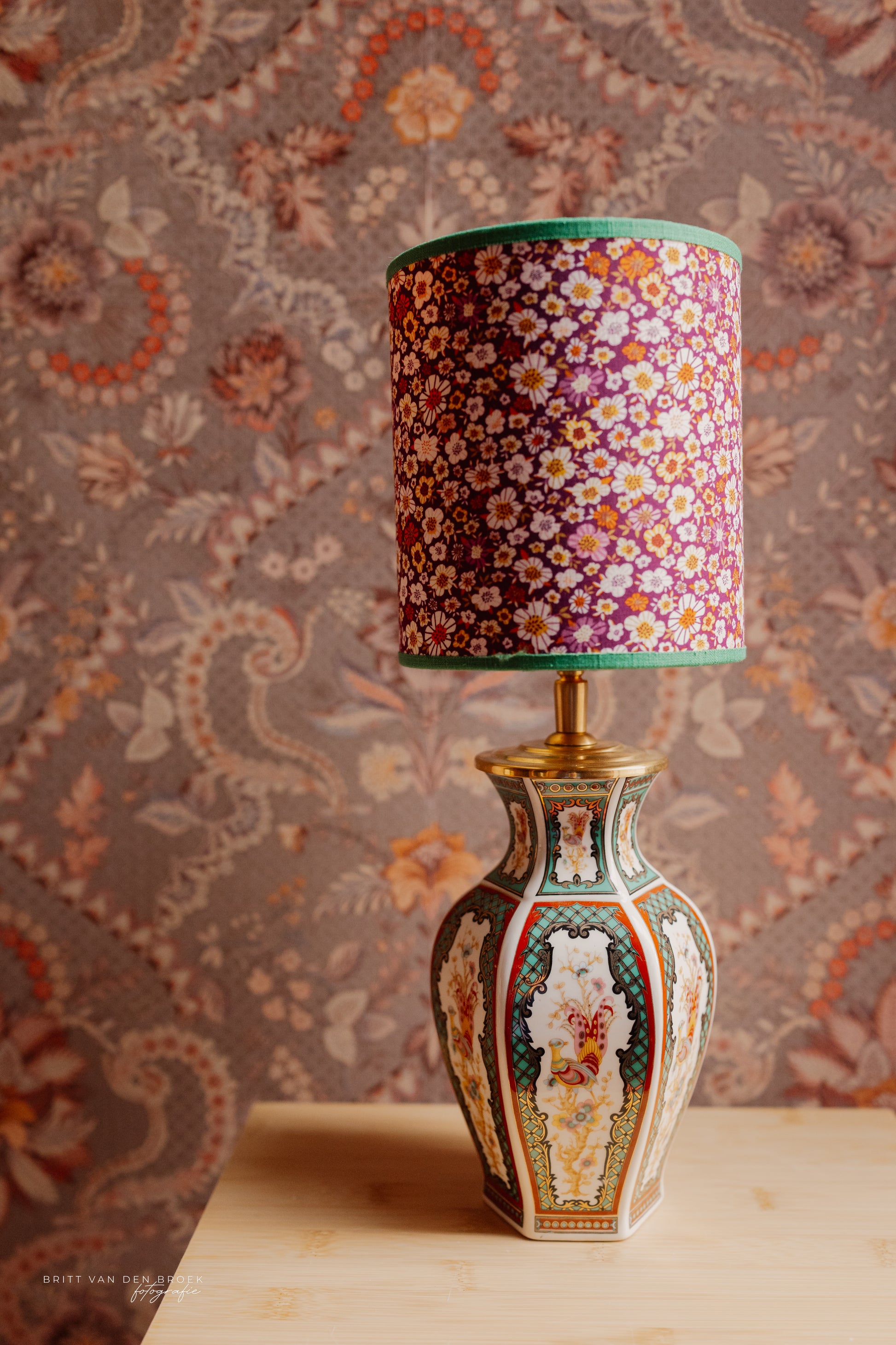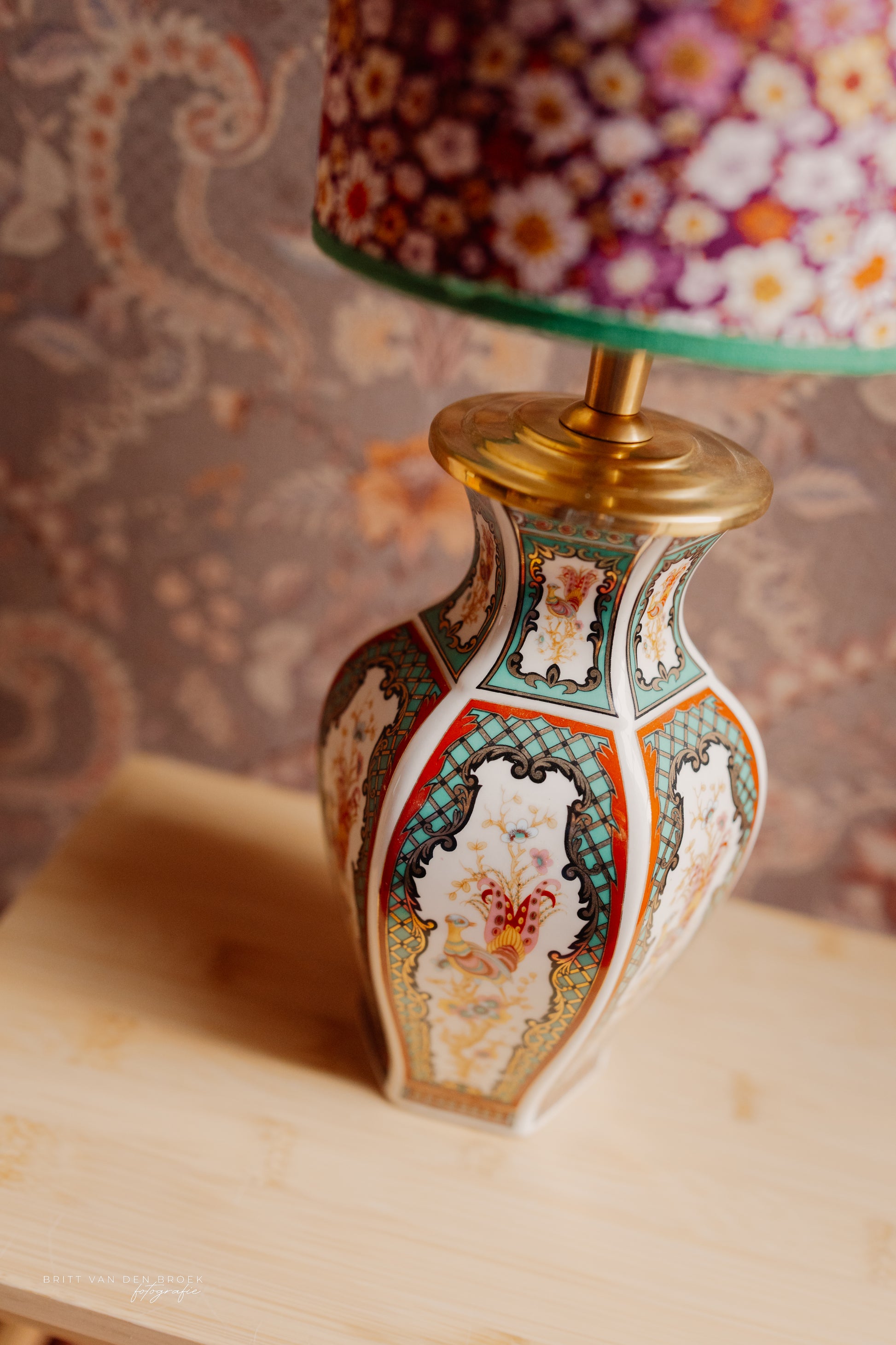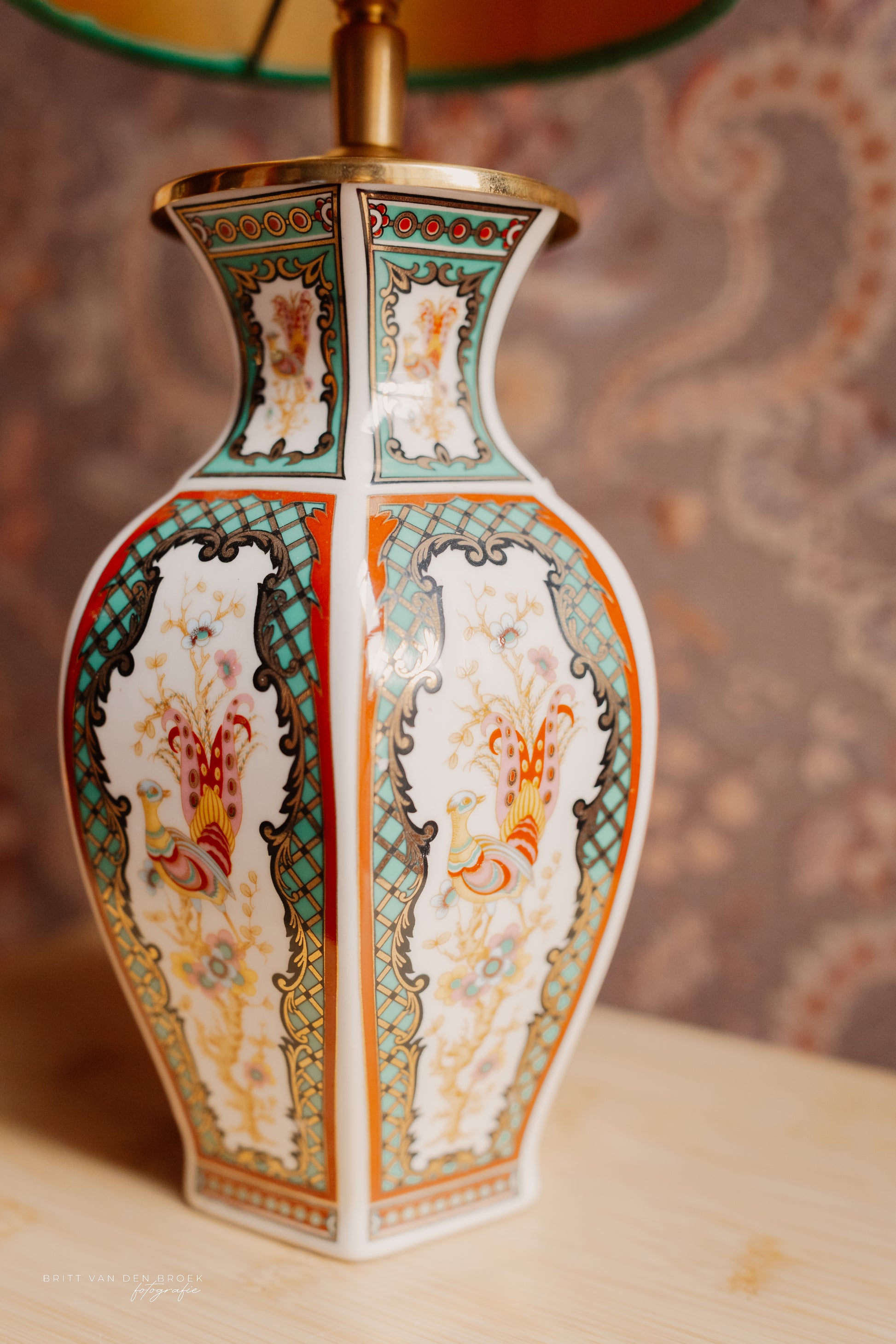 Deze lampenvoet is gemaakt van een Japanse vaas en is tot de fitting 24 cm hoog. De vaas heeft groene vlakken, en er staan pauwen op. Op de foto staat een lampenkap op de lampenvoet met een doorsnee van 15 cm en hoogte van 17 cm. De set zoals op de foto is 42 cm hoog. Een iets grotere kap met een doorsnee van 20 of 25 cm staat er ook erg leuk op.