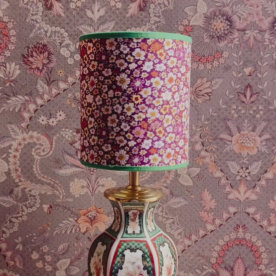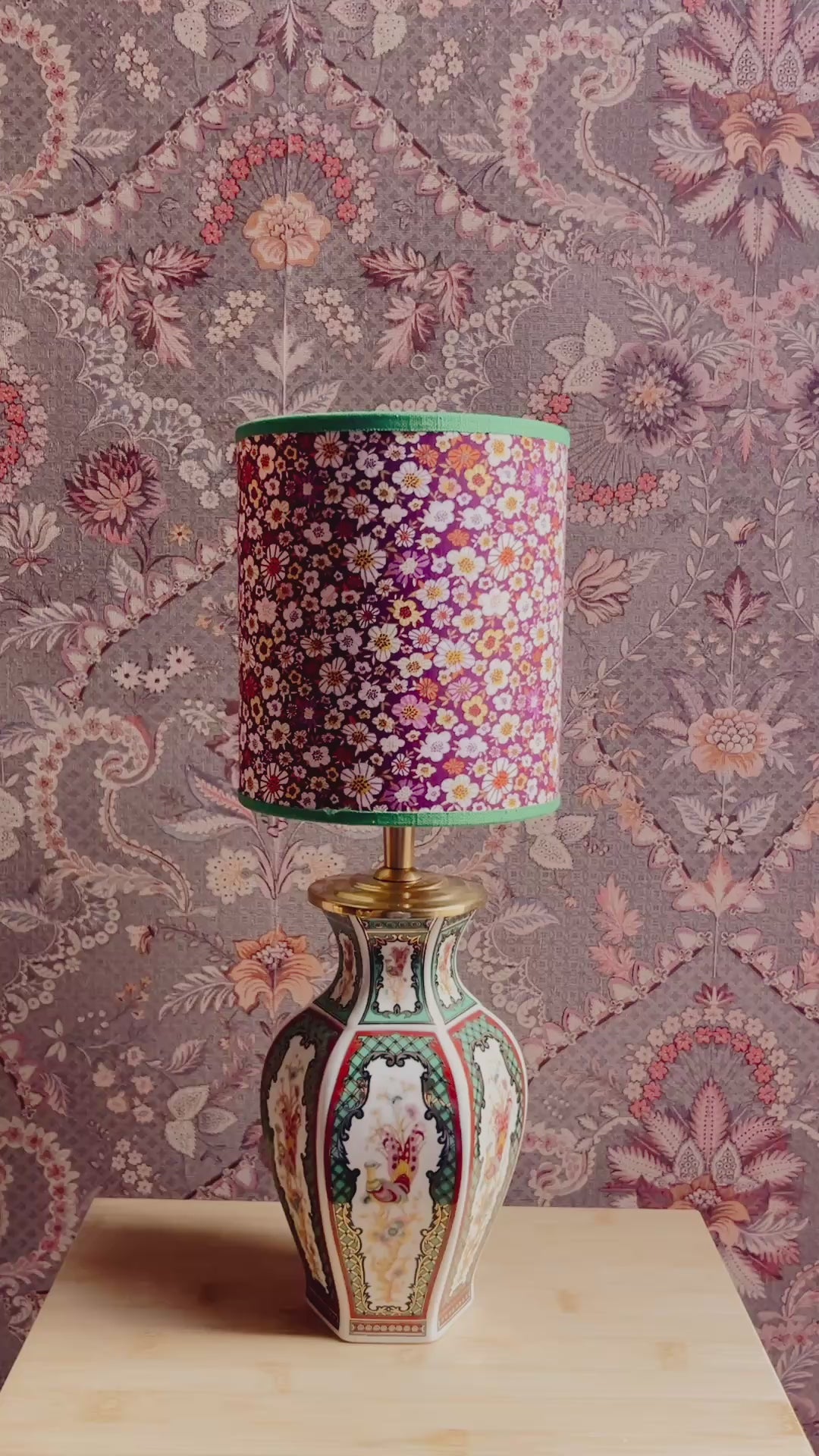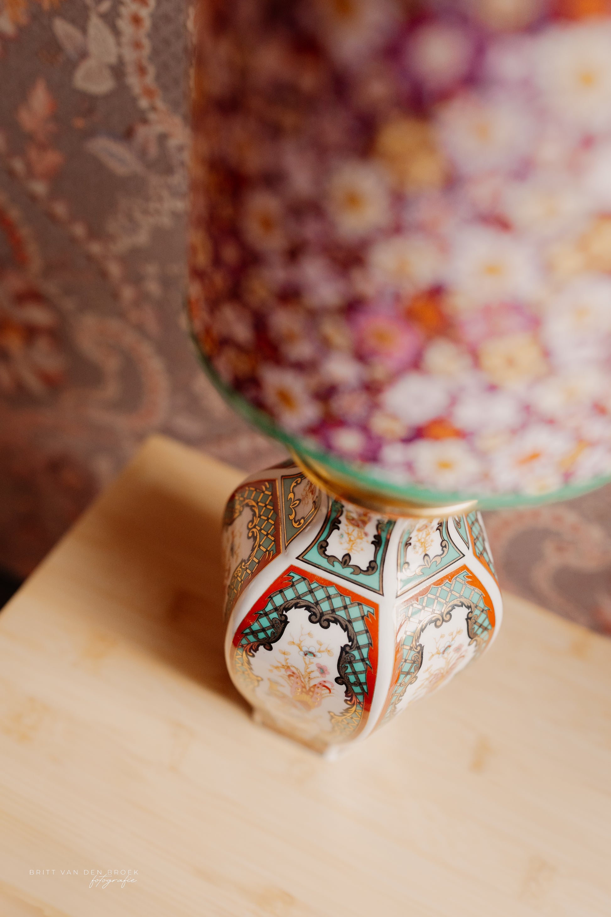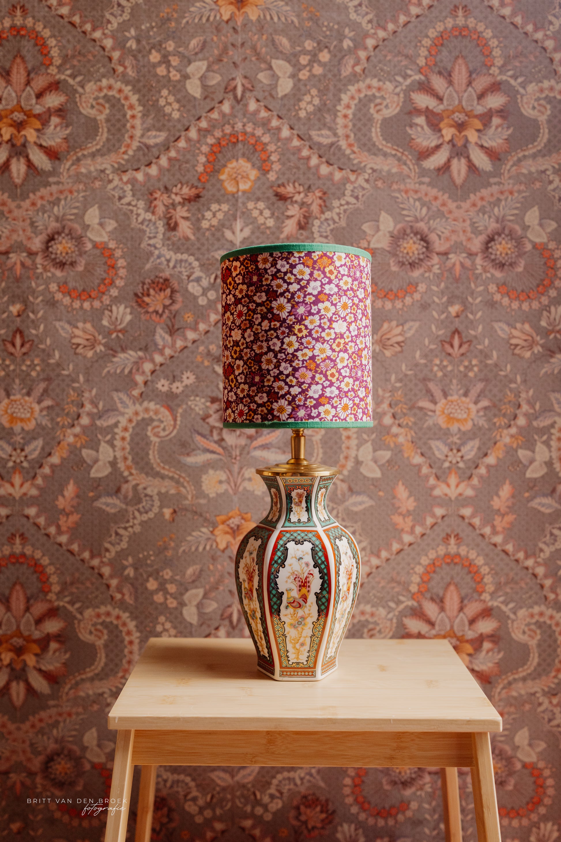 Deze lampenvoet is gemaakt van een Japanse vaas en is tot de fitting 24 cm hoog. De vaas heeft groene vlakken, en er staan pauwen op. Op de foto staat een lampenkap op de lampenvoet met een doorsnee van 15 cm en hoogte van 17 cm. De set zoals op de foto is 42 cm hoog. Een iets grotere kap met een doorsnee van 20 of 25 cm staat er ook erg leuk op.