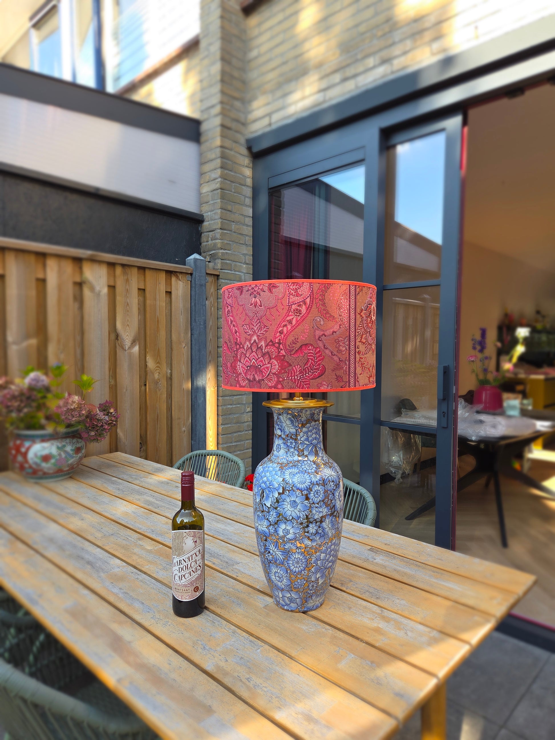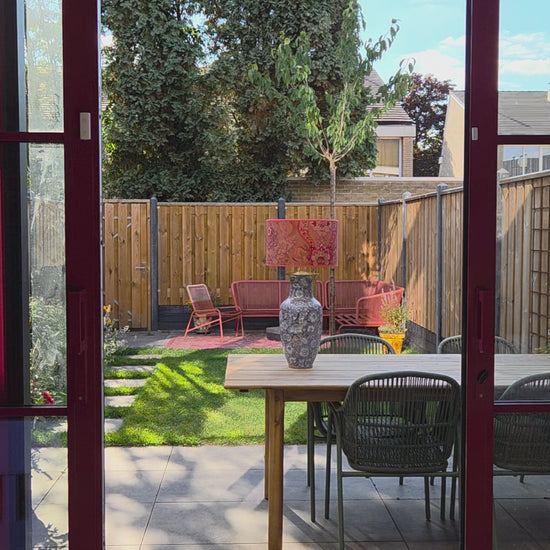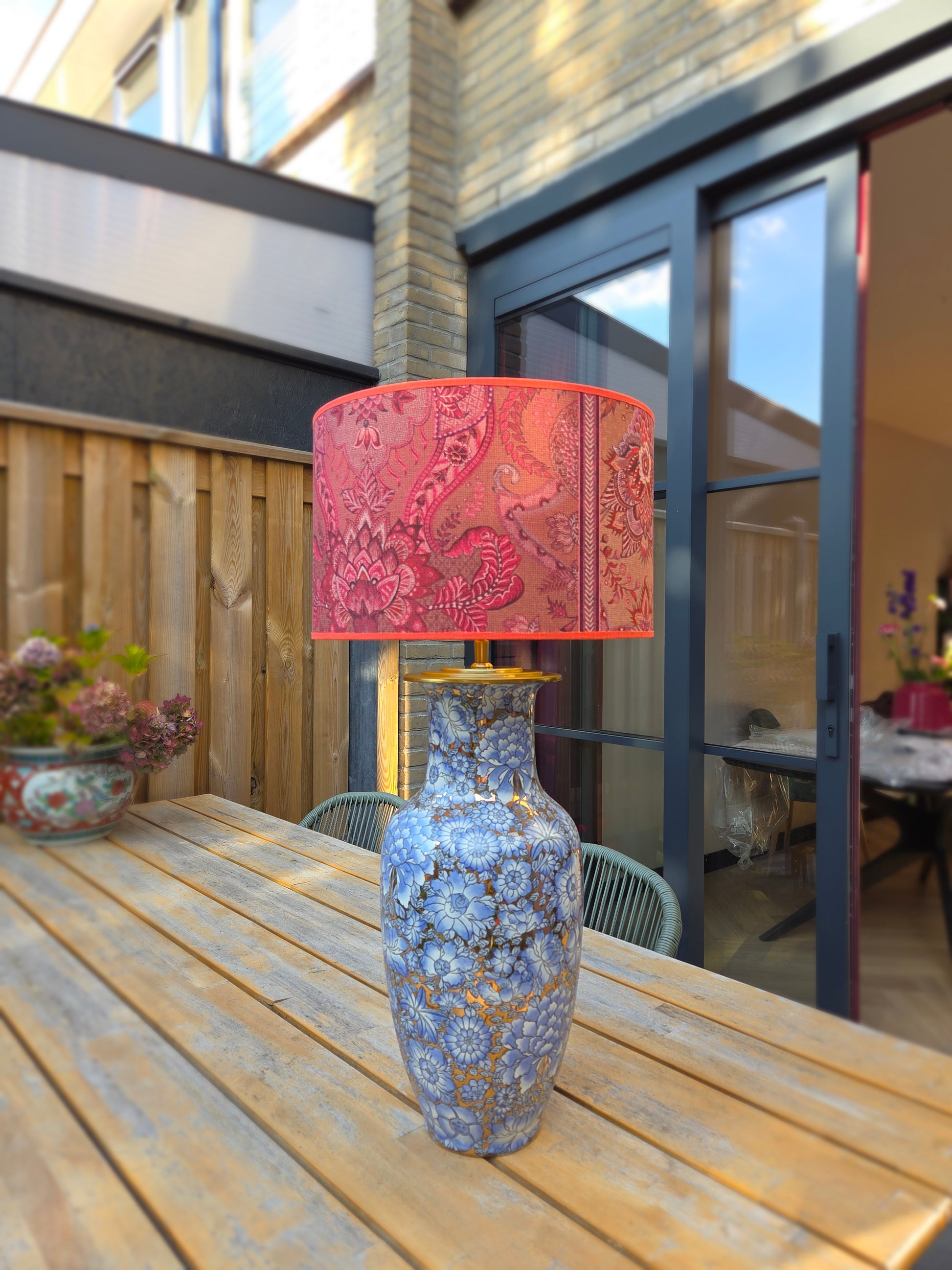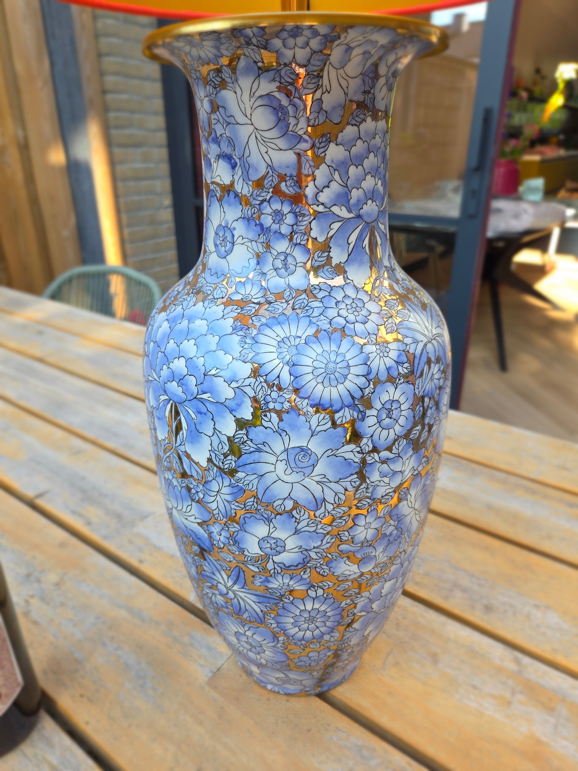 Deze grote lampenvoet heeft lila/lichtblauwe bloemen en glimt (zie filmpje). Hij is tot de fitting maar liefst 50 cm hoog. Op de foto staat er een lampenkap op de lampenvoet met een doorsnee van 35 cm en hoogte van 22 cm. De set zoals op de foto is 72 cm hoog.