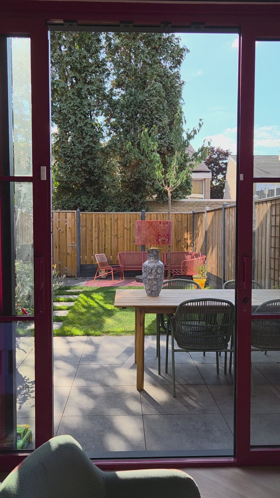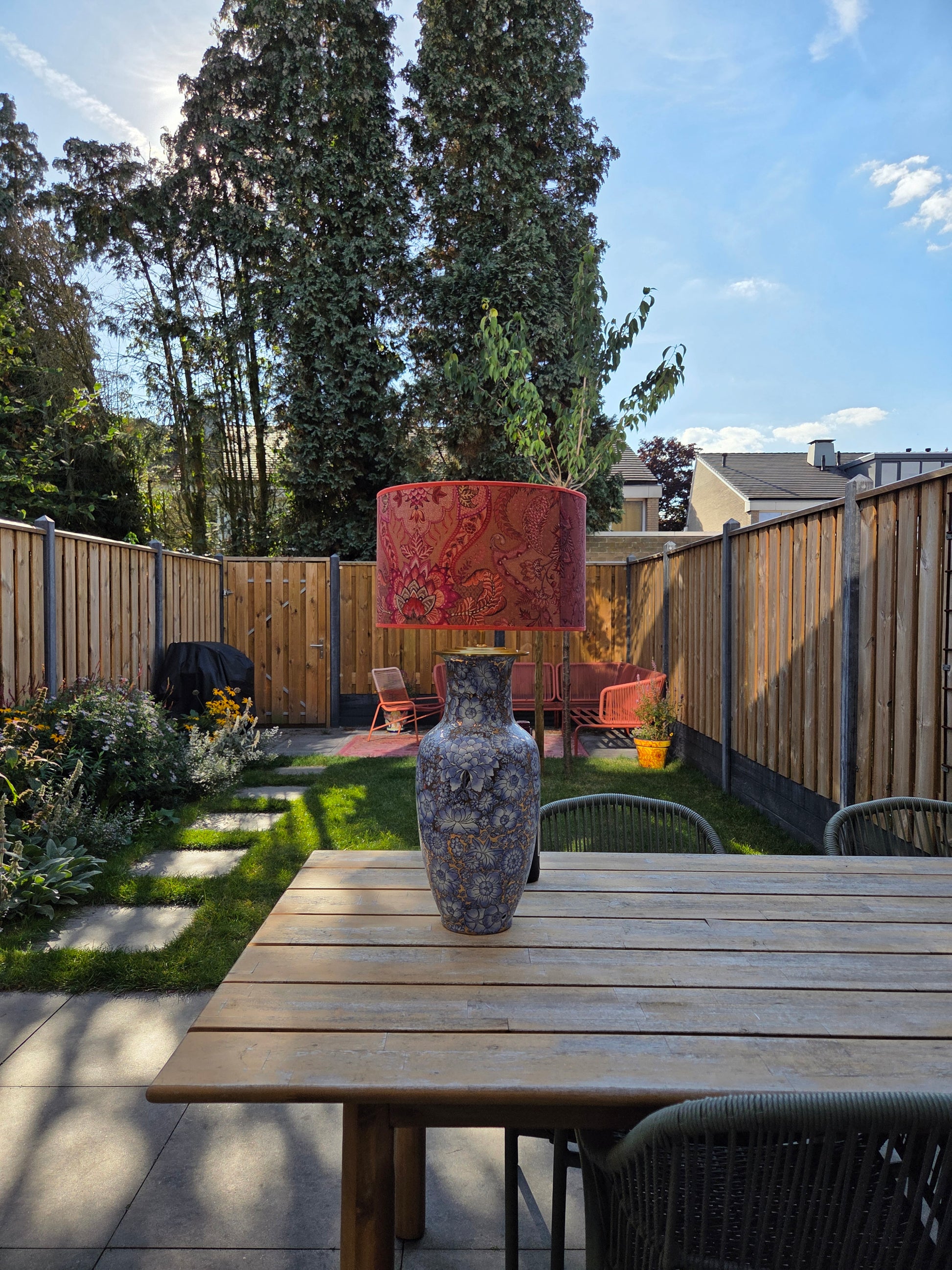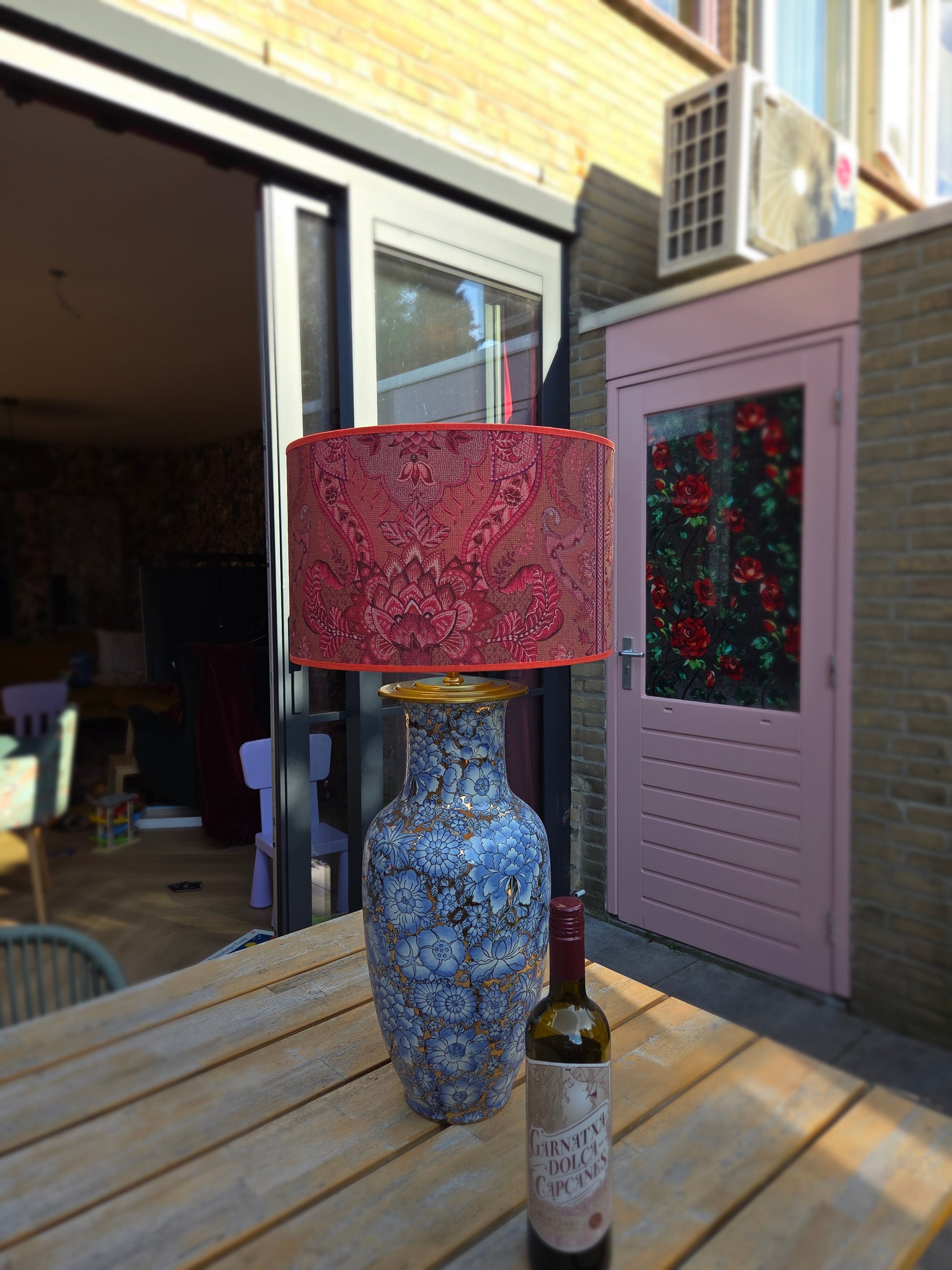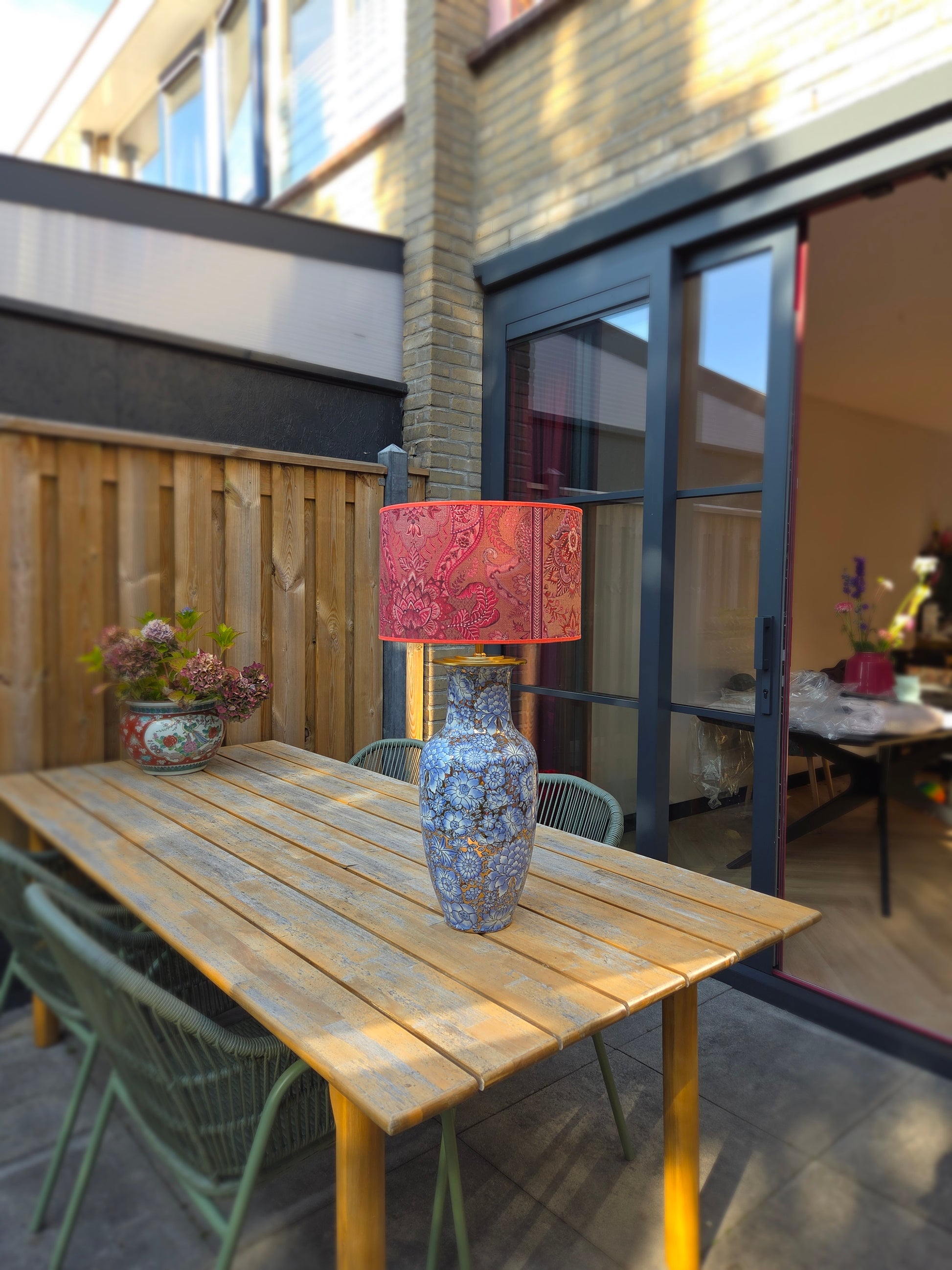 Deze grote lampenvoet heeft lila/lichtblauwe bloemen en glimt (zie filmpje). Hij is tot de fitting maar liefst 50 cm hoog. Op de foto staat er een lampenkap op de lampenvoet met een doorsnee van 35 cm en hoogte van 22 cm. De set zoals op de foto is 72 cm hoog.