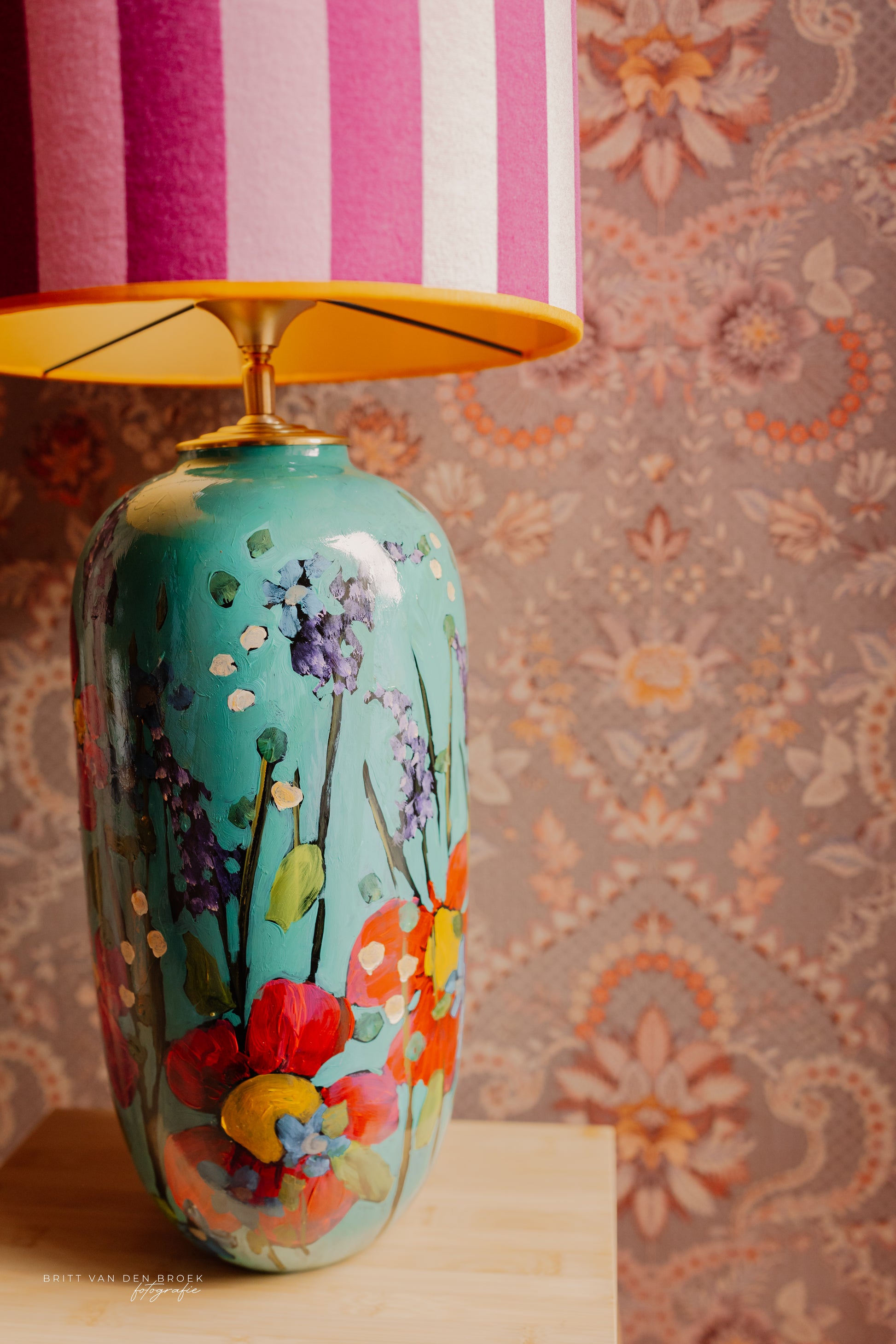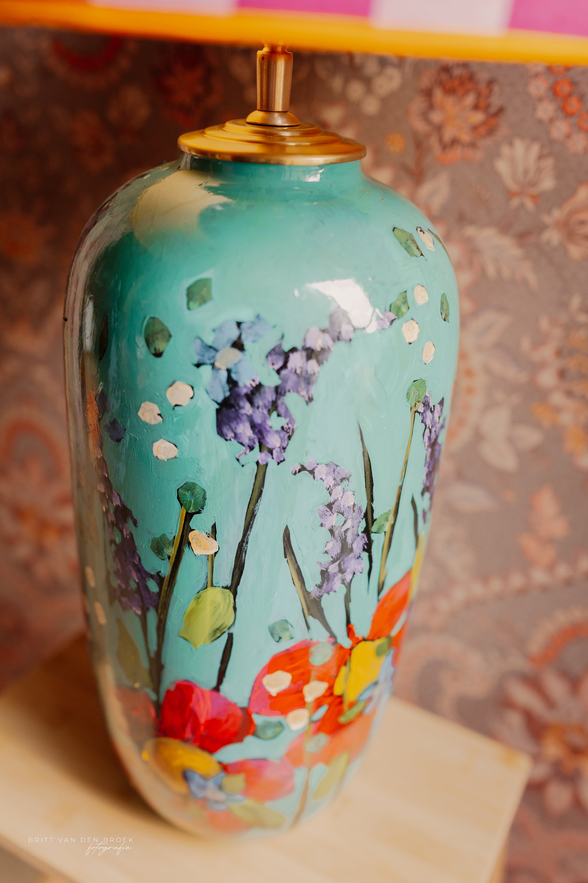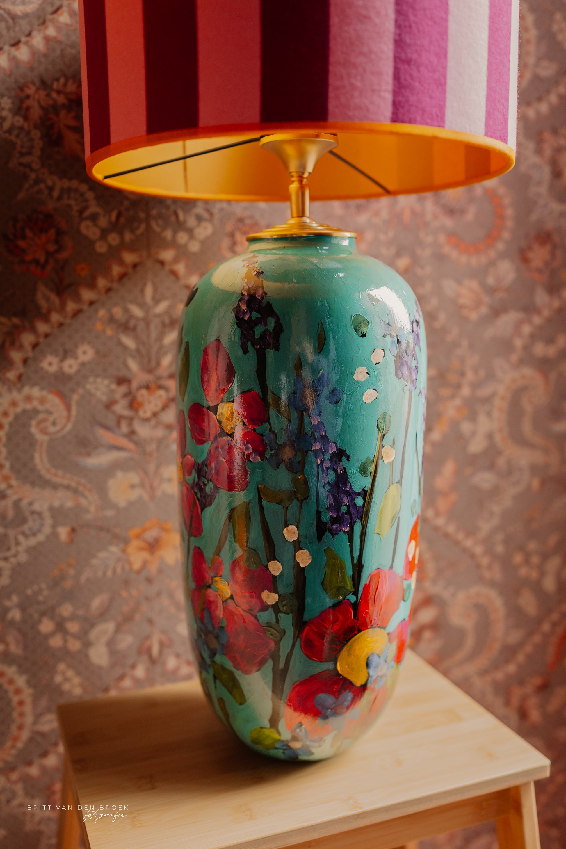 Deze turquoise lampenvoet is handgeschilderd door By Mariel en is 44 cm hoog tot de fitting. Op de lampenvoet staan bloemen en bladeren in verschillende kleuren. Op de foto staat er op de lampenvoet een lampenkap met een doorsnee van 30 cm en hoogte van 20 cm. De set zoals op de foto is 64 cm hoog.
