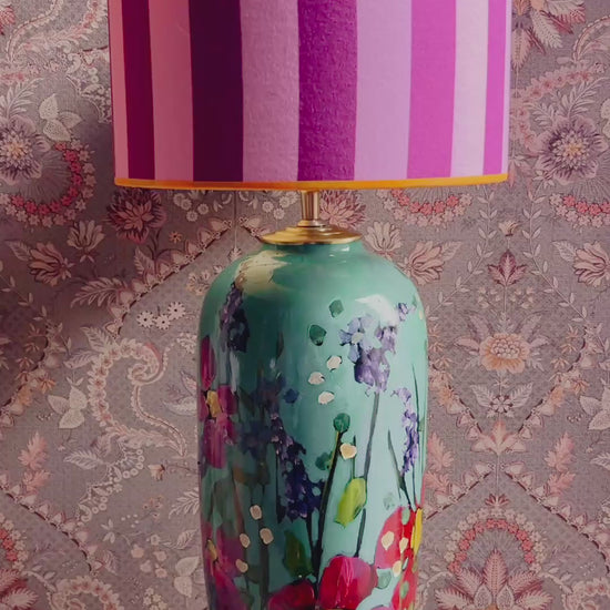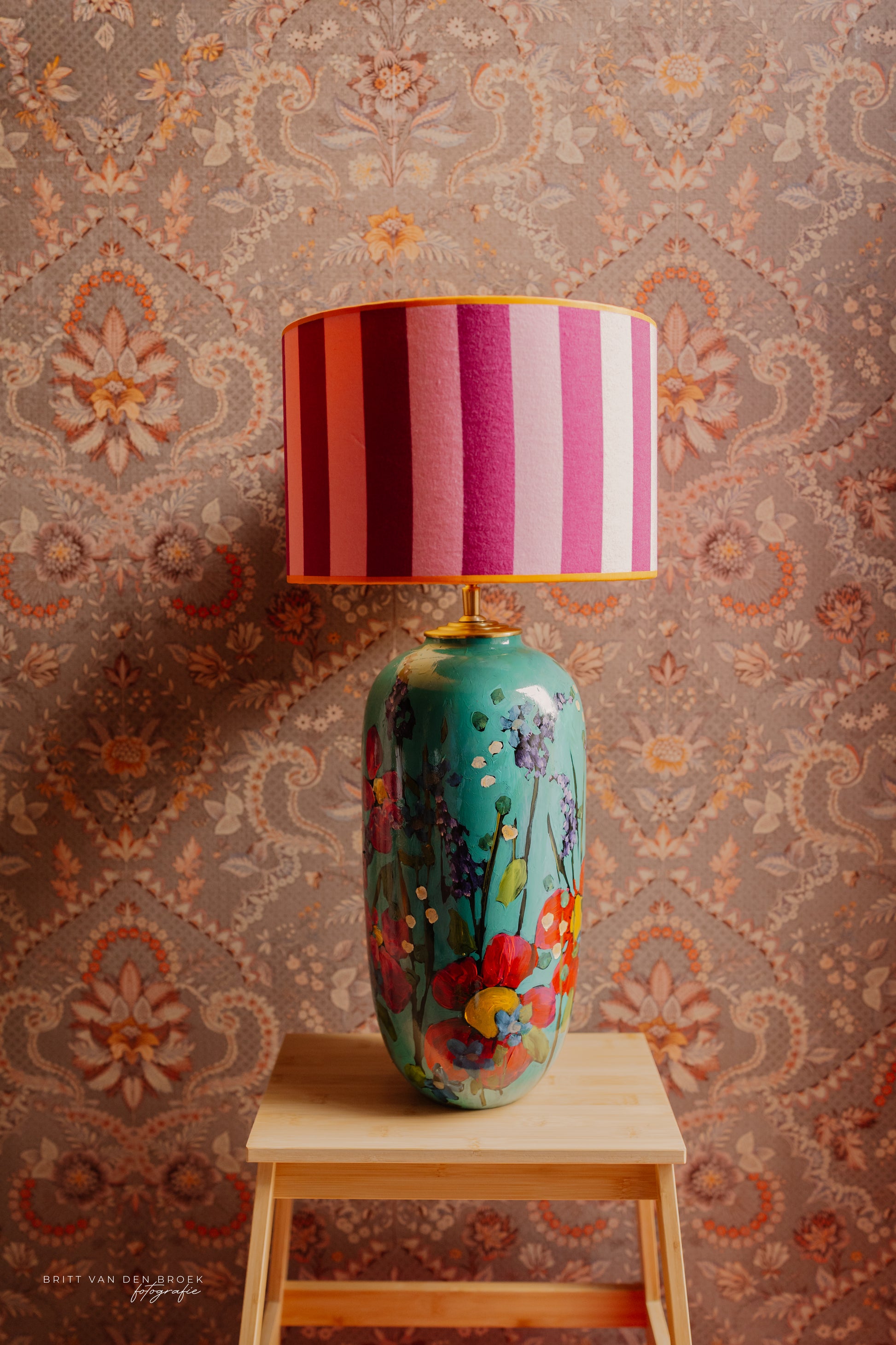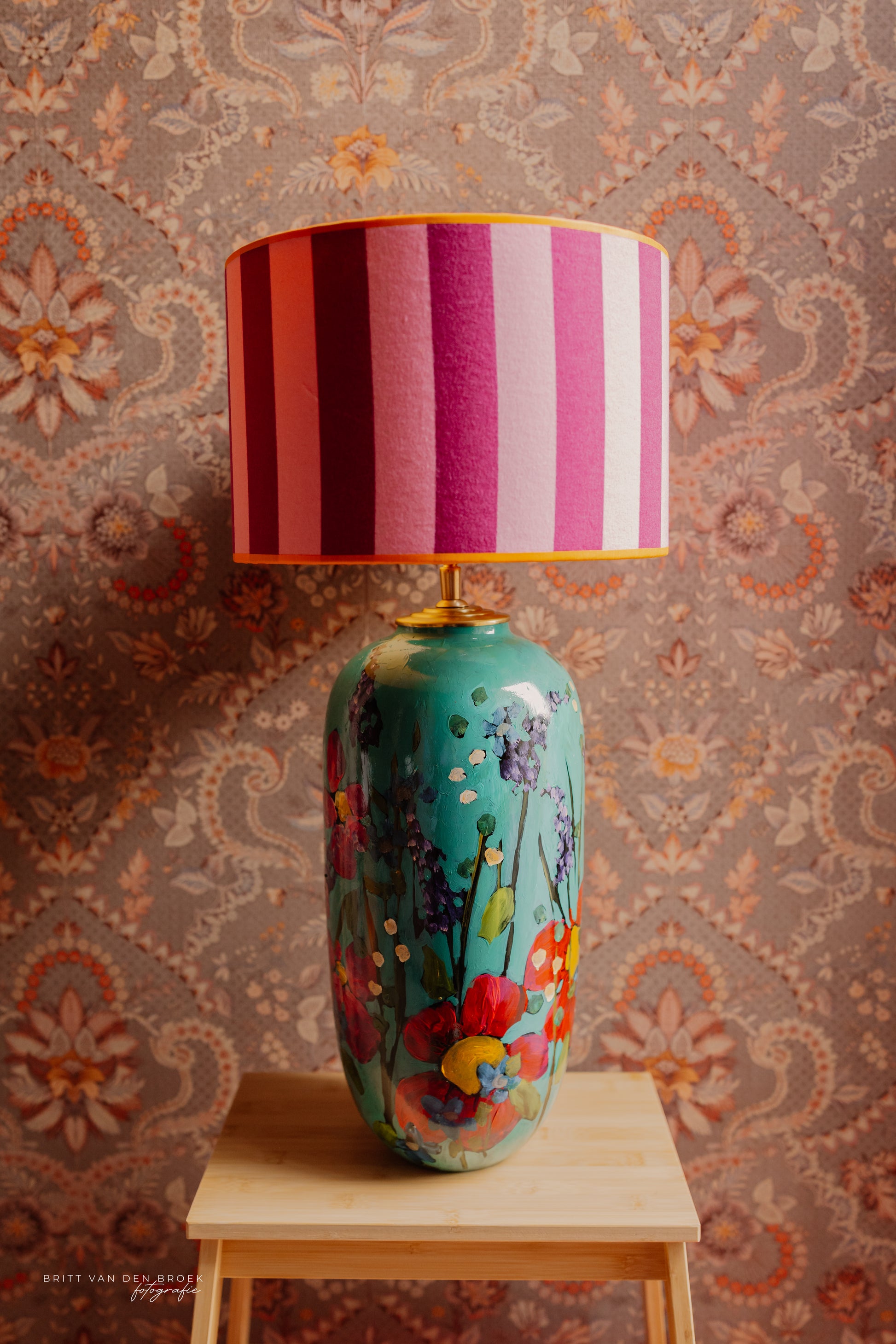 Deze turquoise lampenvoet is handgeschilderd door By Mariel en is 44 cm hoog tot de fitting. Op de lampenvoet staan bloemen en bladeren in verschillende kleuren. Op de foto staat er op de lampenvoet een lampenkap met een doorsnee van 30 cm en hoogte van 20 cm. De set zoals op de foto is 64 cm hoog.