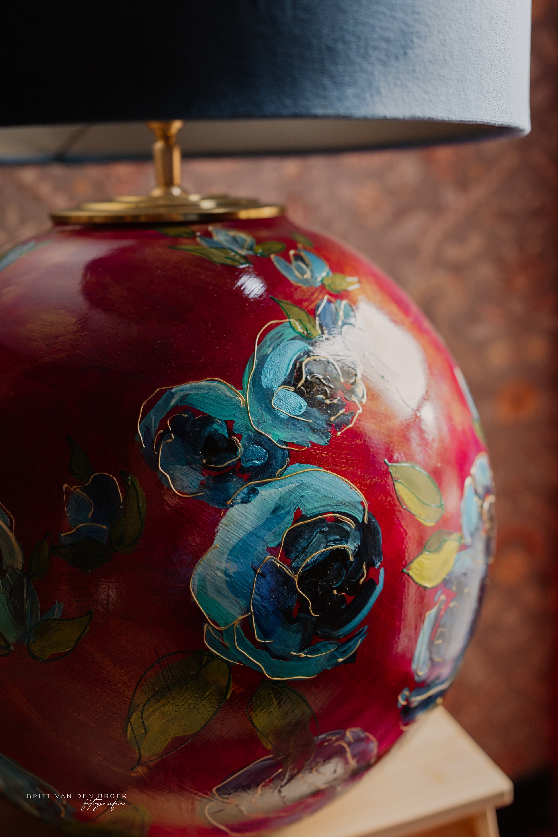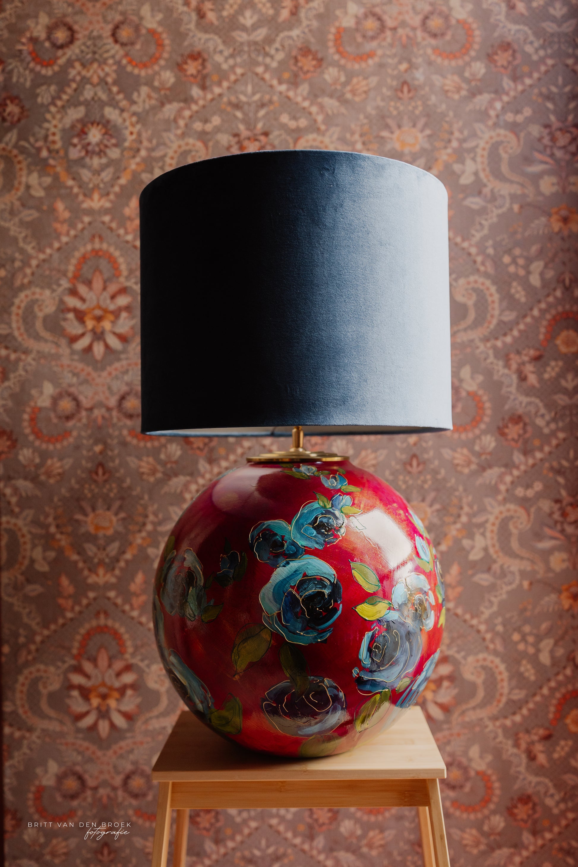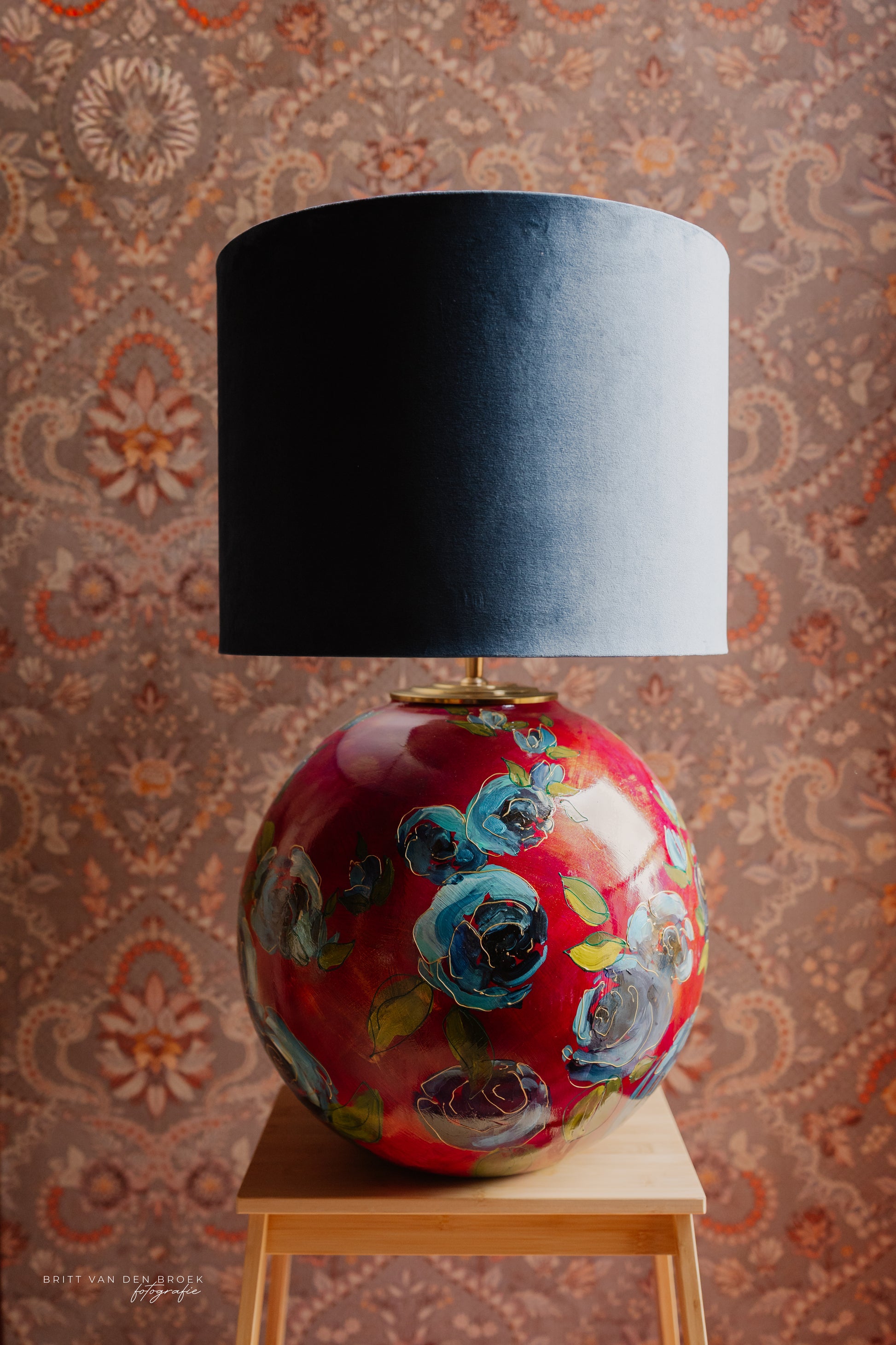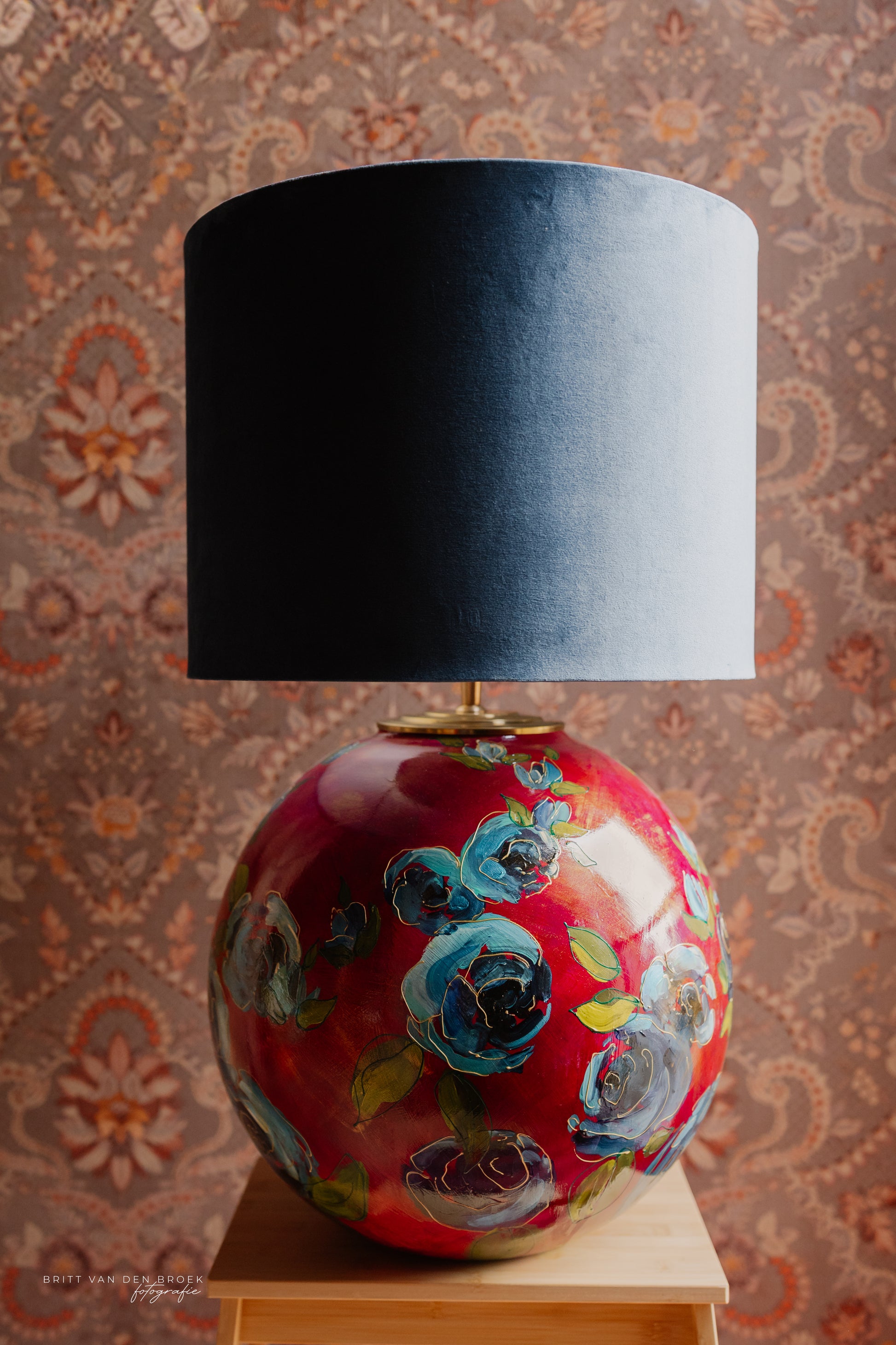Deze donkerroze lampenvoet is handgeschilderd door By Mariel en is 43 cm hoog tot de fitting. Op de lampenvoet staan blauwe bloemen en groene bladeren. Op de foto staat er op de lampenvoet een lampenkap met een doorsnee van 40 cm en hoogte van 30 cm. De set zoals op de foto is 73 cm hoog.