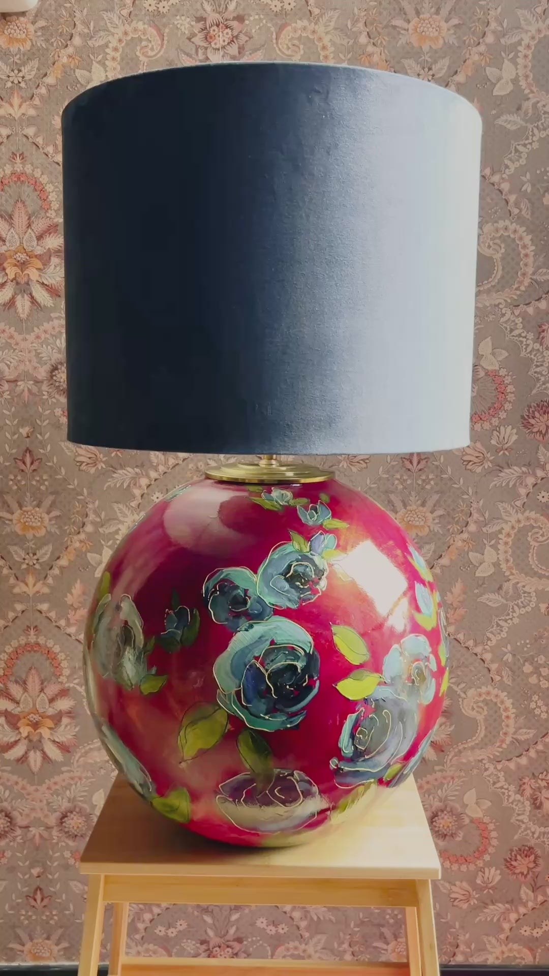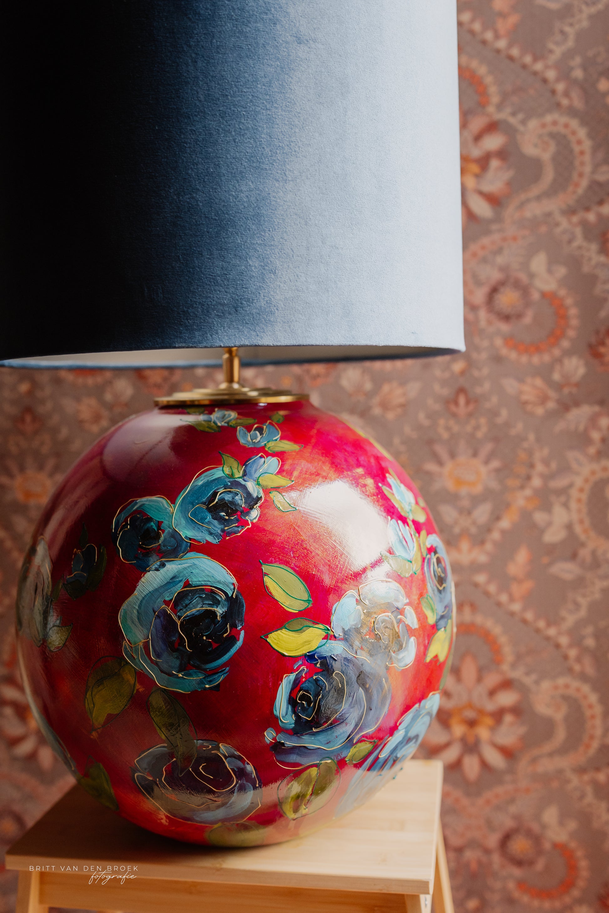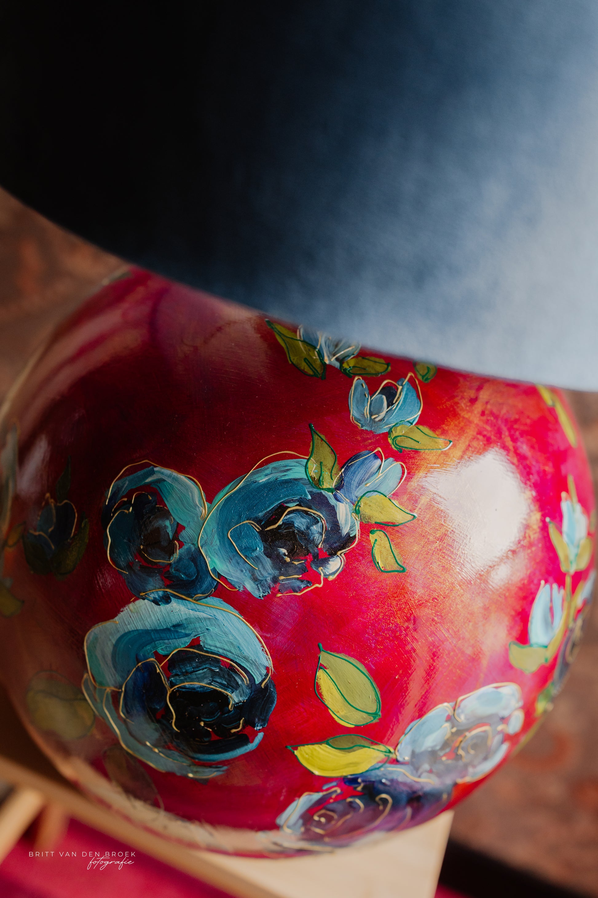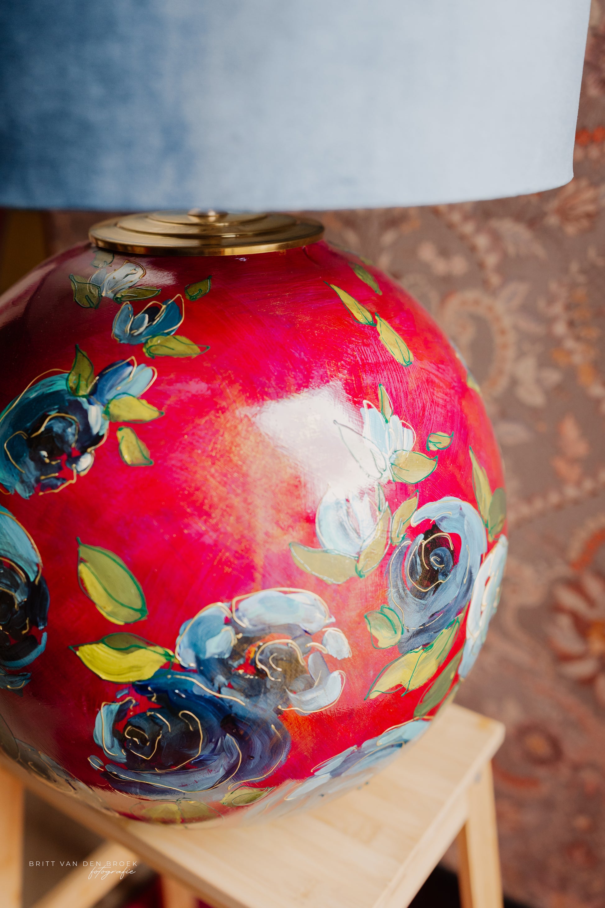 Deze donkerroze lampenvoet is handgeschilderd door By Mariel en is 43 cm hoog tot de fitting. Op de lampenvoet staan blauwe bloemen en groene bladeren. Op de foto staat er op de lampenvoet een lampenkap met een doorsnee van 40 cm en hoogte van 30 cm. De set zoals op de foto is 73 cm hoog.