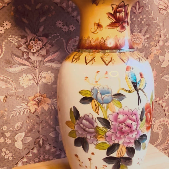 De lampenvoet is gemaakt van een grote witte vaas en is tot de fitting 40 cm hoog. Hij heeft oranje/bruine vlakken en een tekening met bloemen en vogels, afgemaakt met gouden lijntjes. Op de foto staat er een lampenkap op de lampenvoet met een doorsnee van 30 cm en hoogte van 19 cm. De set is 59 cm hoog.