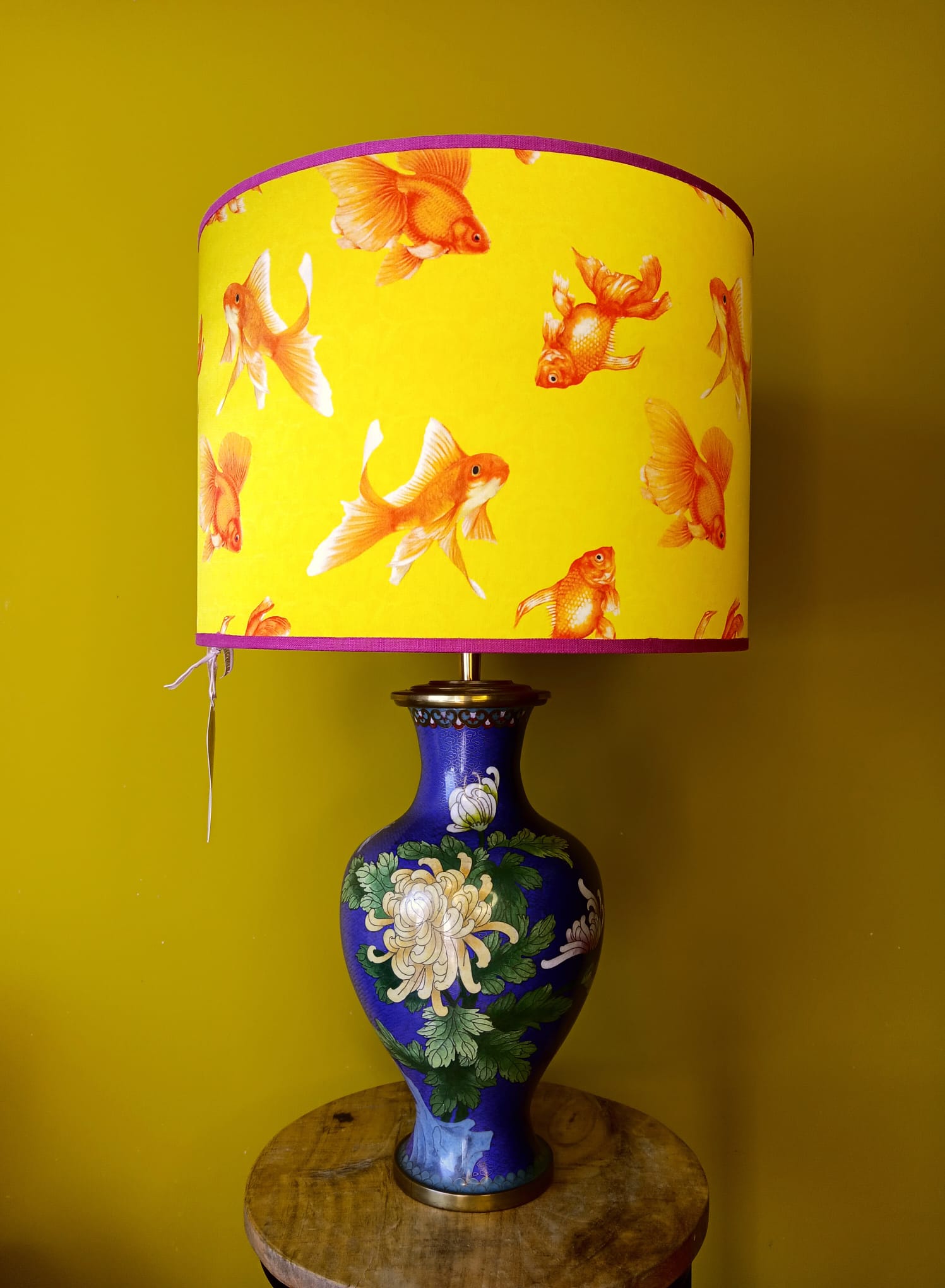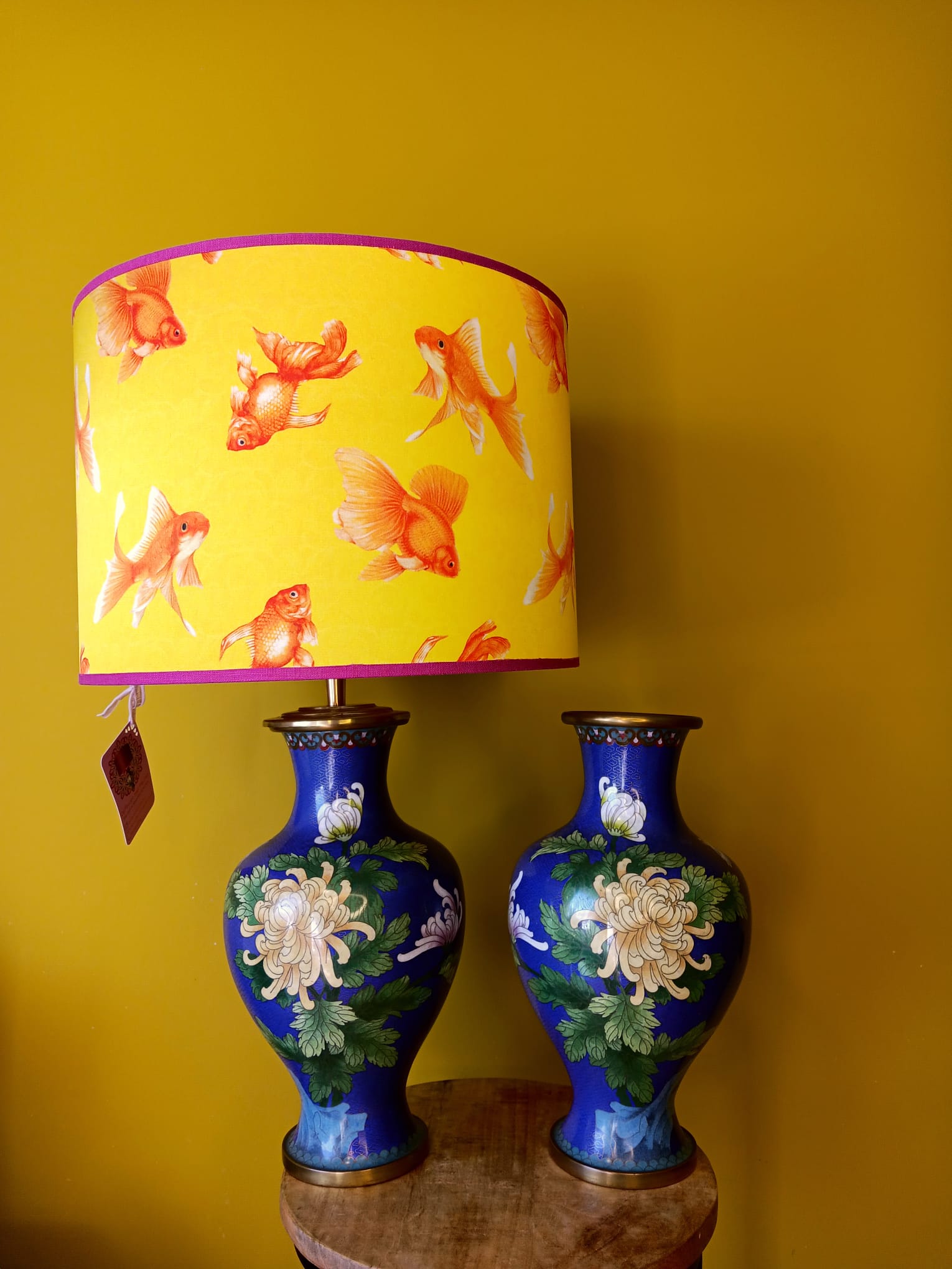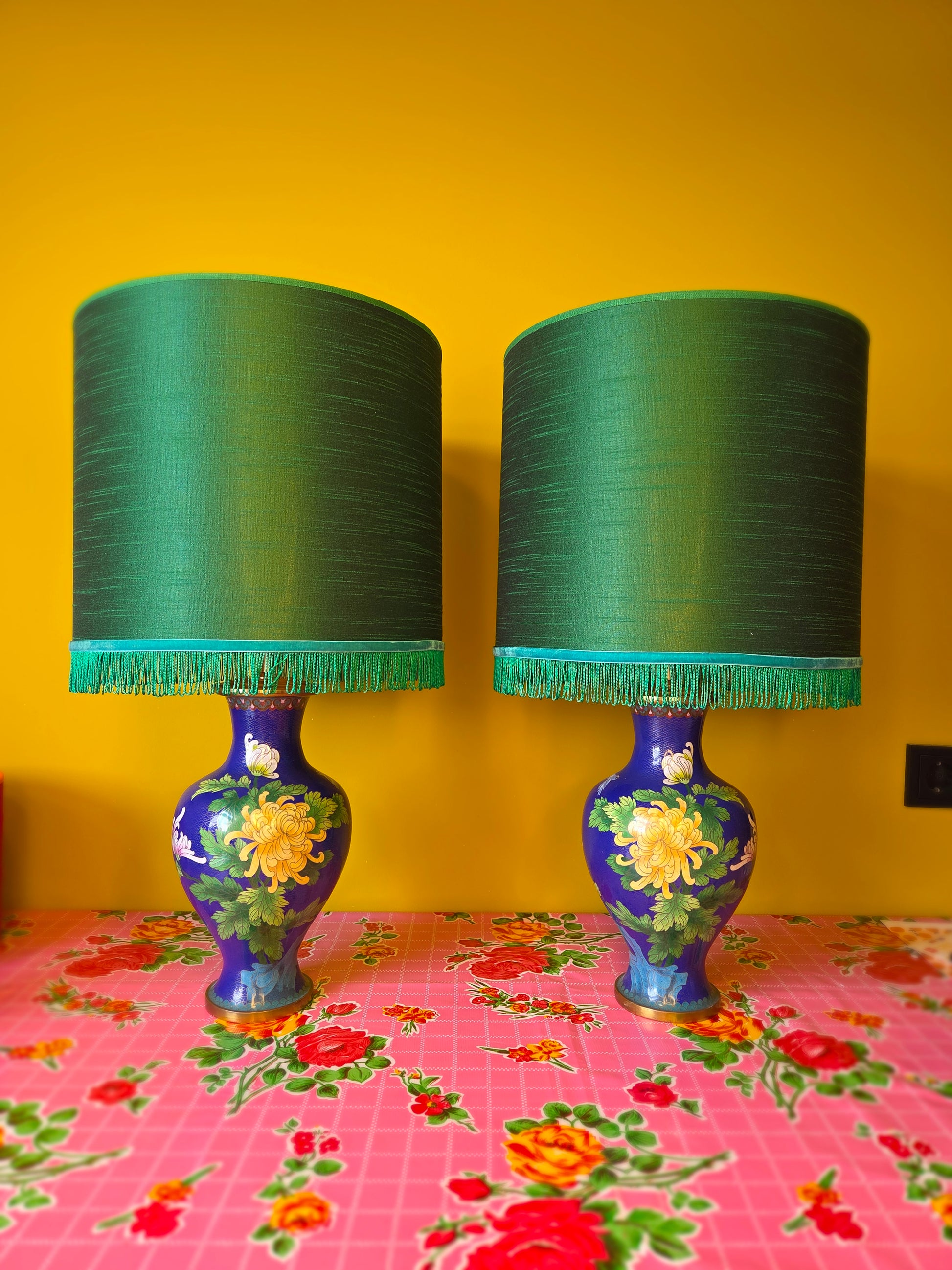 De lampenvoeten zijn gemaakt van twee grote cloisonné-vazen en zijn tot de fitting 35 cm hoog. Ze zijn koningsblauw met gele en lichtroze bloemen, en blauwe vogels en water. De afbeeldingen op de vazen zijn elkaars spiegelbeeld. Op de foto staat er een lampenkap op de lampenvoet met een doorsnee van 35 cm en hoogte van 25 cm. De set is 50 cm hoog. Op de laatste foto zie je groene lampenkappen met een doorsnee van 35 cm en hoogte van 30 cm (exclusief franjes). Deze kappen maken de lampen totaal 55 cm hoog.