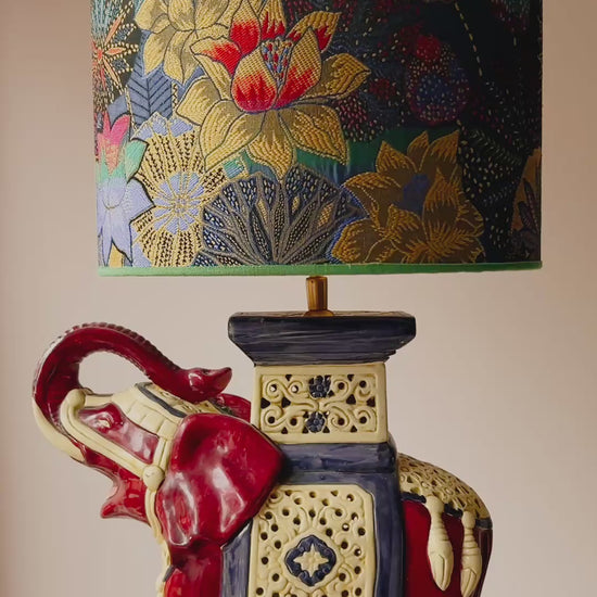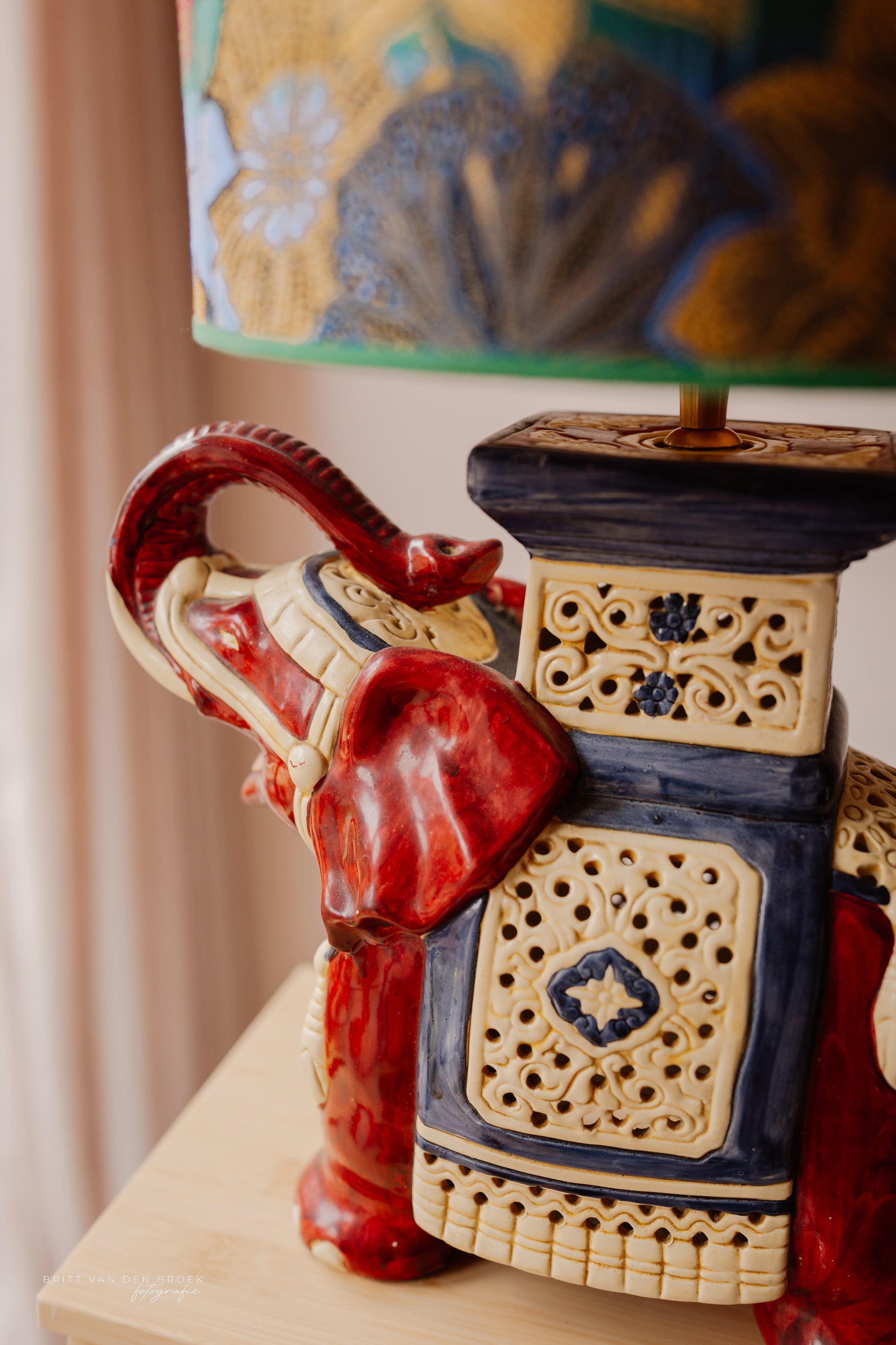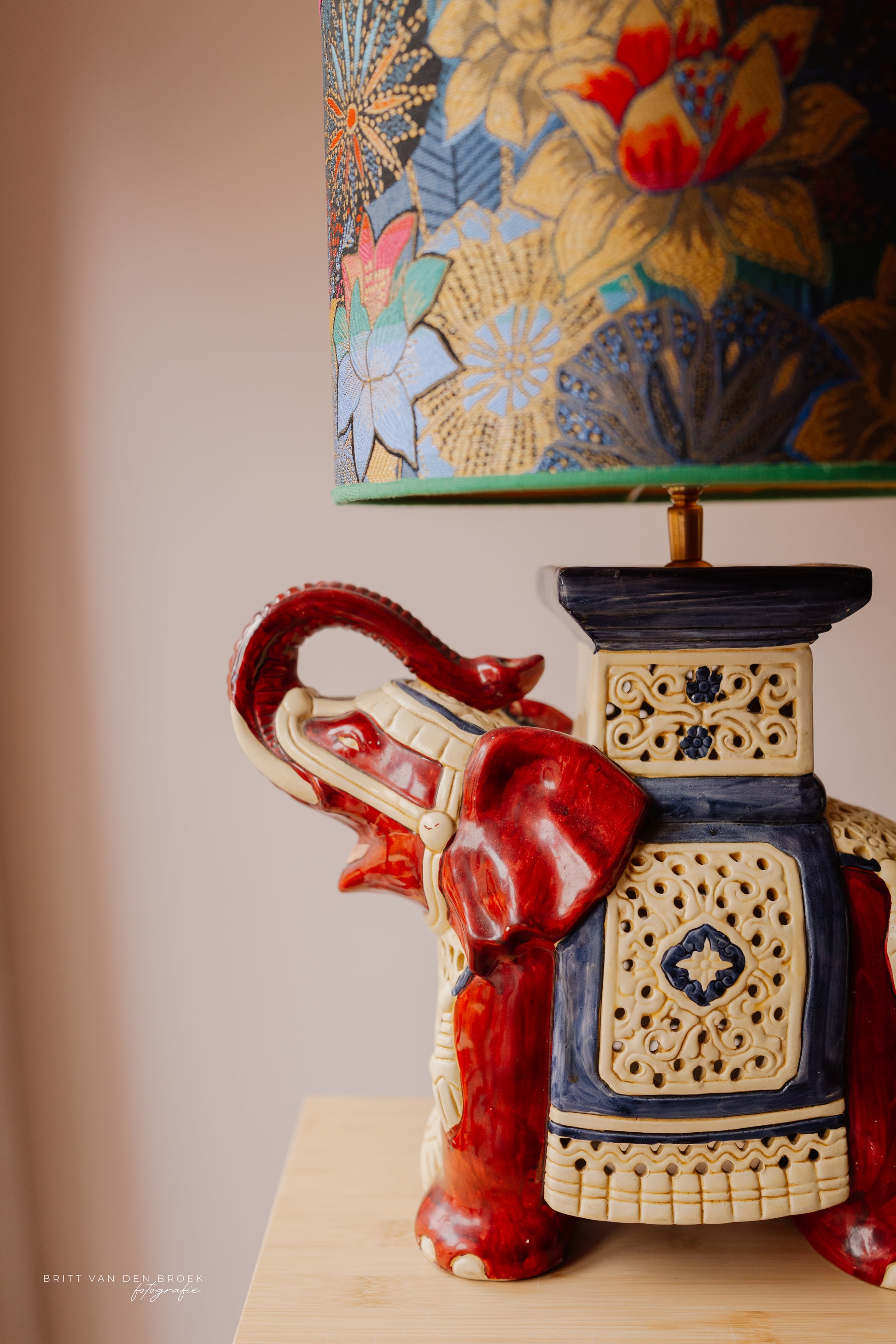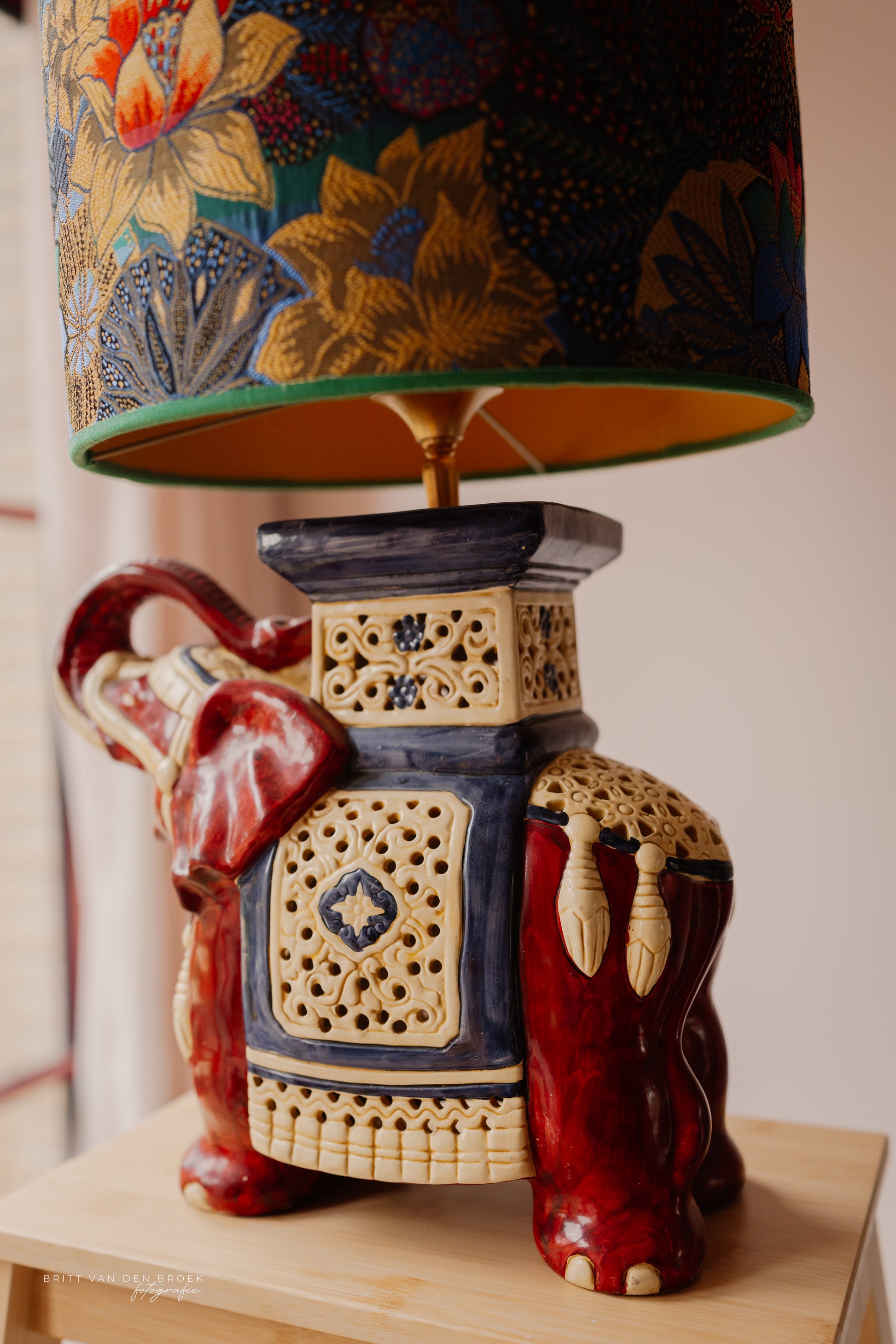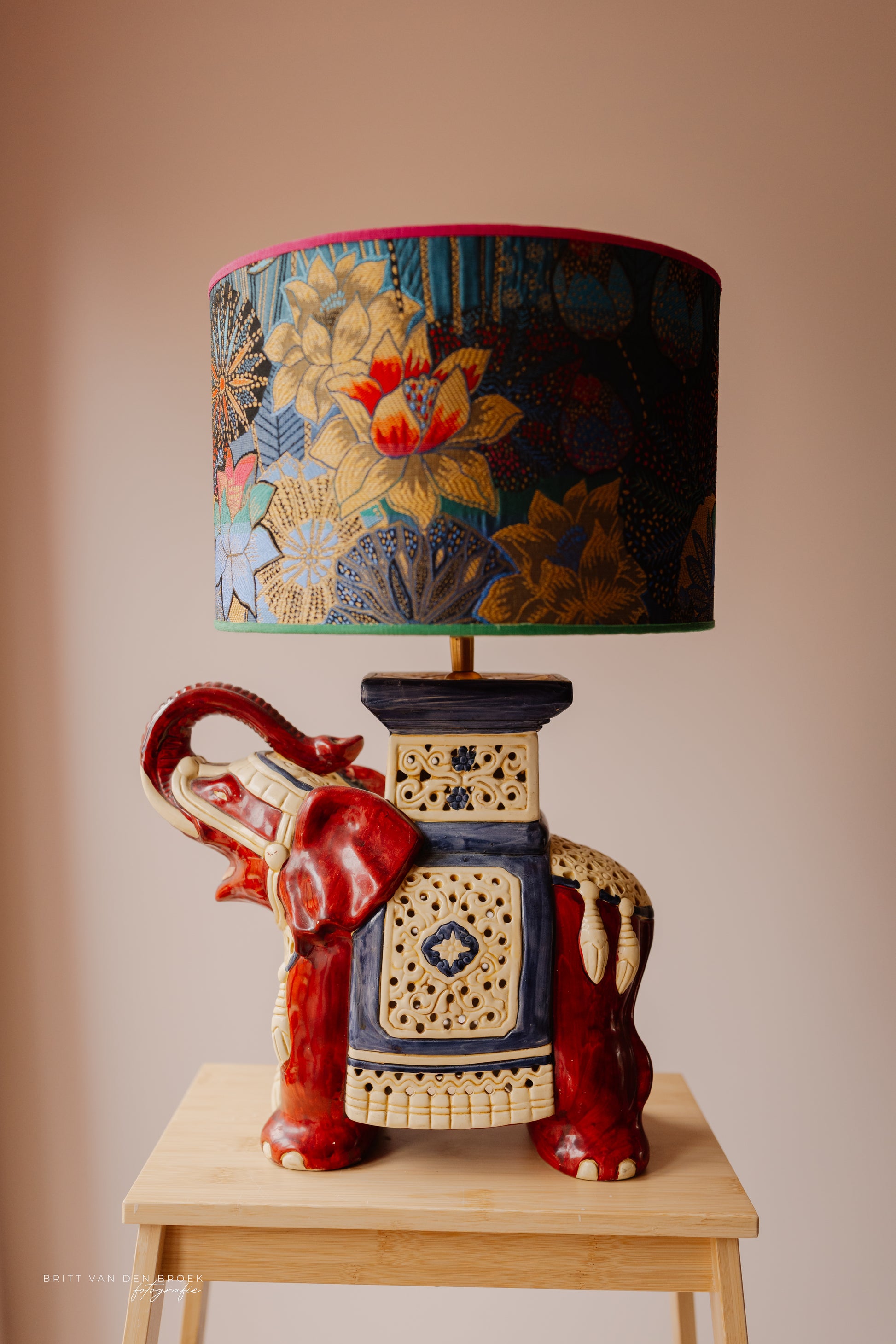 Deze lampenvoet is gemaakt van een beeld van een olifant en is 32,5 cm hoog tot de fitting. Op de foto staat er een lampenkap op de lampenvoet met een doorsnee van 30 cm en hoogte van 20 cm. De set zoals op de foto is 52 cm hoog.