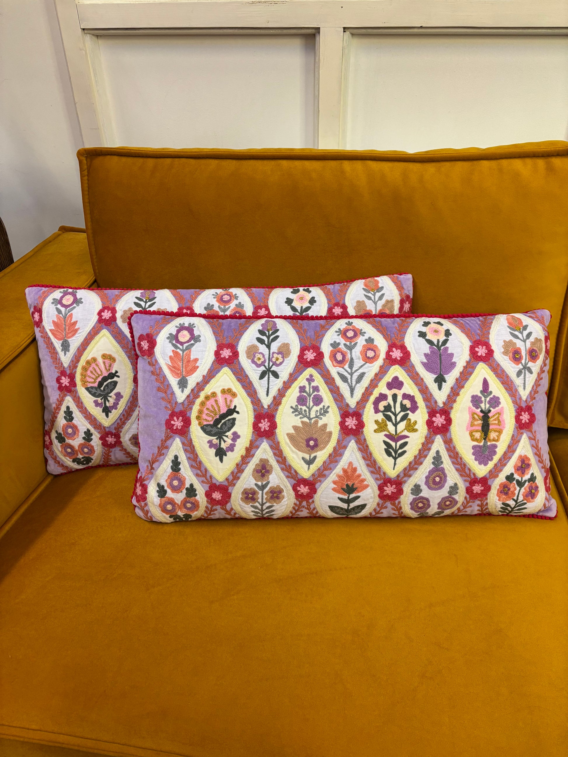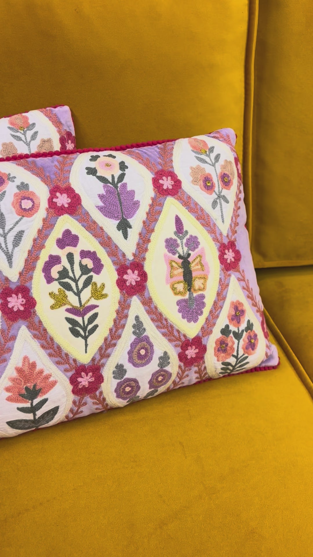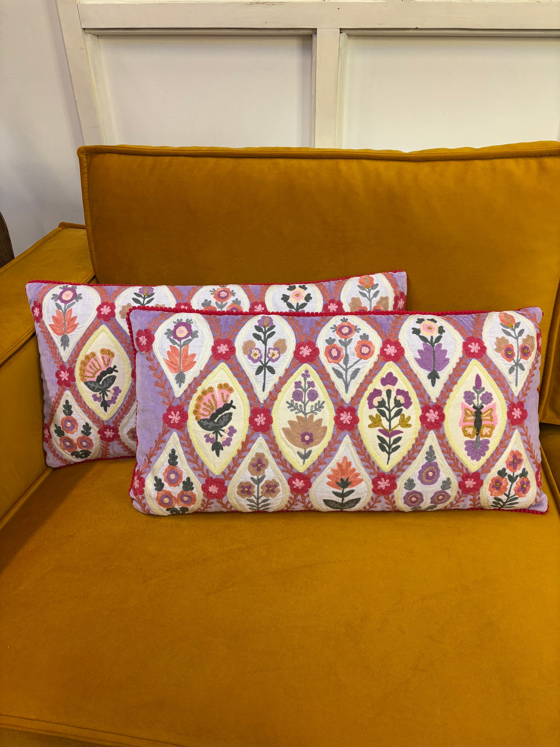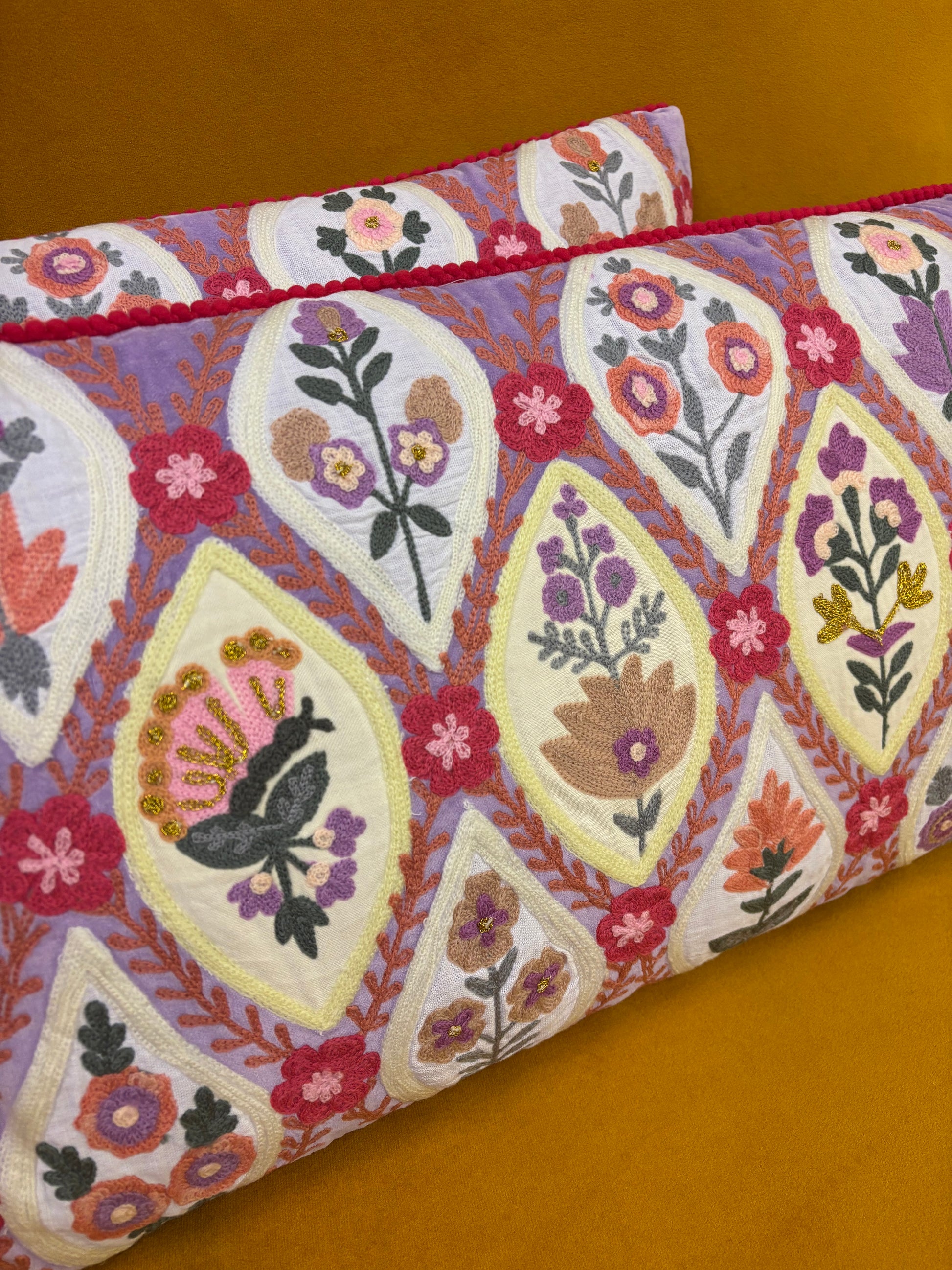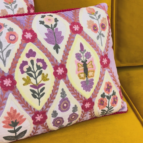 Kussen van katoenfluweel met handgeborduurde bloemen en pomponbies. De achterkant is gemaakt van effen canvas. Inclusief polyester vulling. Maat: 40 x 60 cm. Fair trade gemaakt.