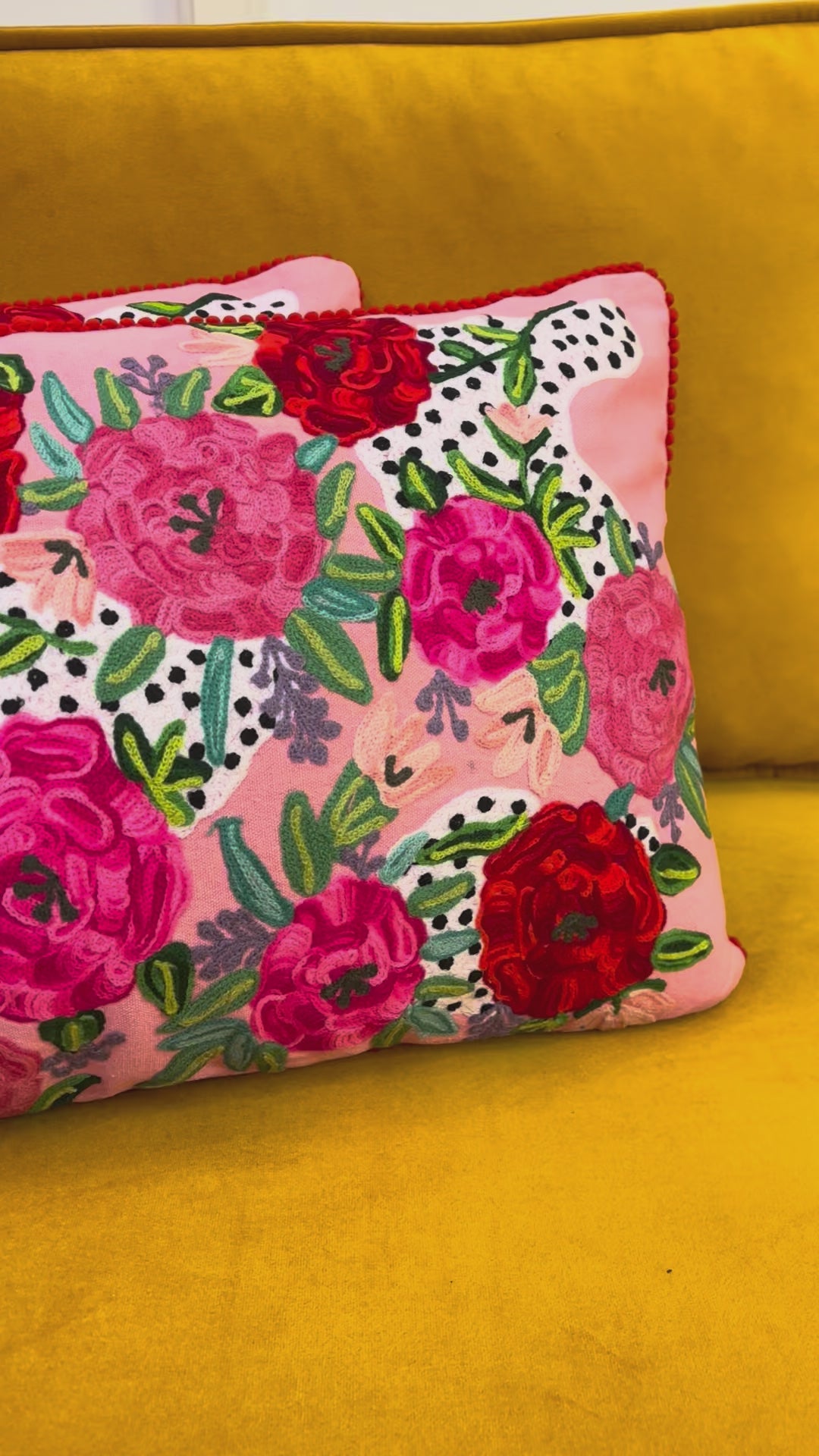 Kussen van canvas met handgeborduurde bloemen en pomponbies. De achterkant is gemaakt van effen canvas. Inclusief polyester vulling. Maat: 40 x 60 cm. Fair trade gemaakt.