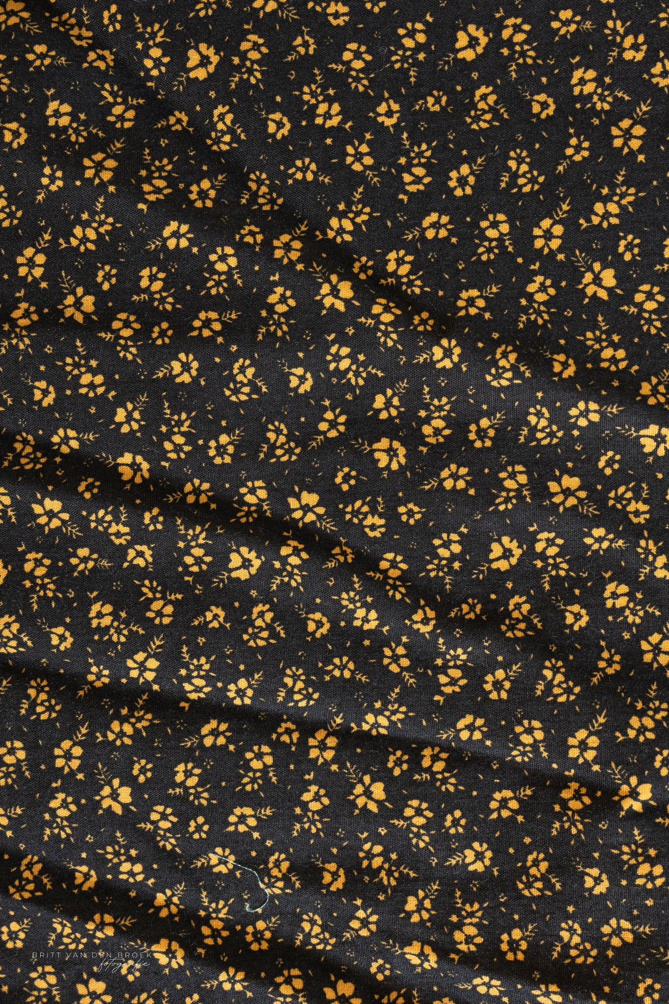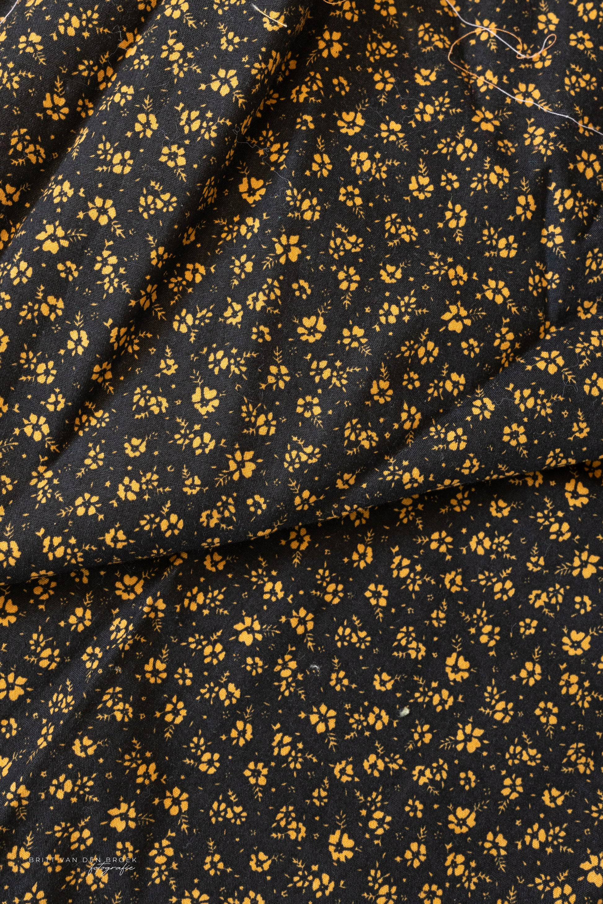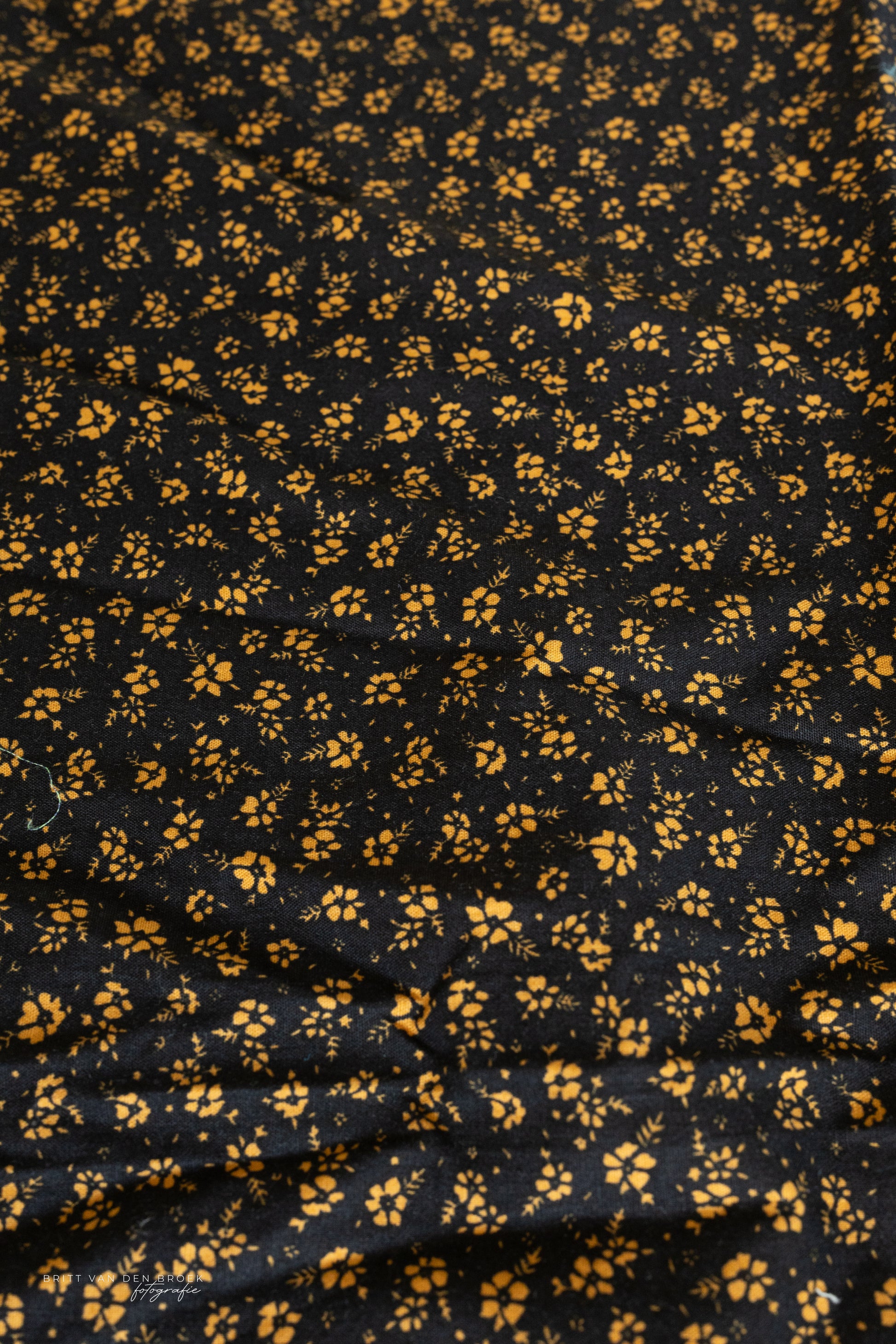 Een lampenkap met deze stof heeft een zwarte achtergrond met daarop kleine oranje of okergele bloemetjes. Doordat het patroon alle kanten op gedraaid kan worden, kun je dezelfde kap als staande kap en als hangende kap gebruiken.