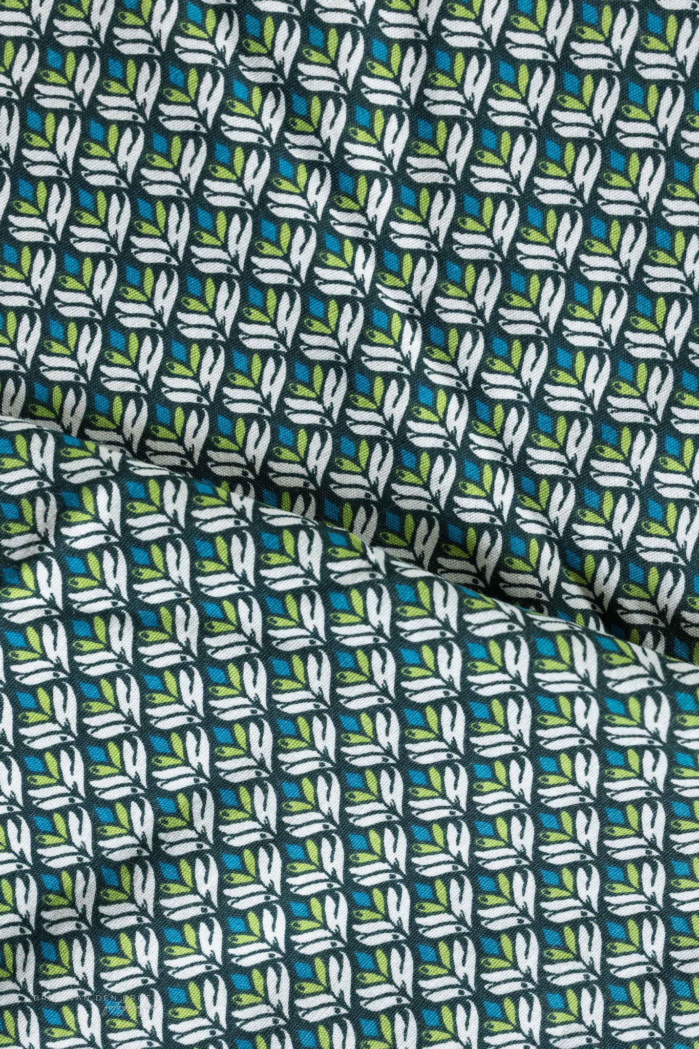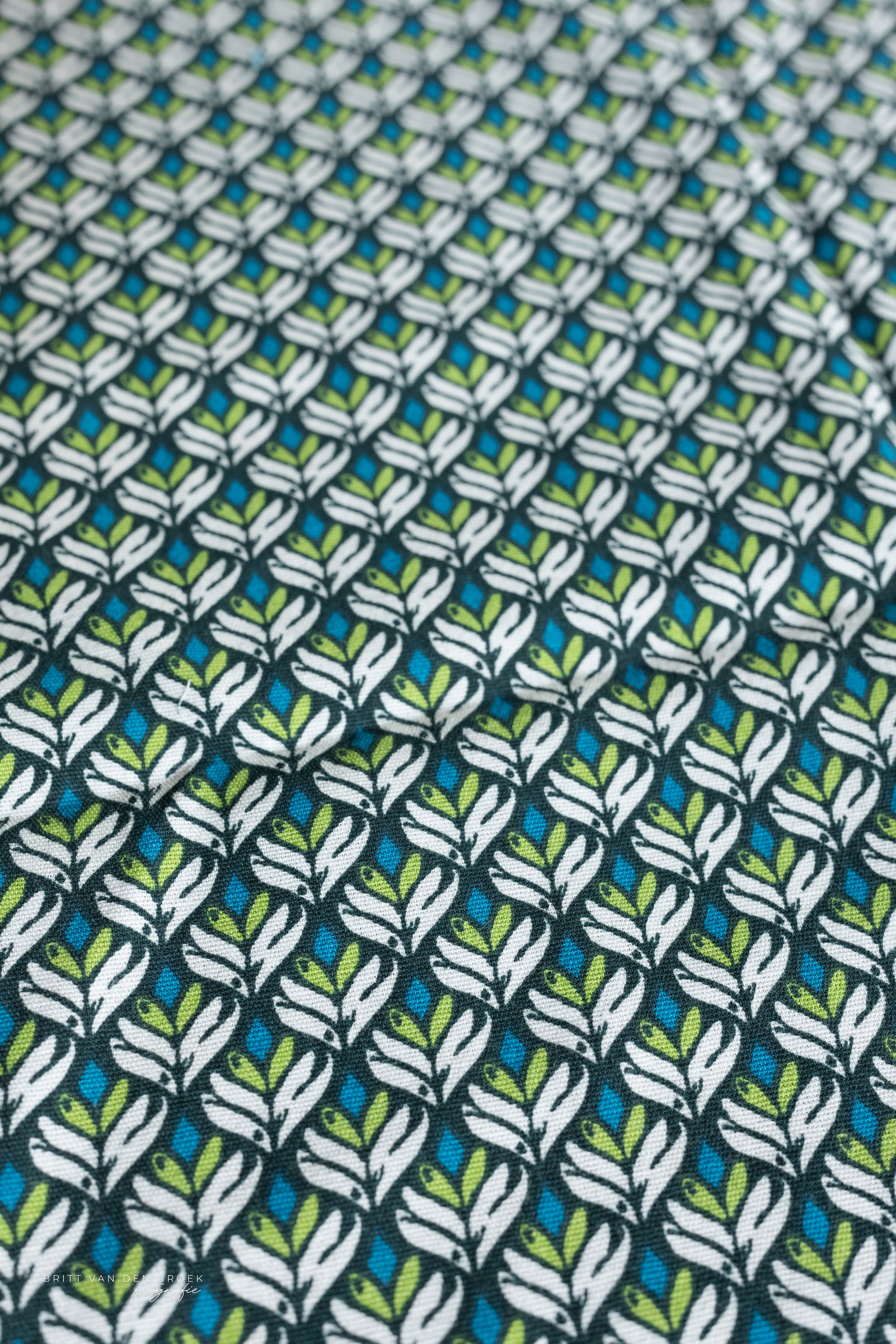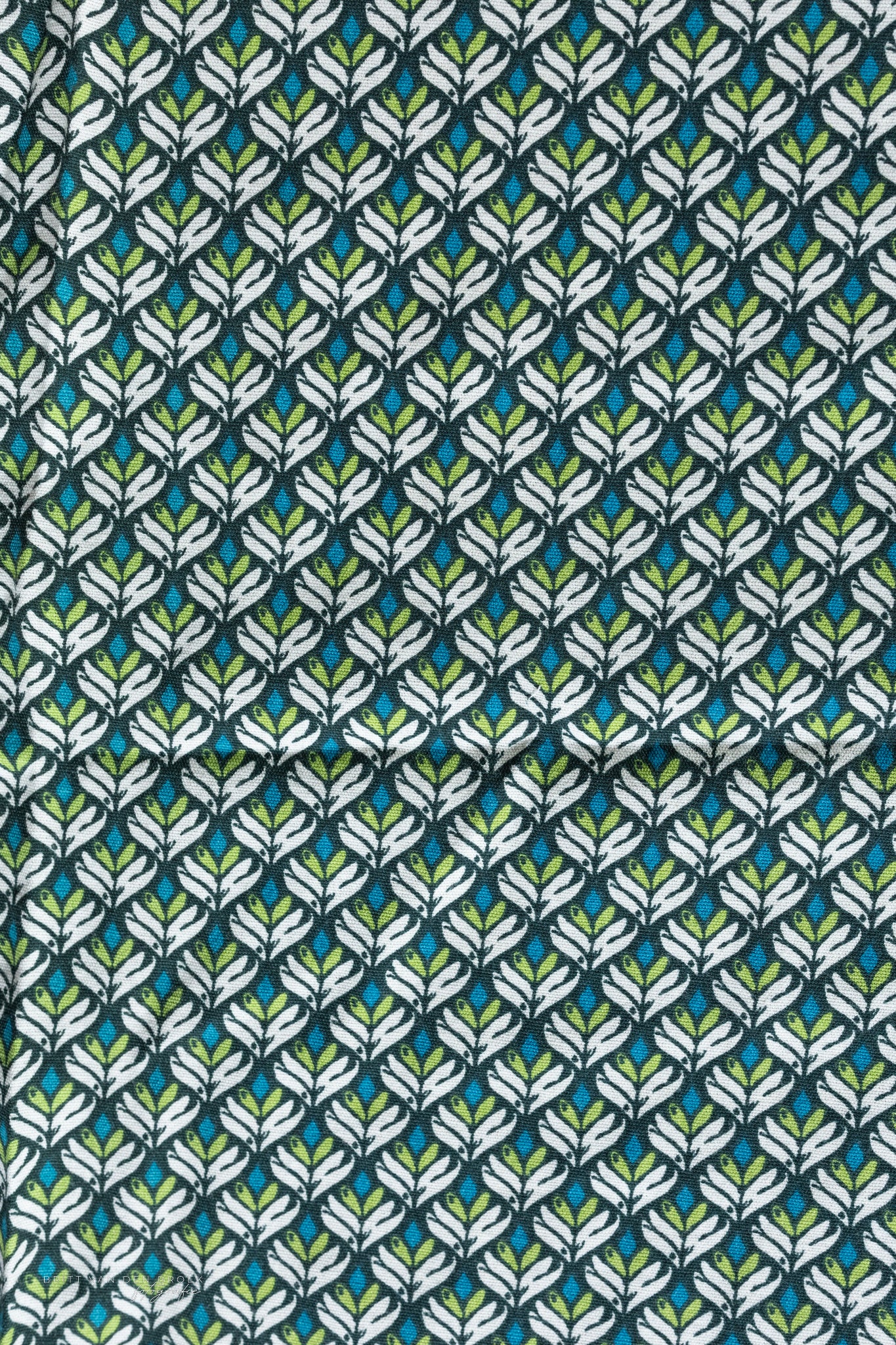 Een lampenkap met deze stof heeft een donkerblauwe of donkergroene achtergrond met daarop kleine witte met groene en donkerturquoise bloemetjes in een grafisch patroon. Als je kiest voor een staande kap zullen de donkerturquoise puntjes van de bloemen naar boven wijzen.