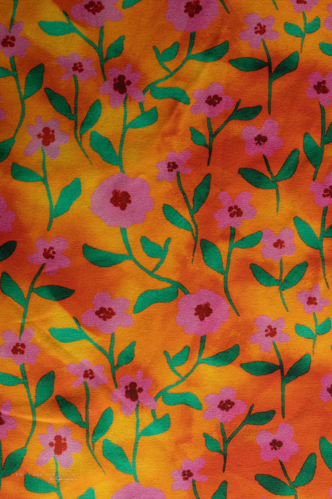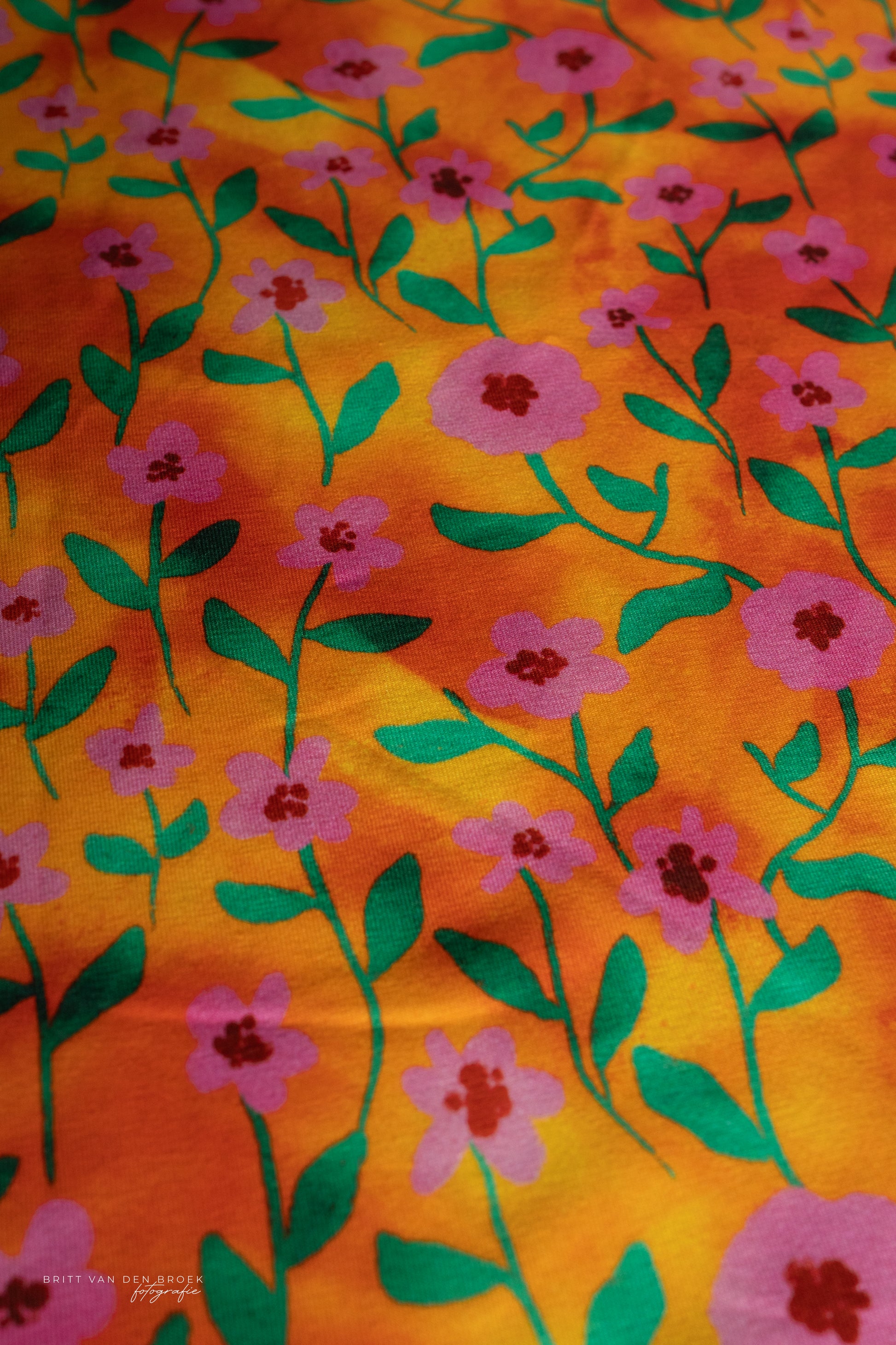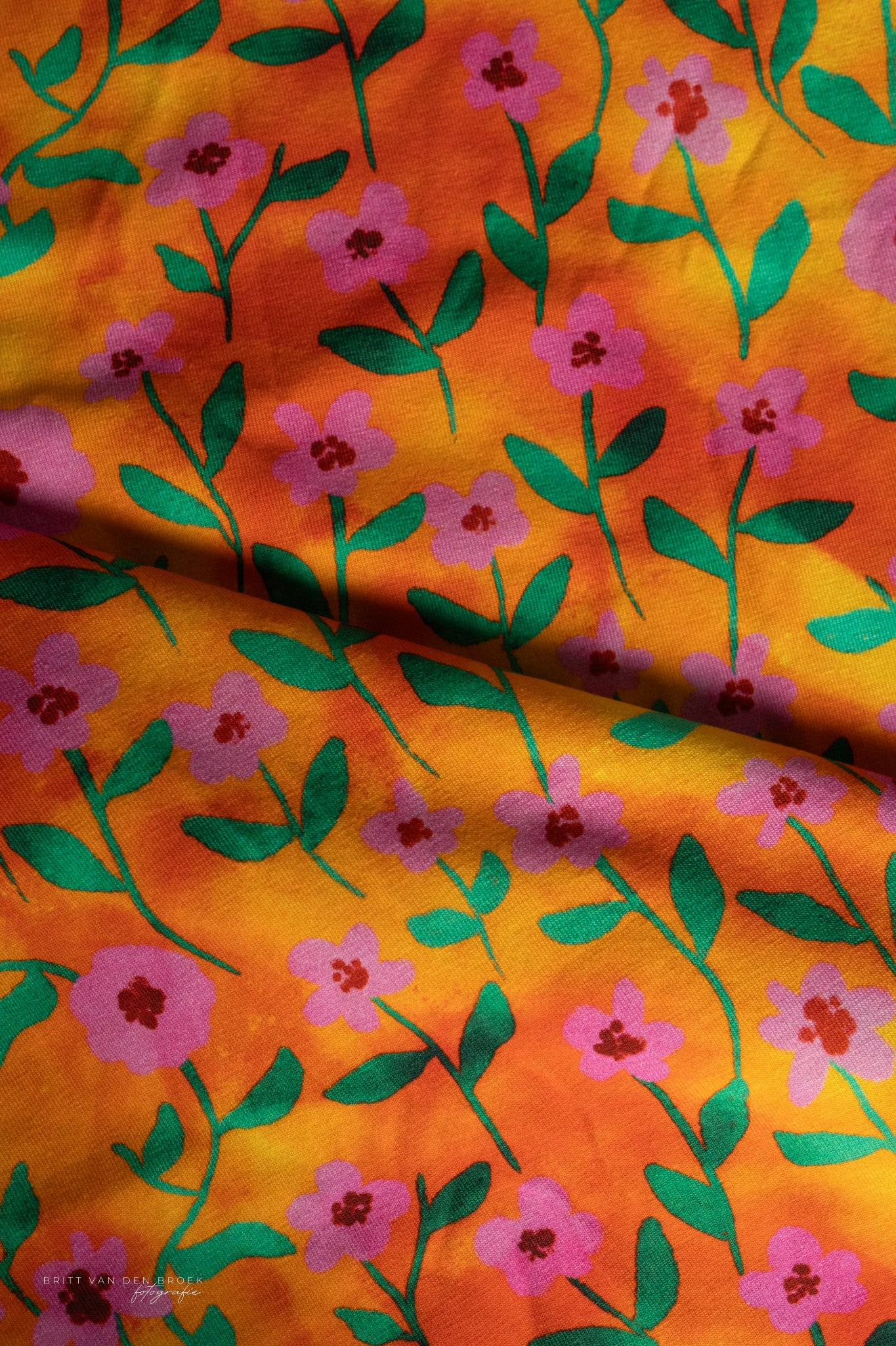 Een lampenkap met deze canvasstof heeft roze bloemen met groene blaadjes tegen een oranje achtergrond.