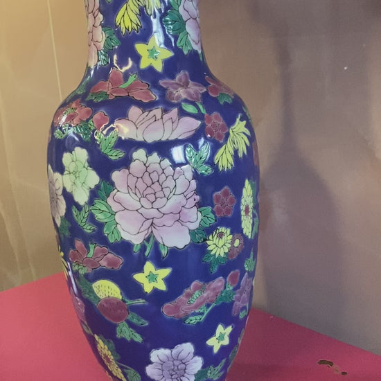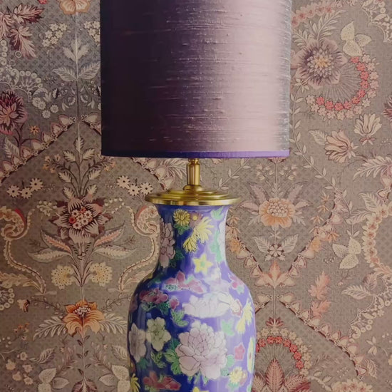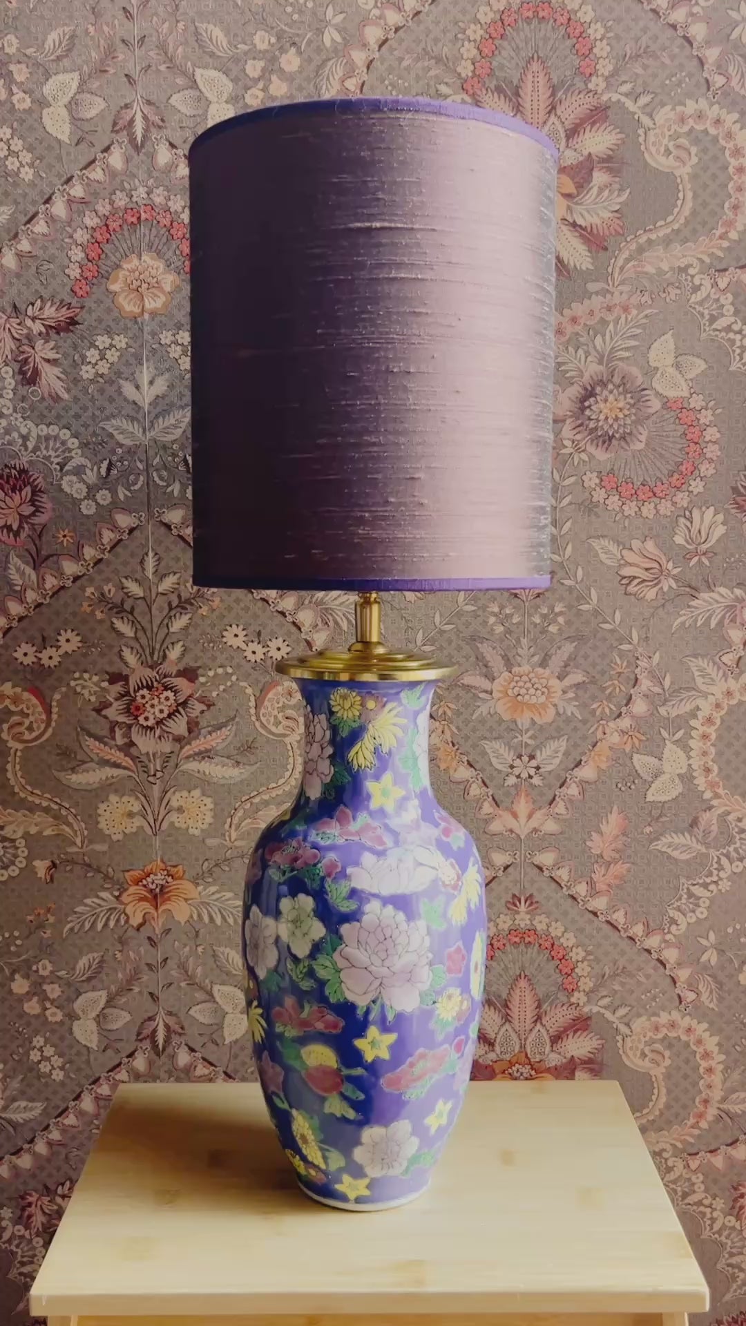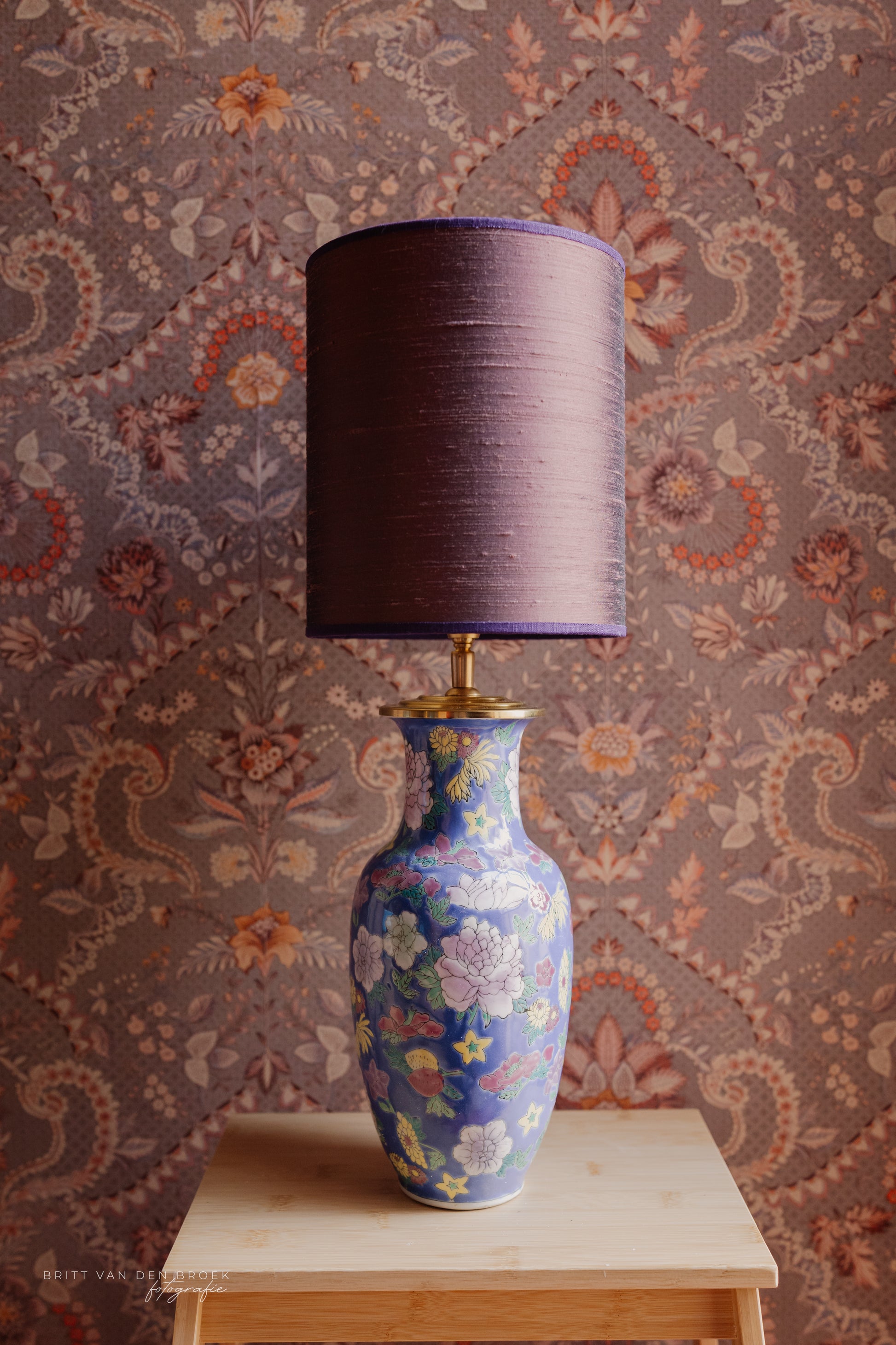 Op de lampenvoet staan bloemen in verschillende kleuren. Hij is tot de fitting 34 cm hoog. Op de eerste foto's staat er op de voet een lampenkap met een doorsnee van 20 cm en hoogte van 23 cm. Dit maakt de set 56 cm hoog. Op de laatste foto's staat er op de voet een lampenkap met een doorsnee van 30 cm en hoogte van 19 cm. Dit maakt de set 52 cm hoog.