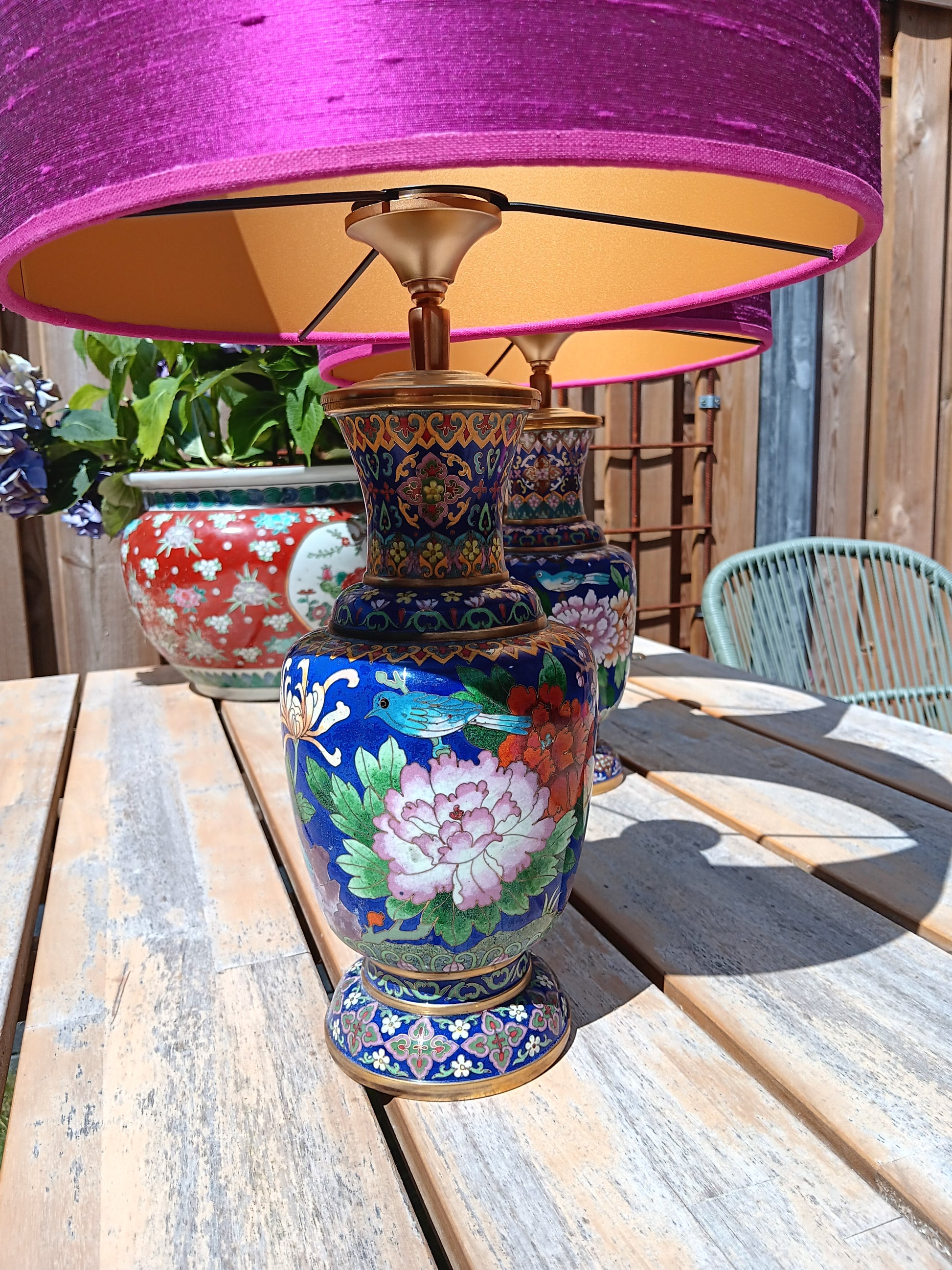 Deze lampenvoeten zijn gemaakt van cloissoné-vazen en zijn 30 cm hoog tot de fitting. Ze zijn koningsblauw en hebben gekleurde bloemen en figuren. Op de foto staan er lampenkappen op de lampenvoeten met een doorsnee van 30 cm en hoogte van 18 cm. De sets zoals op de foto zijn 48 cm hoog.