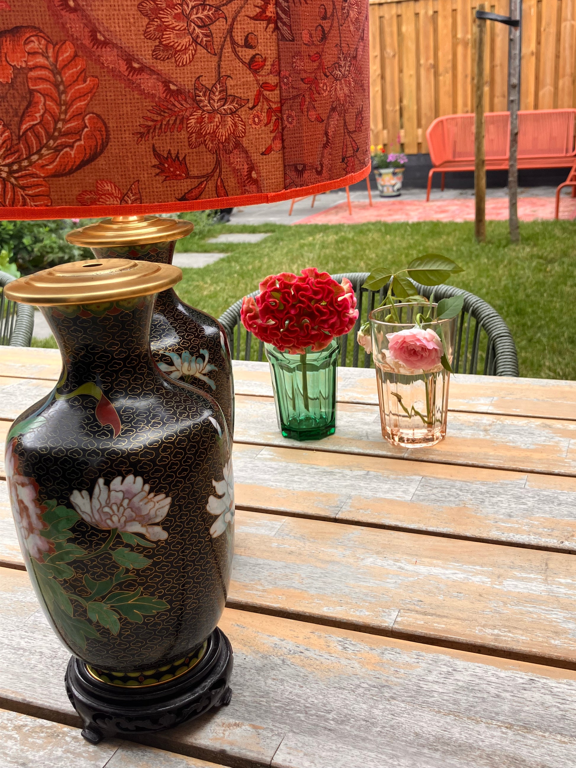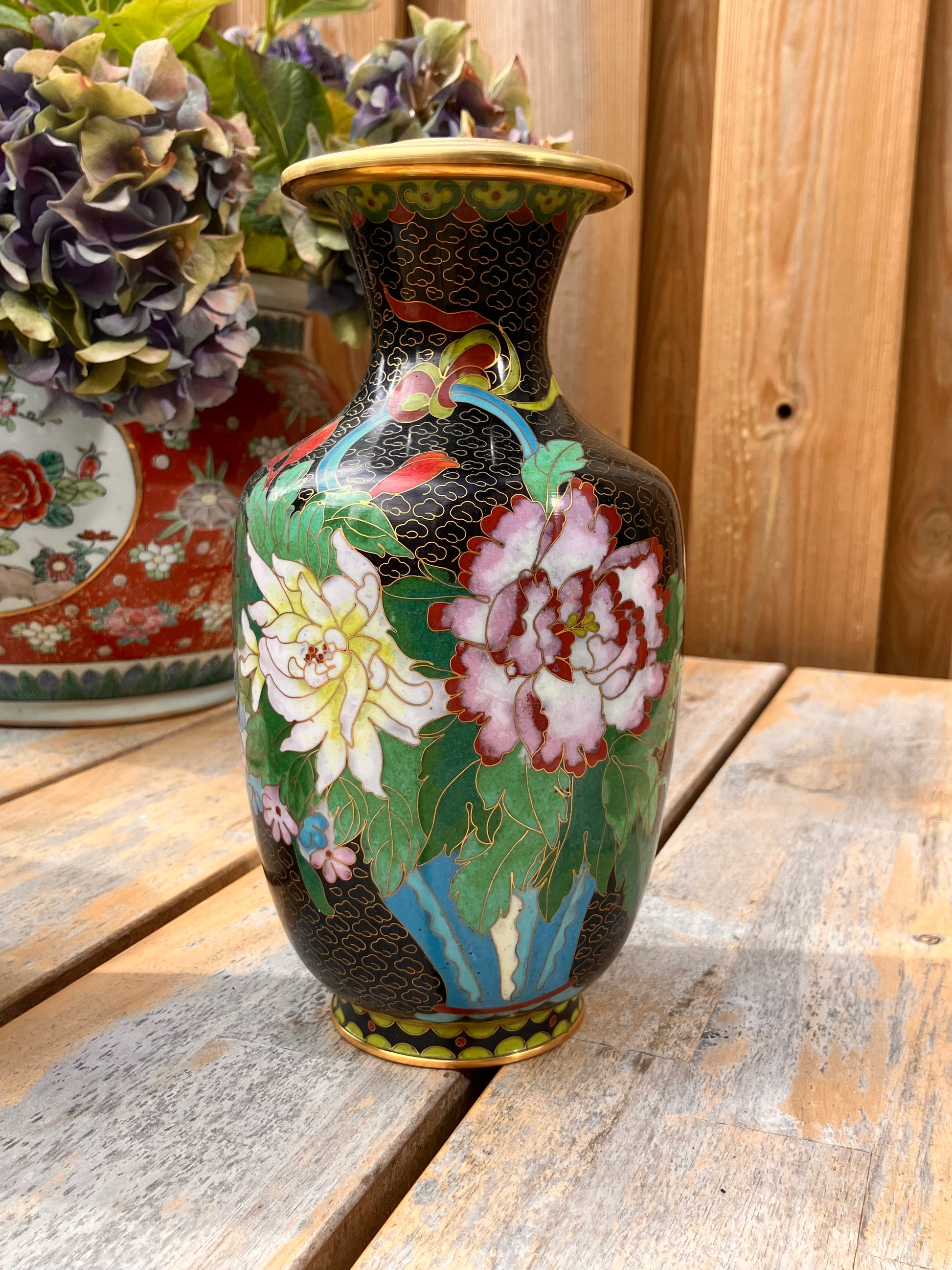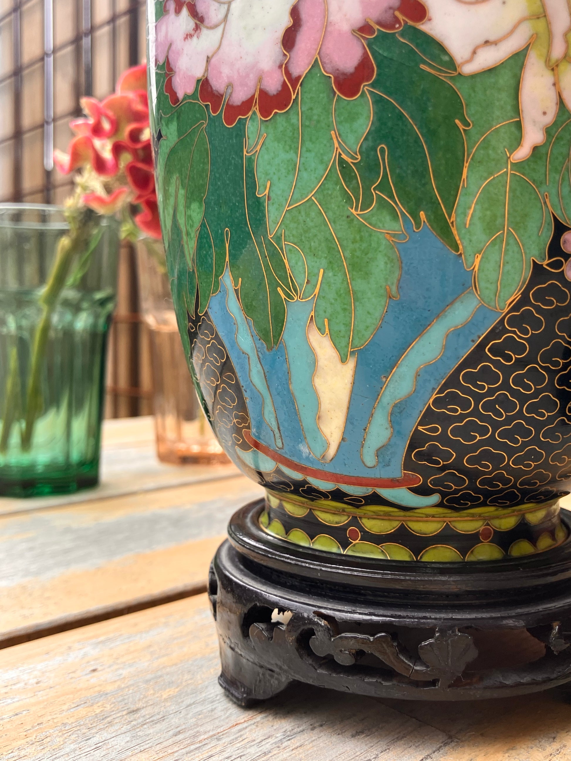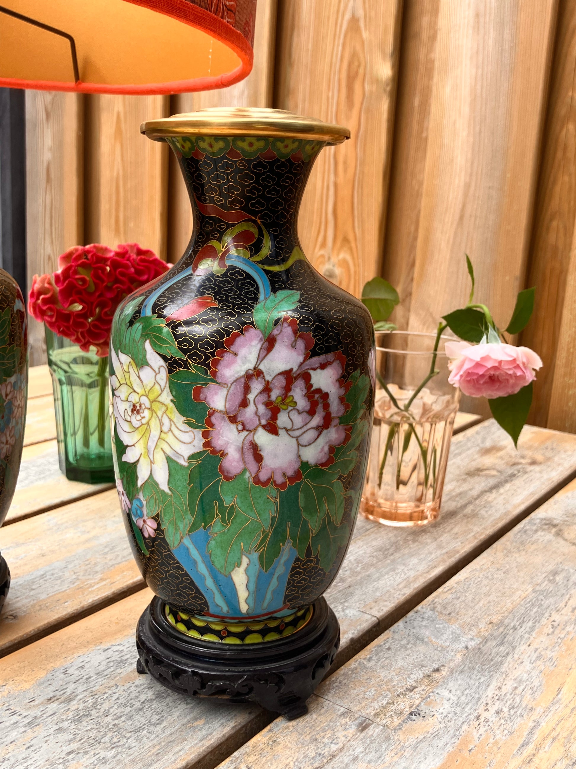 Deze lampenvoeten zijn gemaakt van zwarte cloissoné-vazen met daar op bloemen, en zijn - wanneer ze op de plateau staan - 30 cm hoog tot de fitting. Op de foto staat er een lampenkap op de linker lampenvoet met een doorsnee van 35 cm en hoogte van 22 cm. De set zoals op de foto is 52 cm hoog. De houten plateaus staan los onder de lampenvoeten. Als je deze niet mooi vindt, kun je ze weg laten. Dat ziet er uit zoals op de laatste foto.
