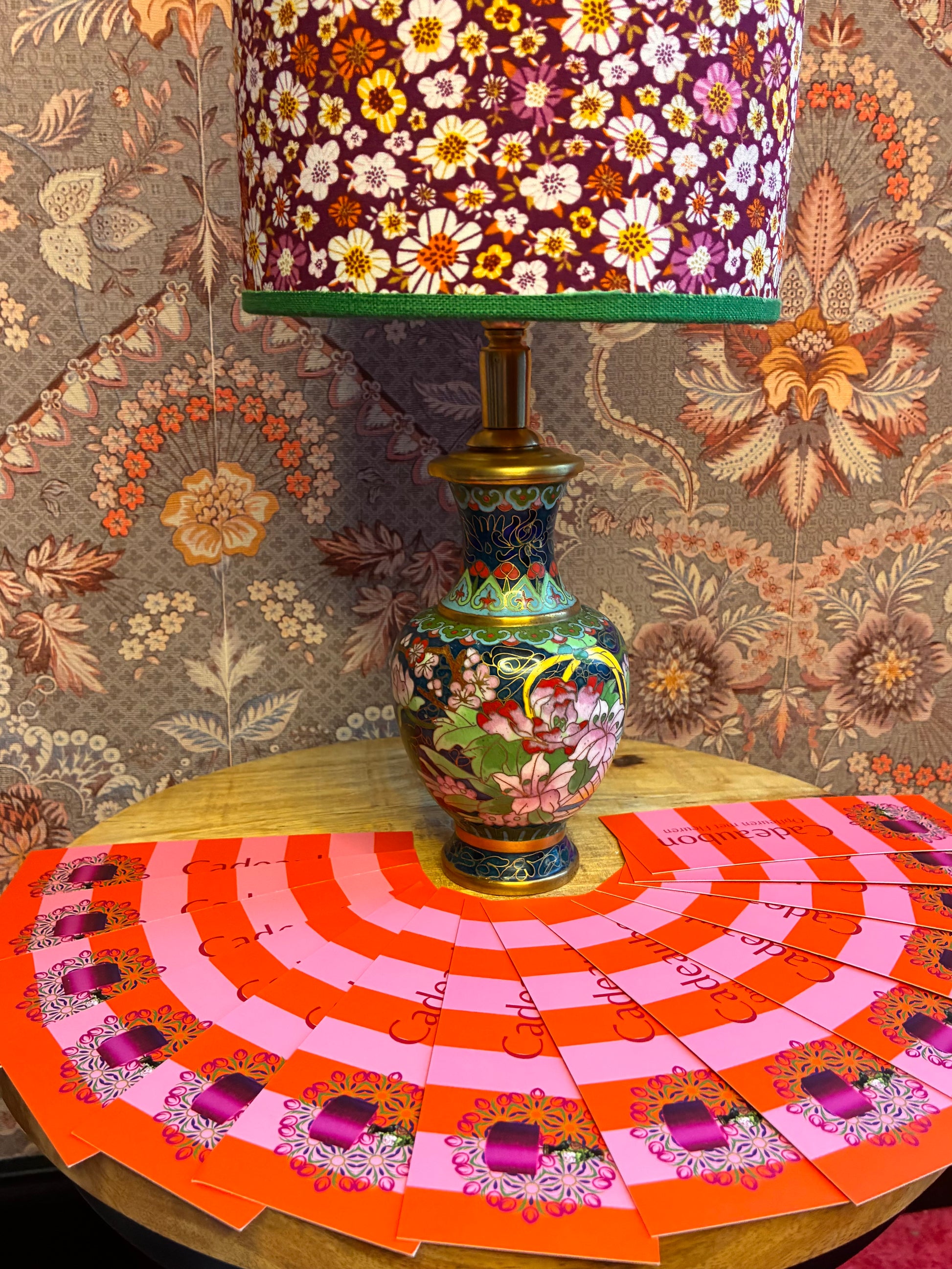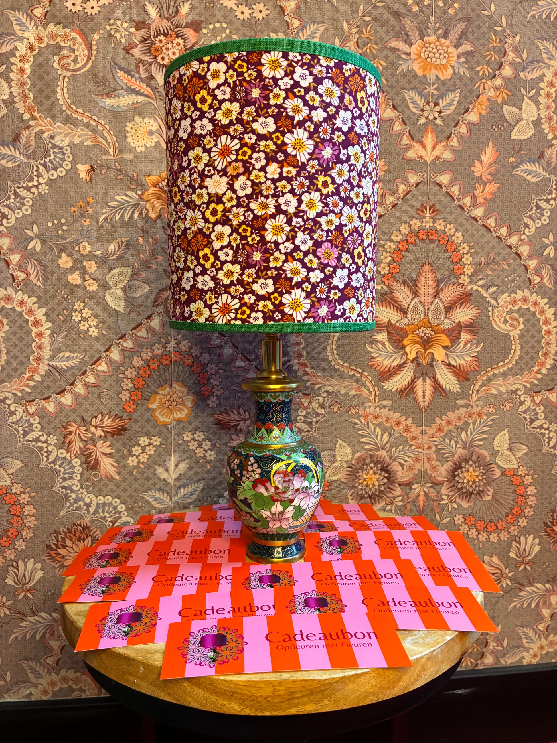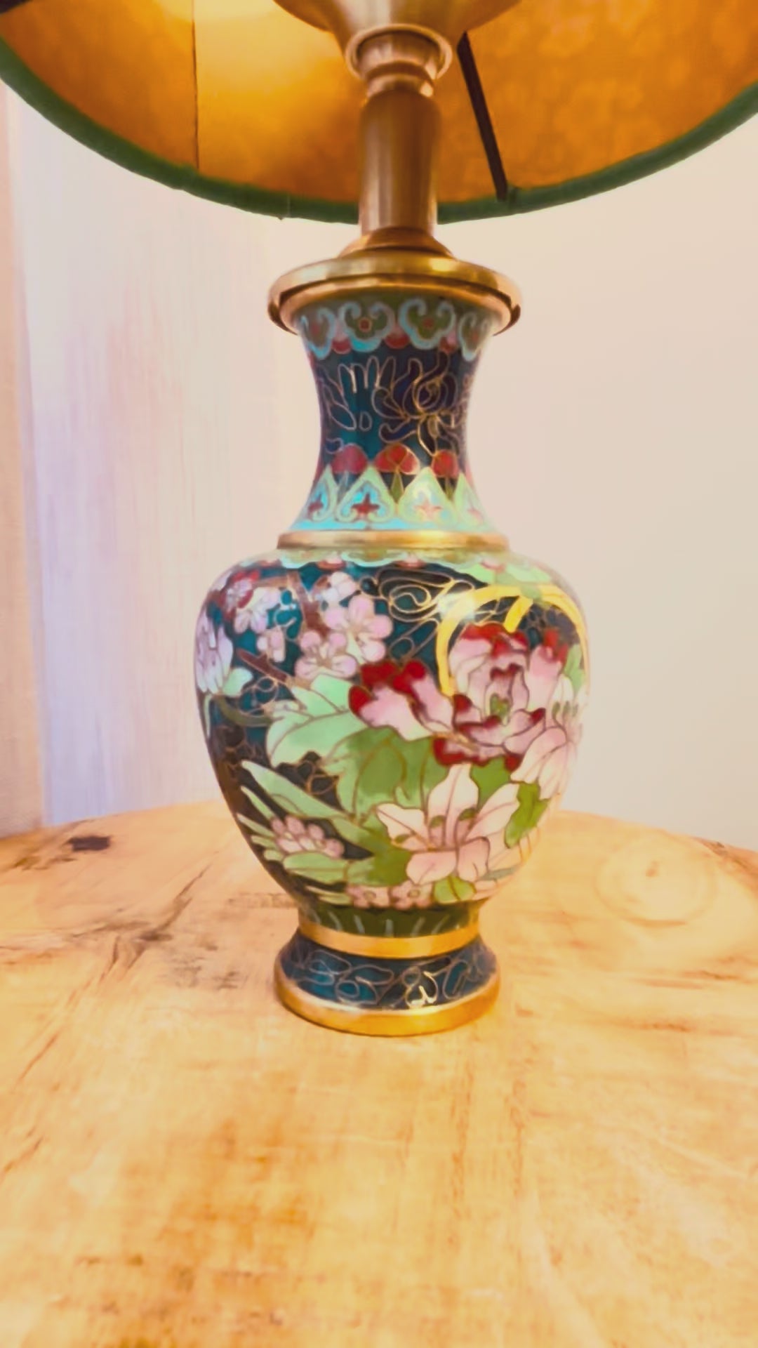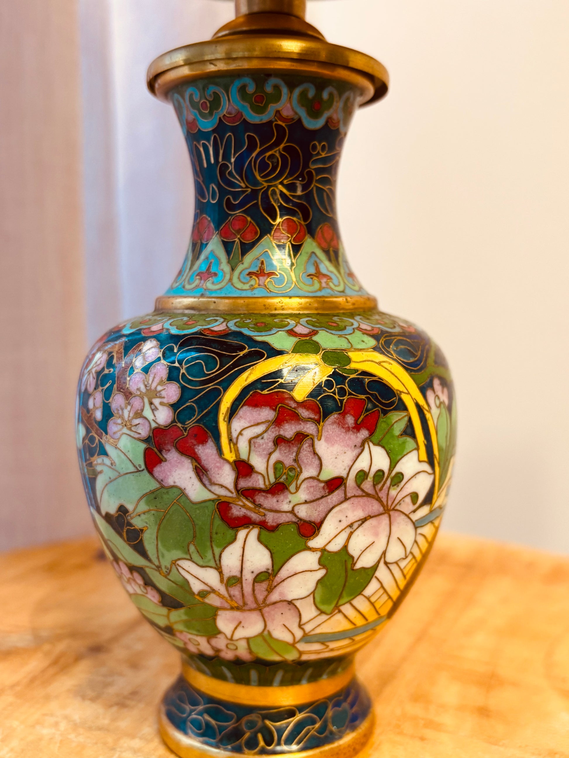 Deze lampenvoet is gemaakt van een cloissoné-vaasje en is 17 cm hoog tot de fitting. Hij is donkerblauw en heeft een roze/rode bloem en andere gekleurde versieringen. Op de foto staat er een lampenkap op de lampenvoeten met een doorsnee van 15 cm en hoogte van 17 cm. De set zoals op de foto is 34 cm hoog.