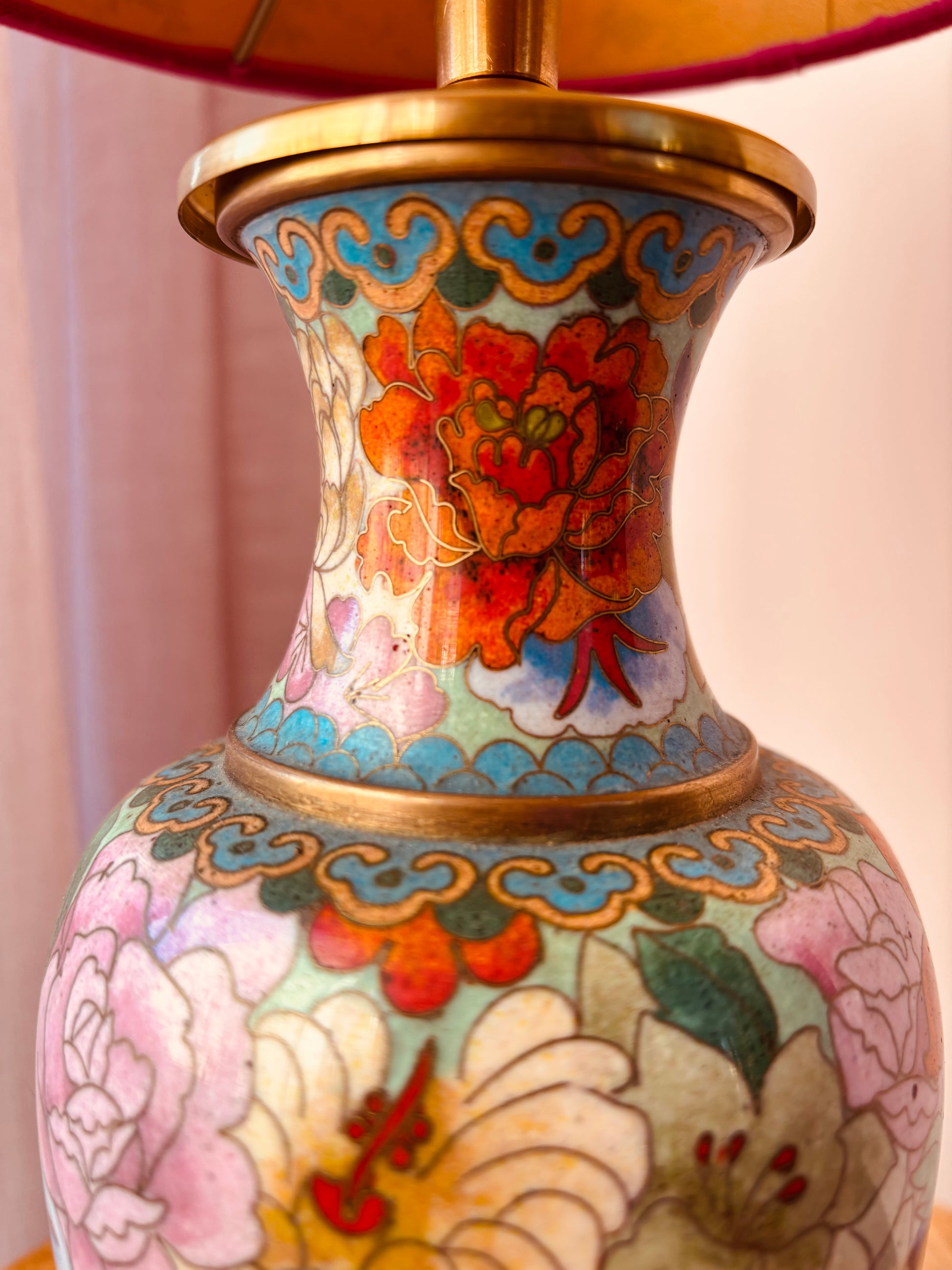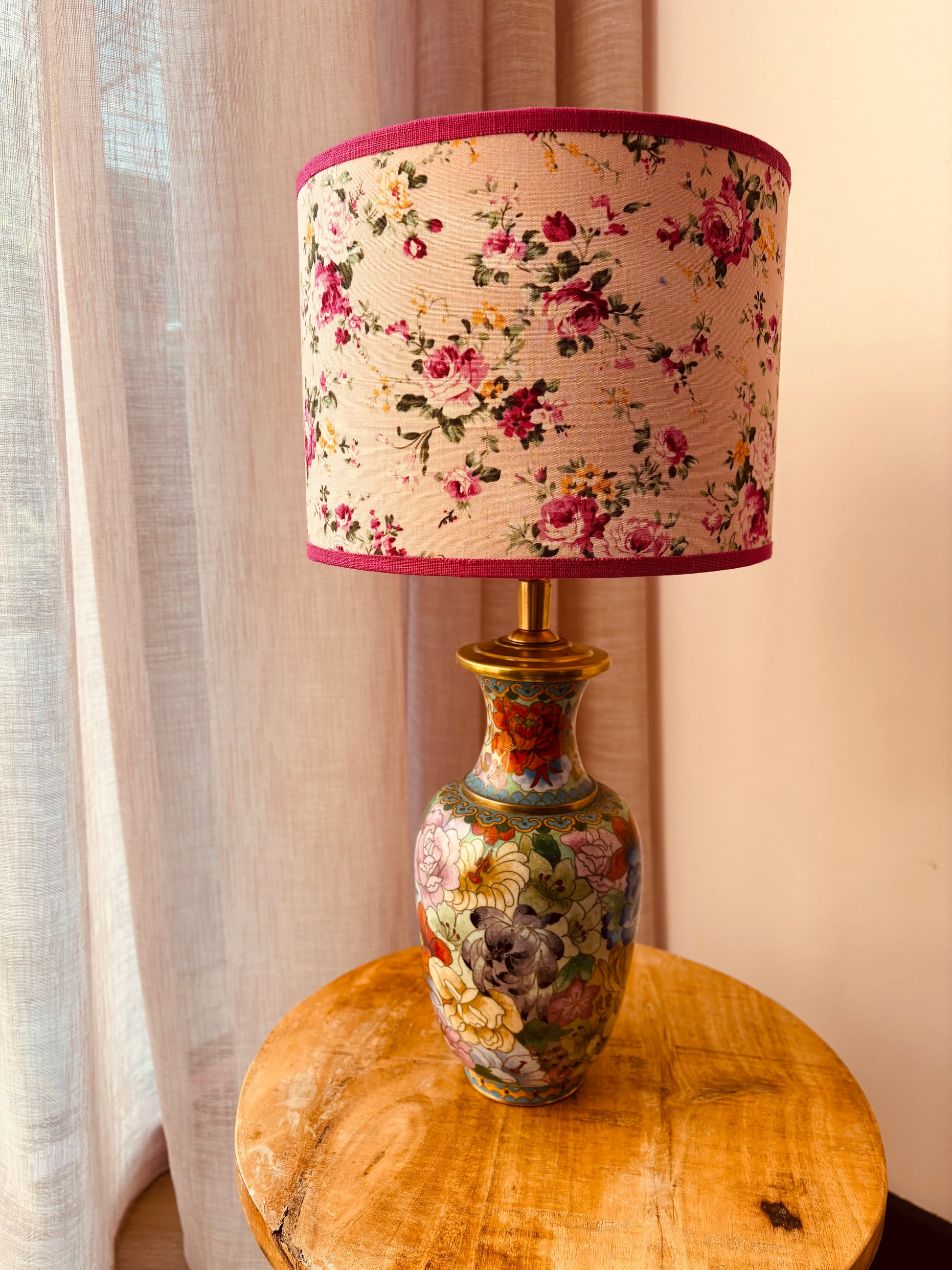 Deze lampenvoet is gemaakt een cloissoné-vaas. Op de lampenvoet staan bloemen in verschillende kleuren. Hij is tot de fitting 26 cm hoog. Op de foto staat er op de voet een lampenkap met een doorsnee van 20 cm en hoogte van 15 cm. Dit maakt de set 41 cm hoog.