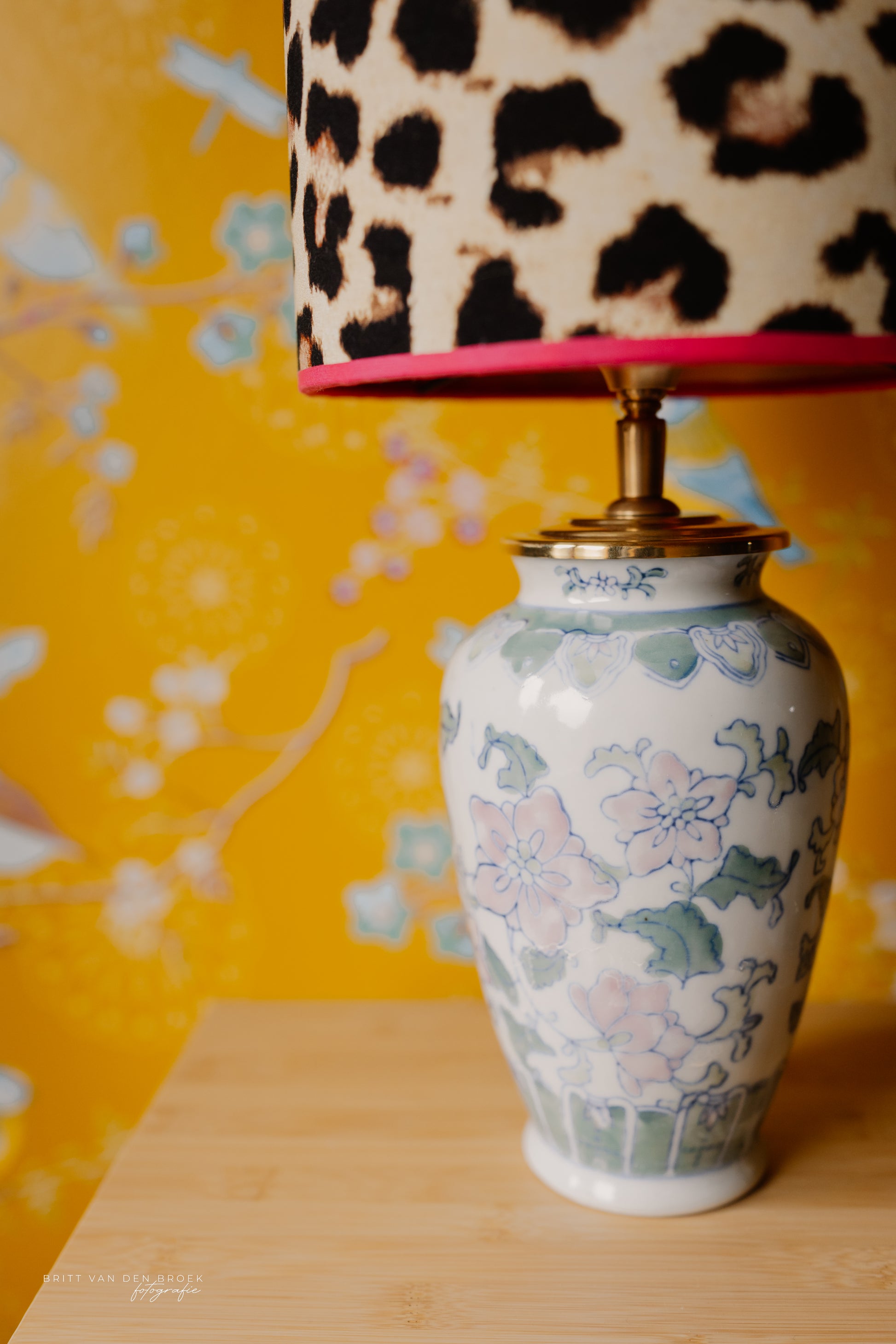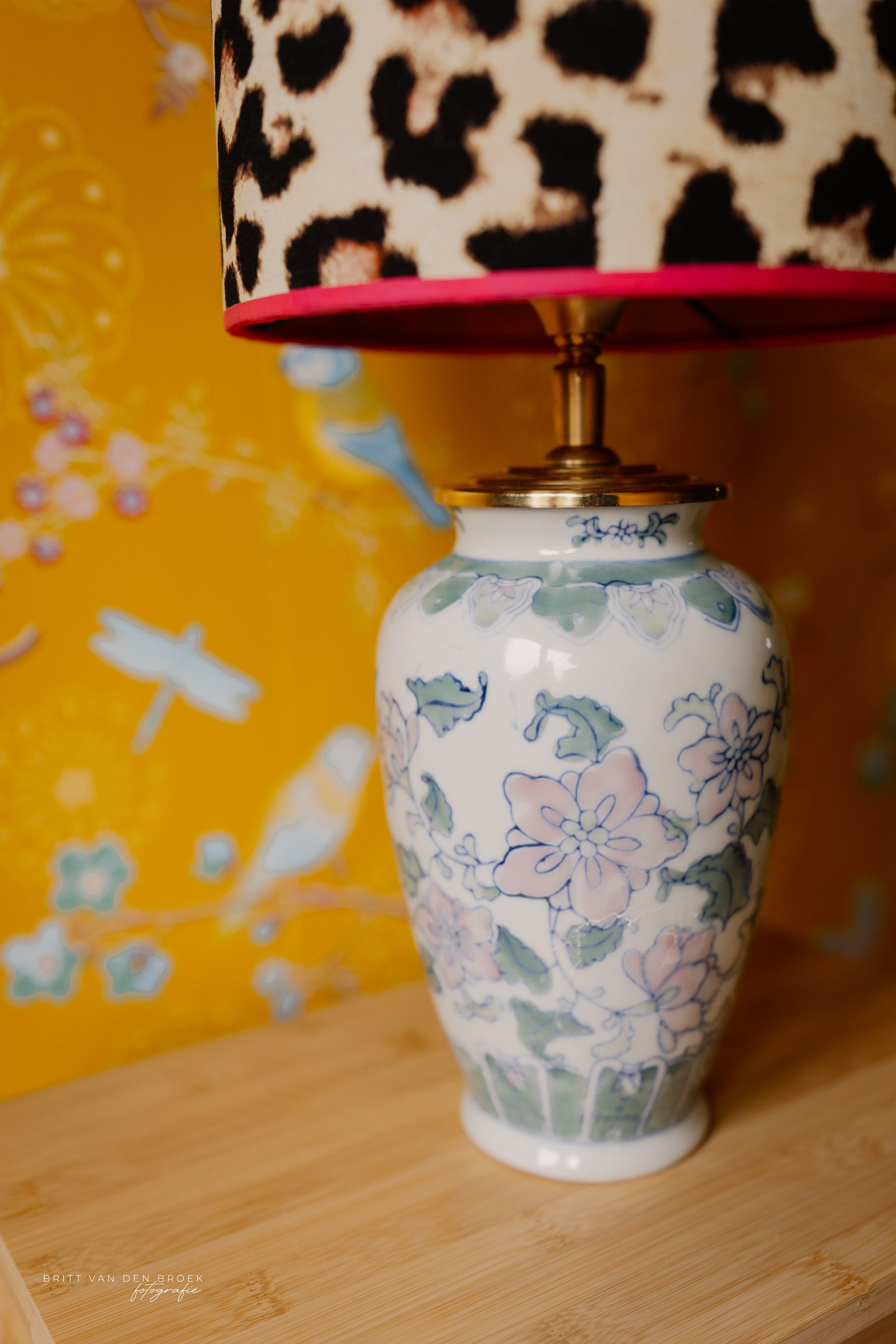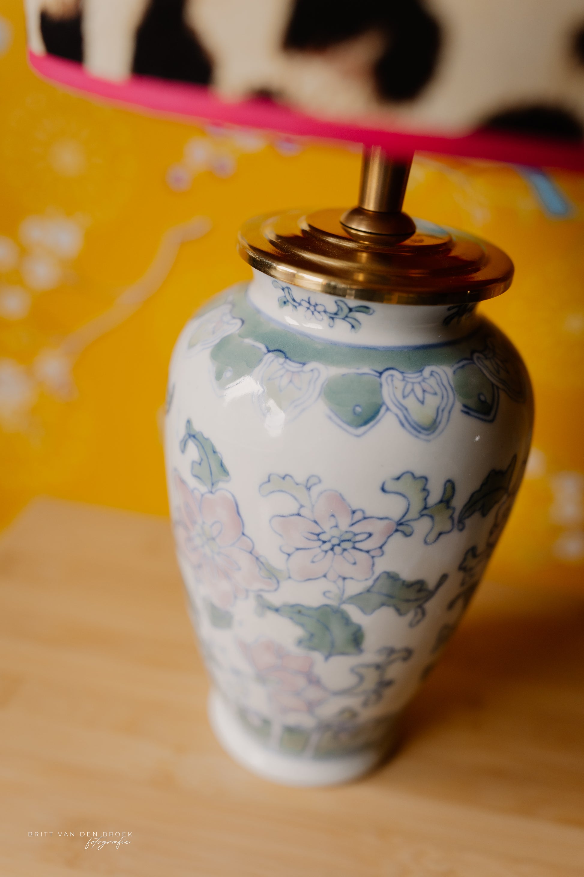 Deze lampenvoet staat vol met groene bloemen met af en toe een vleugje roze. Hij is tot de fitting 25 cm hoog. Op de eerste foto's staat er op de voet een lampenkap met een doorsnee van 20 cm en hoogte van 23 cm. Dit maakt de set zoals op de foto 48 cm hoog. Op de laatste foto's staat er op de voet een lampenkap met een doorsnee van 20 cm en hoogte van 15 cm. Dit maakt de set 40 cm hoog.