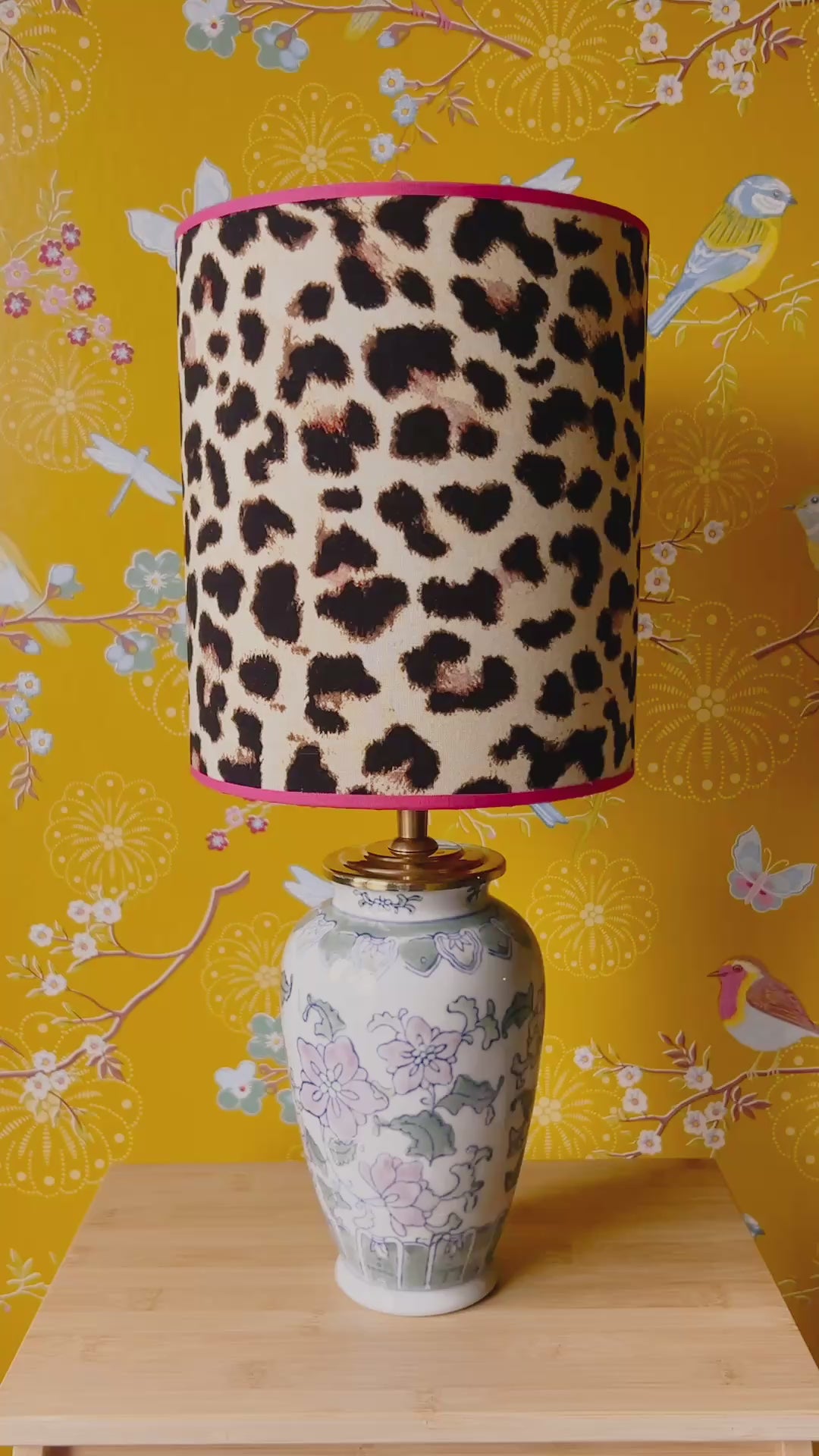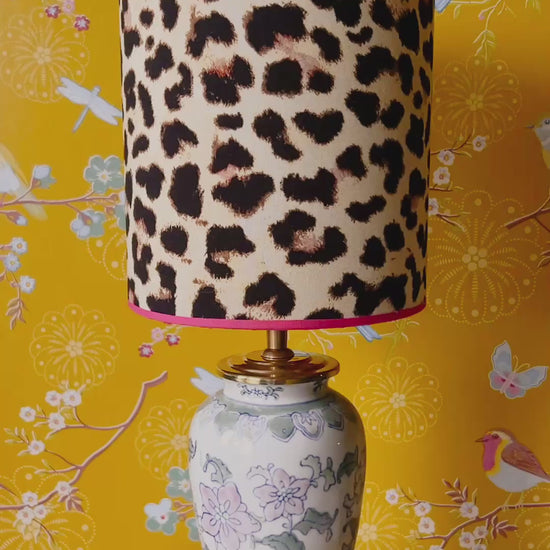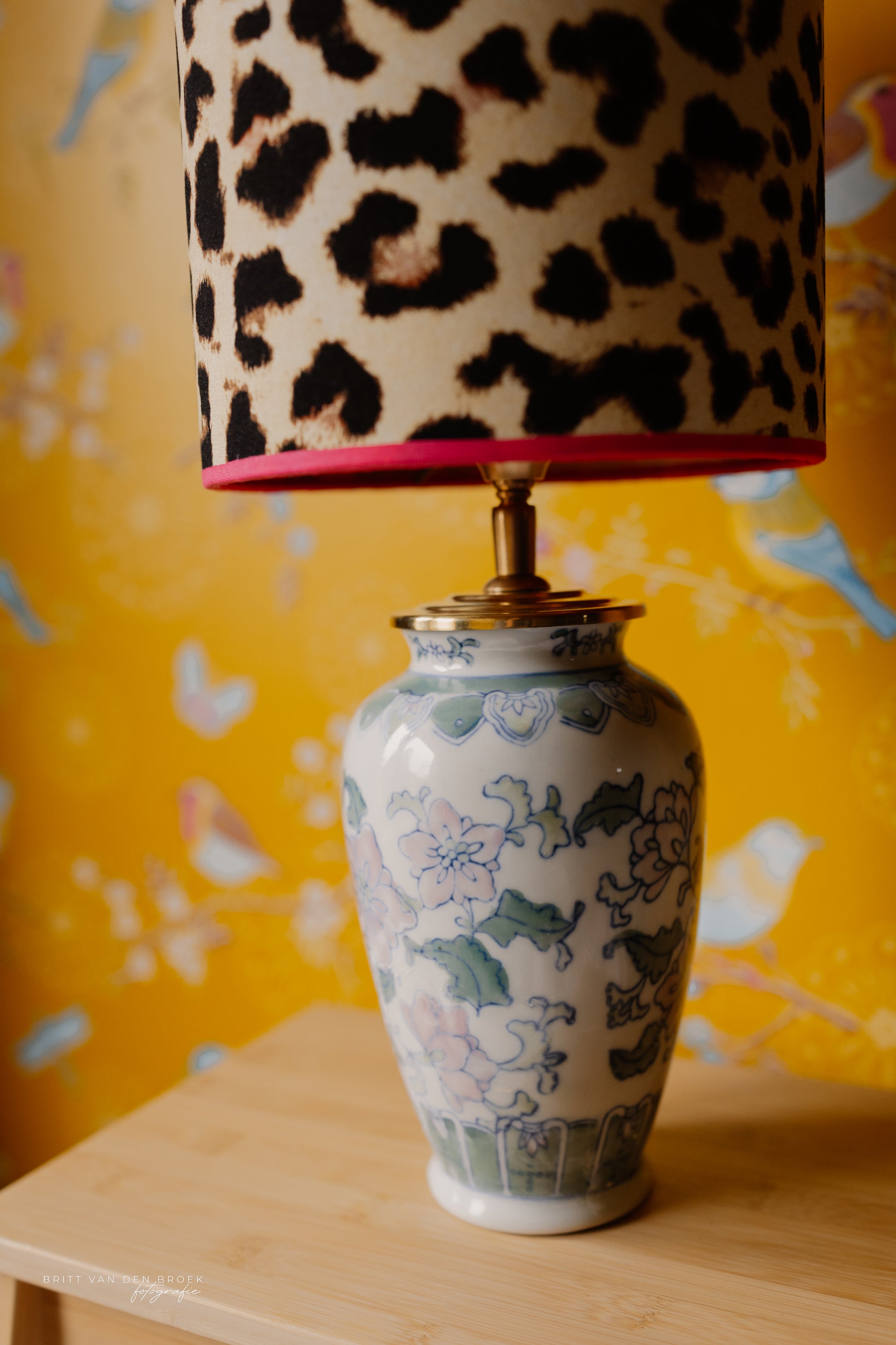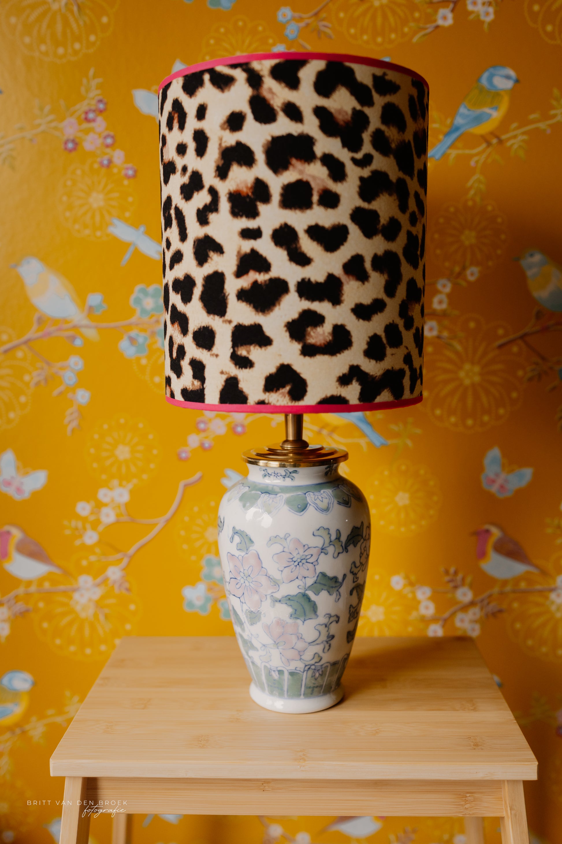 Deze lampenvoet staat vol met groene bloemen met af en toe een vleugje roze. Hij is tot de fitting 25 cm hoog. Op de eerste foto's staat er op de voet een lampenkap met een doorsnee van 20 cm en hoogte van 23 cm. Dit maakt de set zoals op de foto 48 cm hoog. Op de laatste foto's staat er op de voet een lampenkap met een doorsnee van 20 cm en hoogte van 15 cm. Dit maakt de set 40 cm hoog.