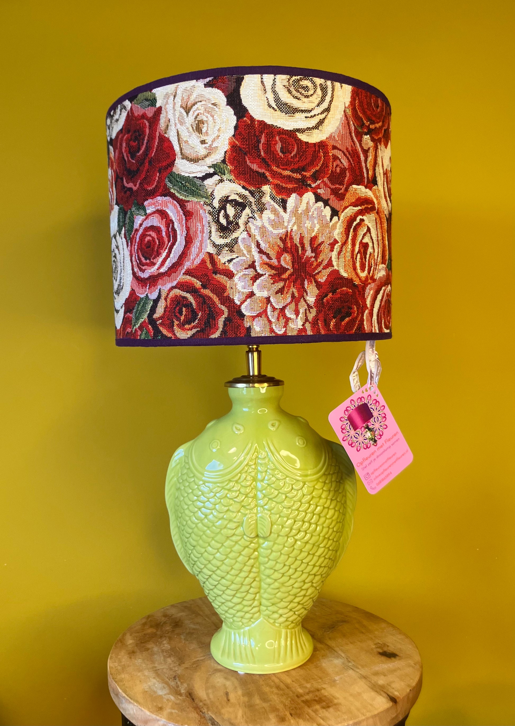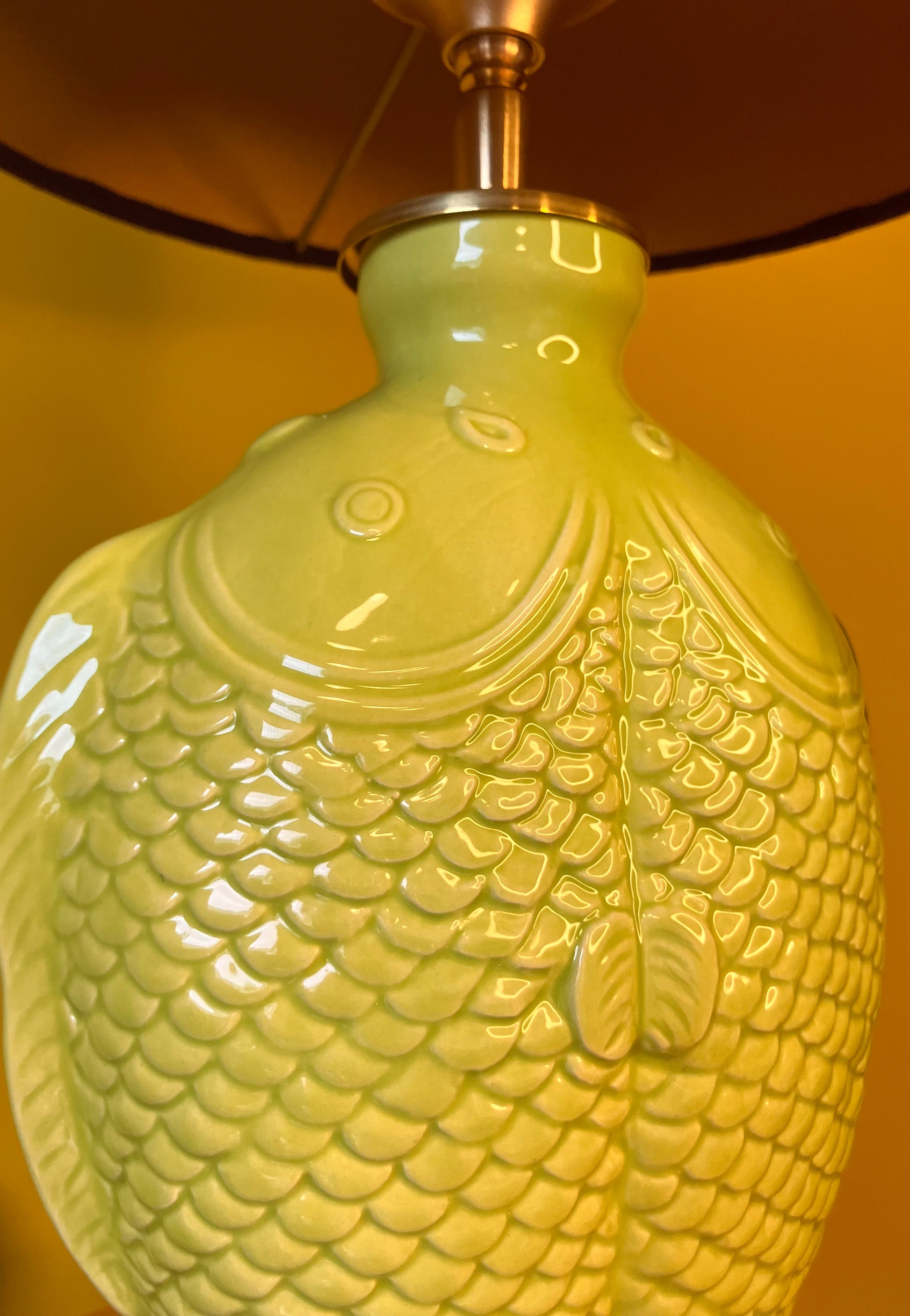De lampenvoeten zijn gemaakt van oranje vazen in de vorm van een vis, en zijn tot de fitting 29 cm hoog. Deze lampenvoet is er ook in het frisgroen (zie laatste twee foto's). Op de foto staat er een lampenkap op een van de twee lampenvoeten met een doorsnee van 30 cm en hoogte van 10 cm. De set zoals op de foto is 39 cm hoog. De kap op de groene vissenlampenvoet heeft een doorsnee van 25 cm en is 20 cm hoog, waardoor de set 49 cm hoog is.