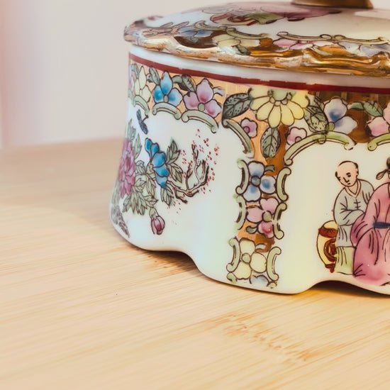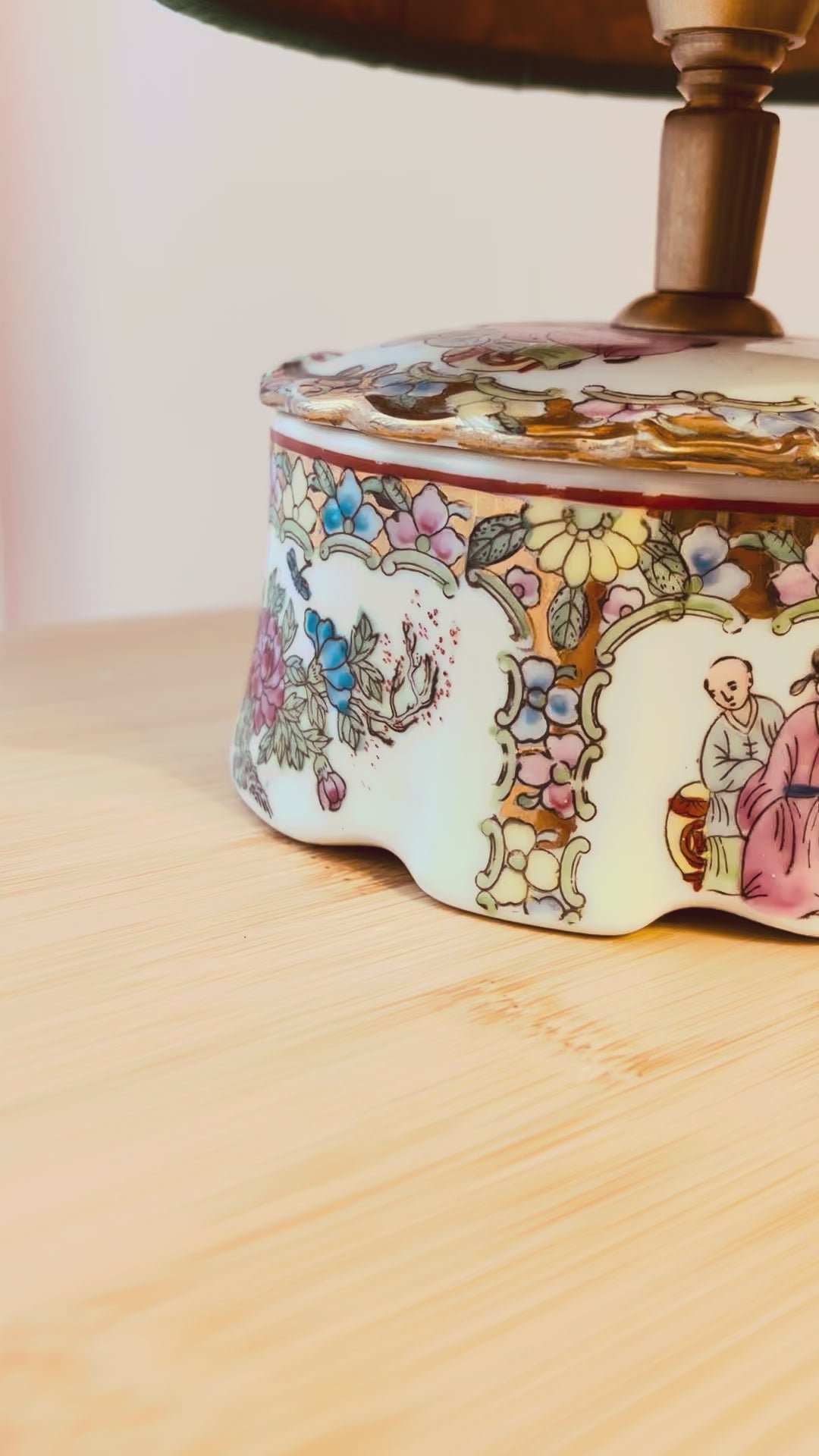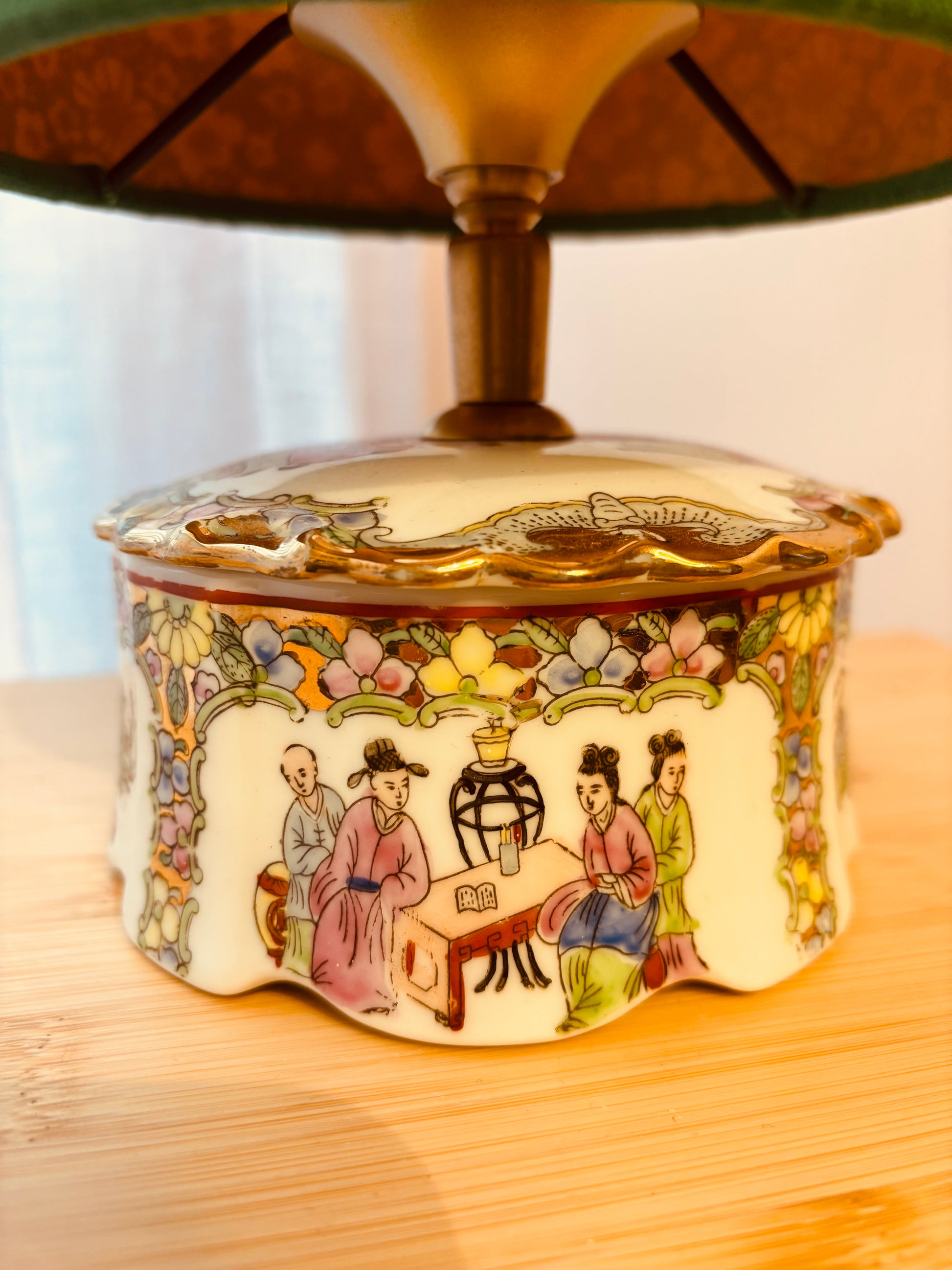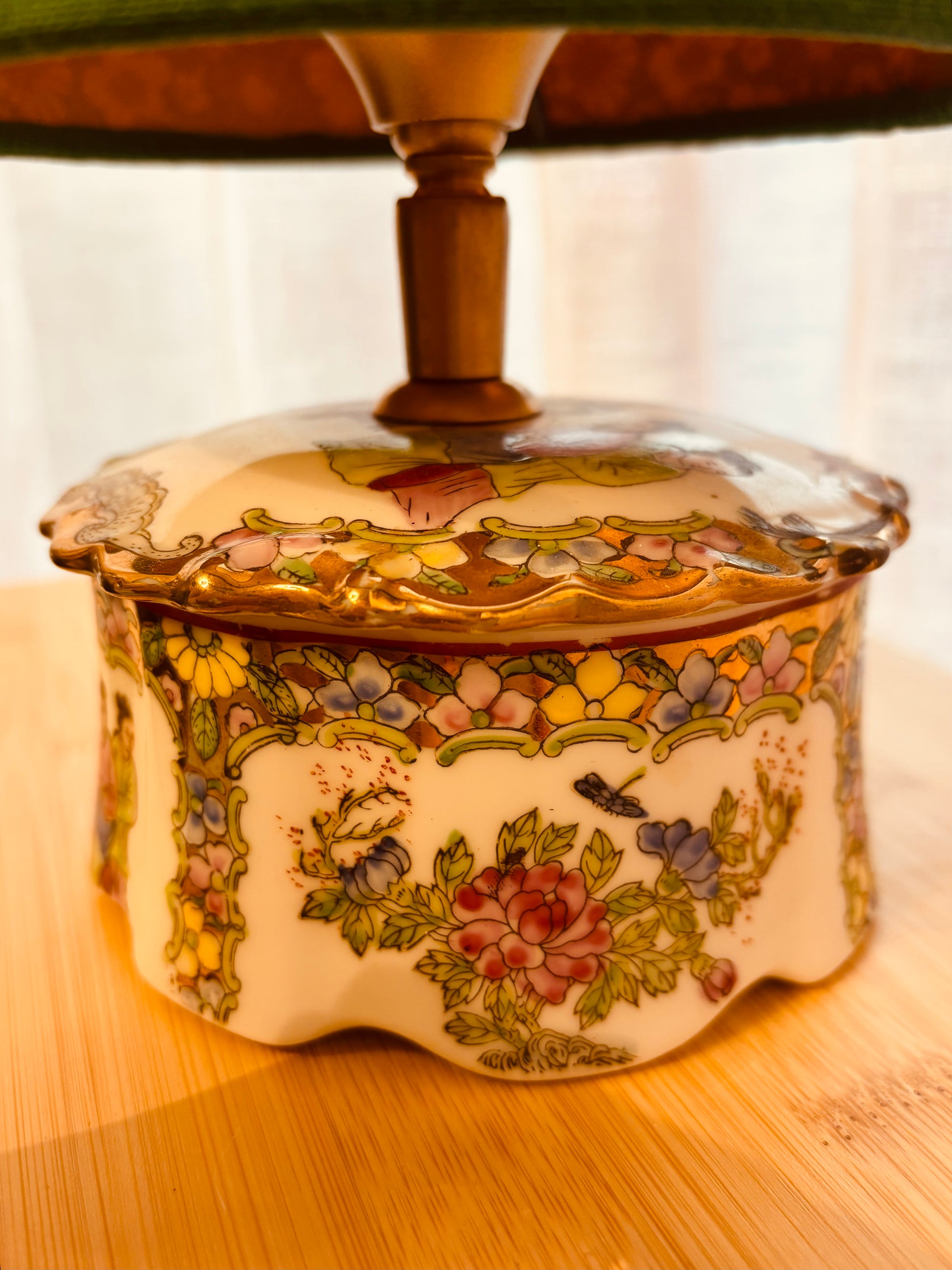 Deze lampenvoet is gemaakt van een wit porseleinen dekselbakje met Chinese tekeningen en gekleurde bloemen. Hij is 10 cm hoog tot de fitting. Op de foto staat er een lampenkap op de lampenvoet met een doorsnee van 15 cm en hoogte van 17 cm. De set zoals op de foto is 27 cm hoog.