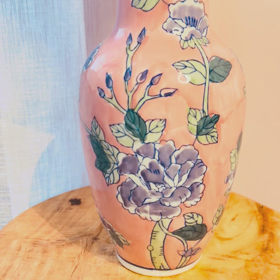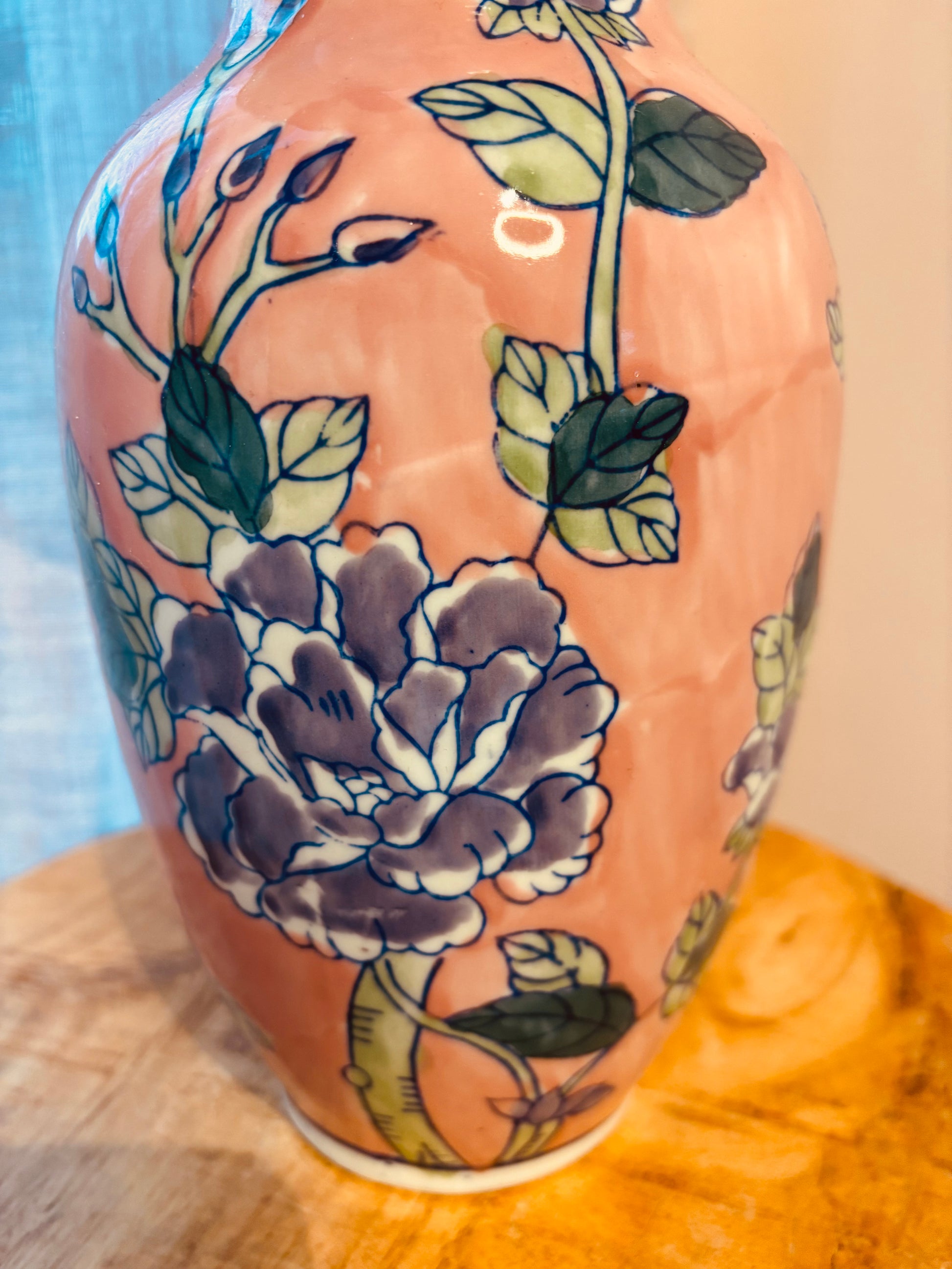 Deze lampenvoet is gemaakt van een roze vaas. Op de lampenvoet staan paarse bloemen met groene blaadjes. Hij is tot de fitting 30 cm hoog. Op de foto staat er op de voet een lampenkap met een doorsnee van 20 cm en hoogte van 23 cm. Dit maakt de set 53 cm hoog.