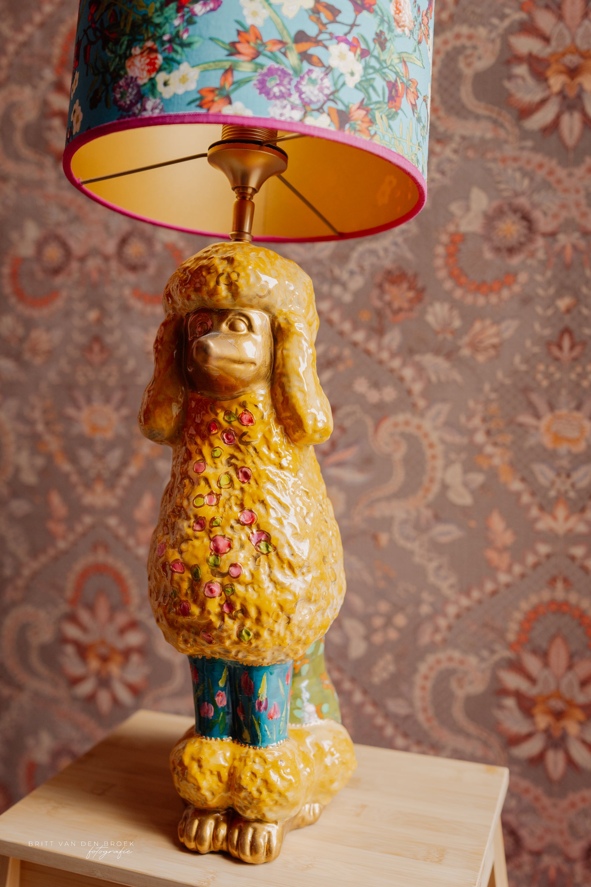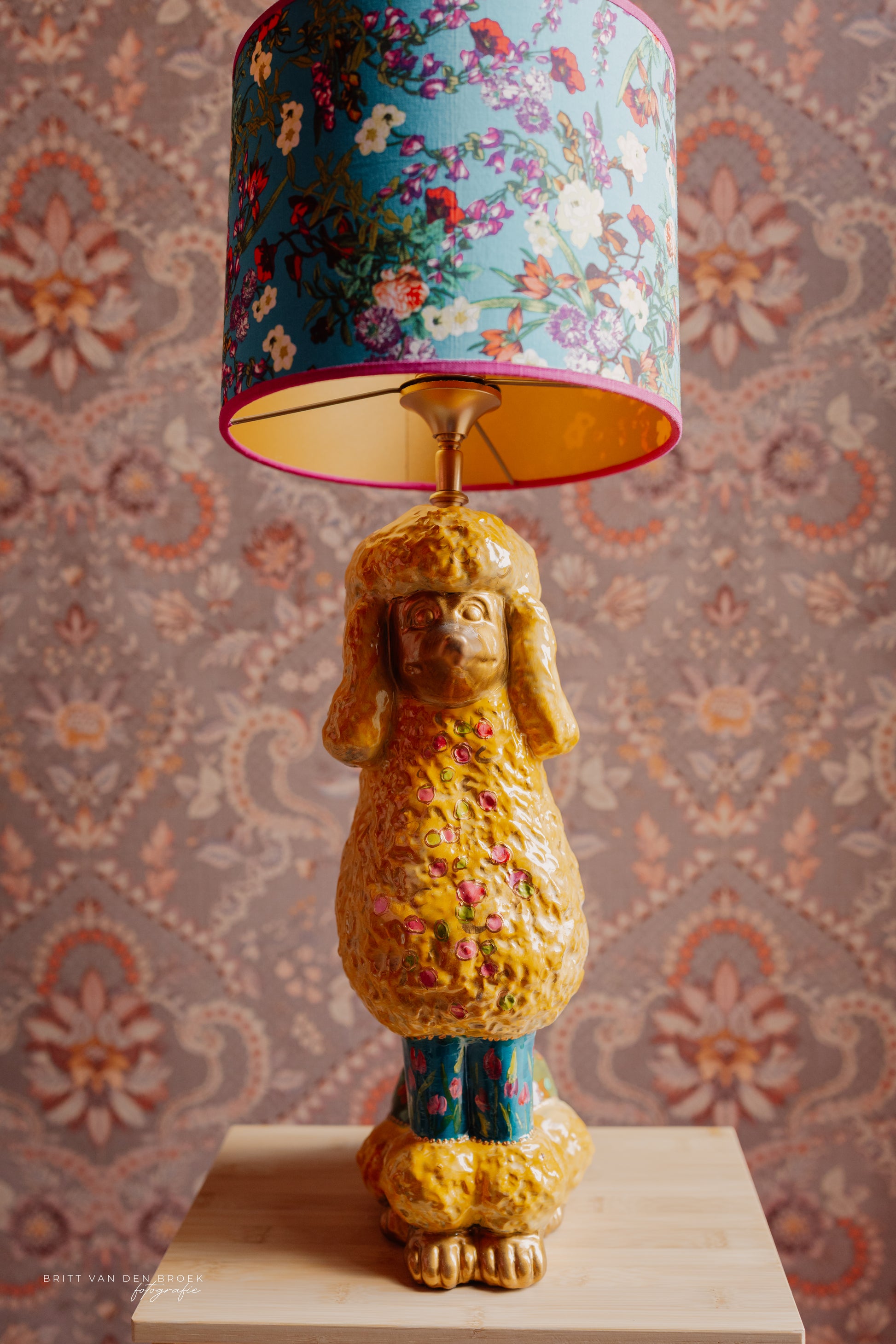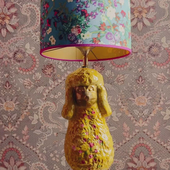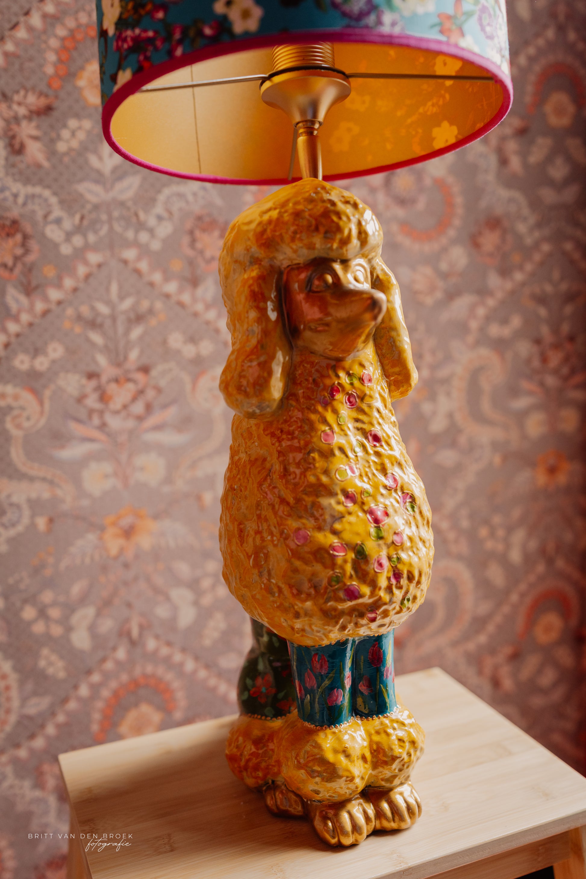 Deze lampenvoet is gemaakt van een beeld in de vorm van een poedel. De poedel is handgeschilderd door By Mariel en zit vol met leuke details als bloemetjes. Hij is tot de fitting 45 cm hoog. Op de foto staat er op de voet een lampenkap met een doorsnee van 25 cm en hoogte van 20 cm. Dit maakt de set zoals op de foto 65 cm hoog.