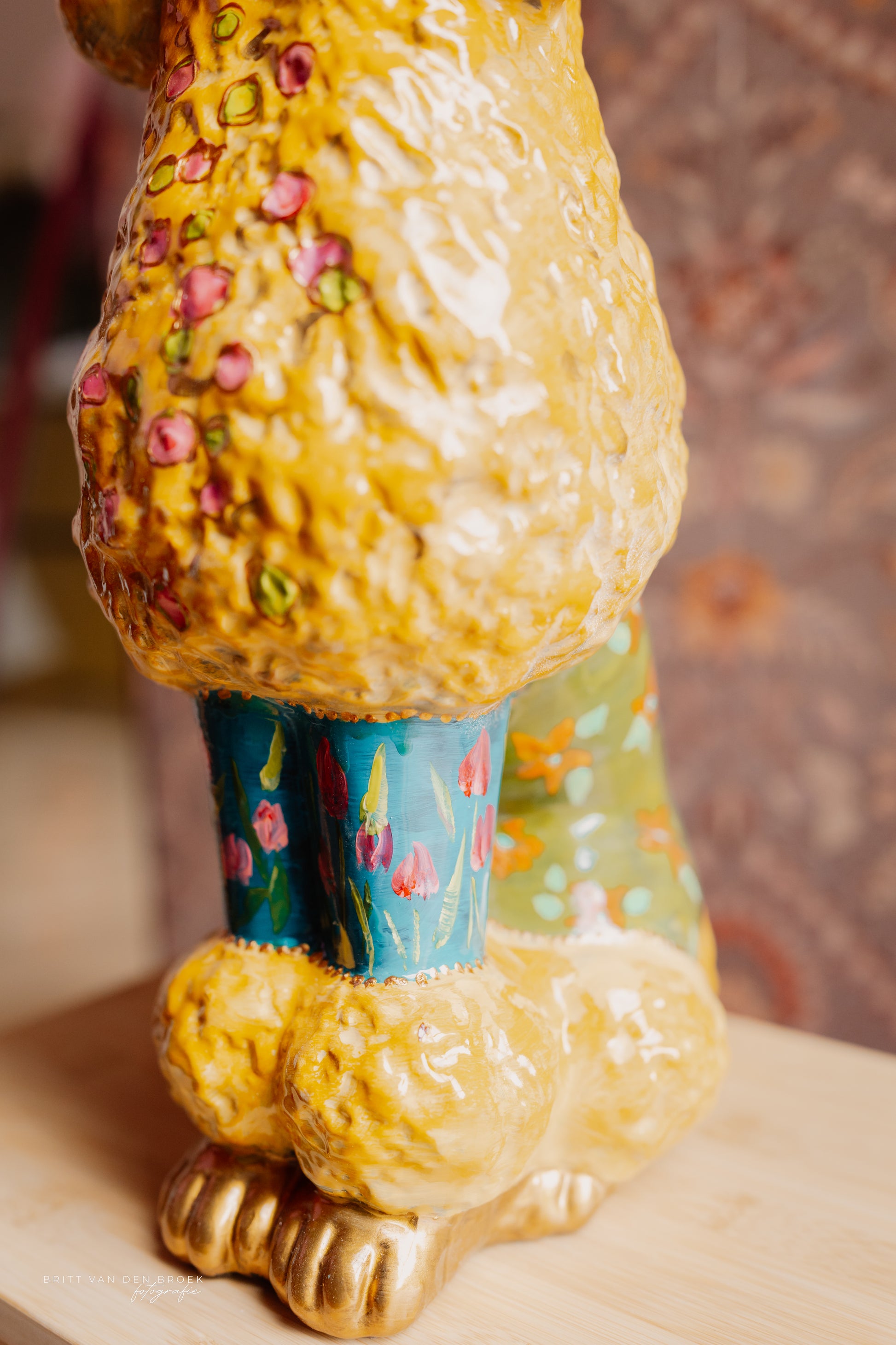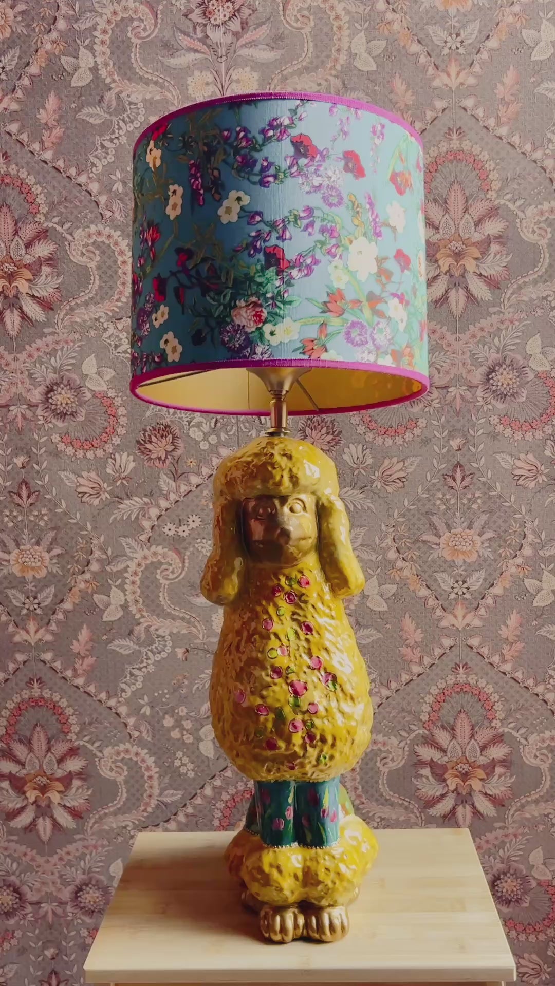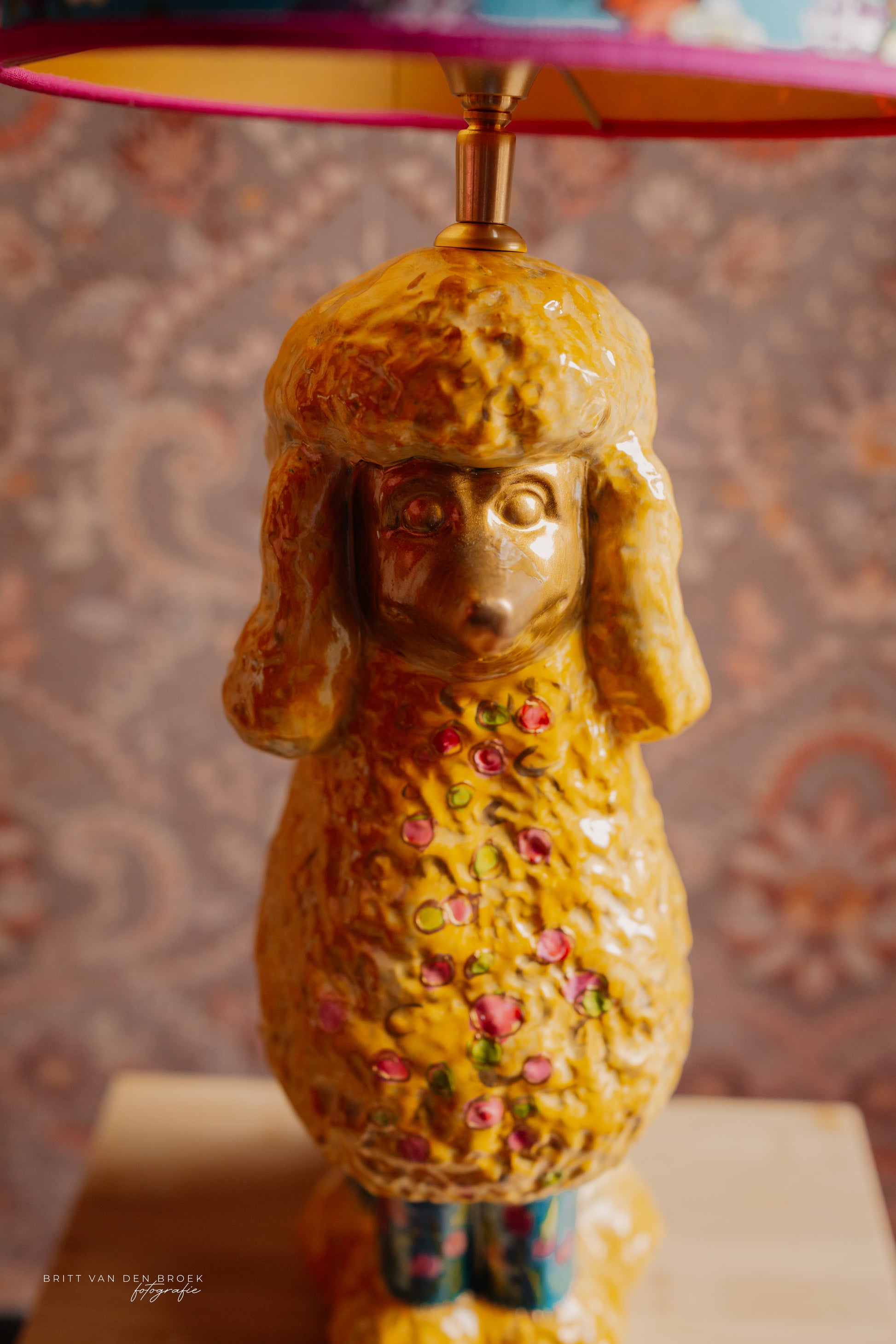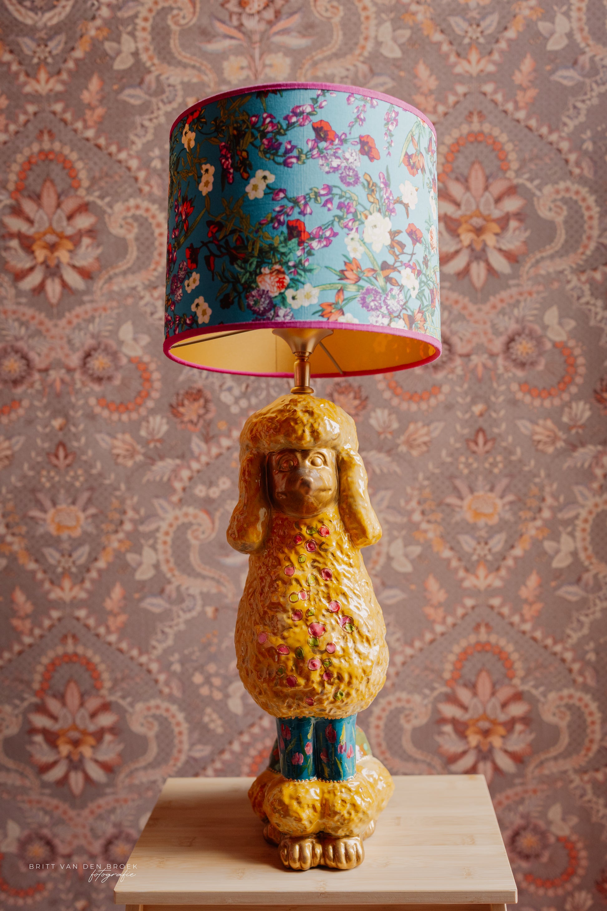 Deze lampenvoet is gemaakt van een beeld in de vorm van een poedel. De poedel is handgeschilderd door By Mariel en zit vol met leuke details als bloemetjes. Hij is tot de fitting 45 cm hoog. Op de foto staat er op de voet een lampenkap met een doorsnee van 25 cm en hoogte van 20 cm. Dit maakt de set zoals op de foto 65 cm hoog.