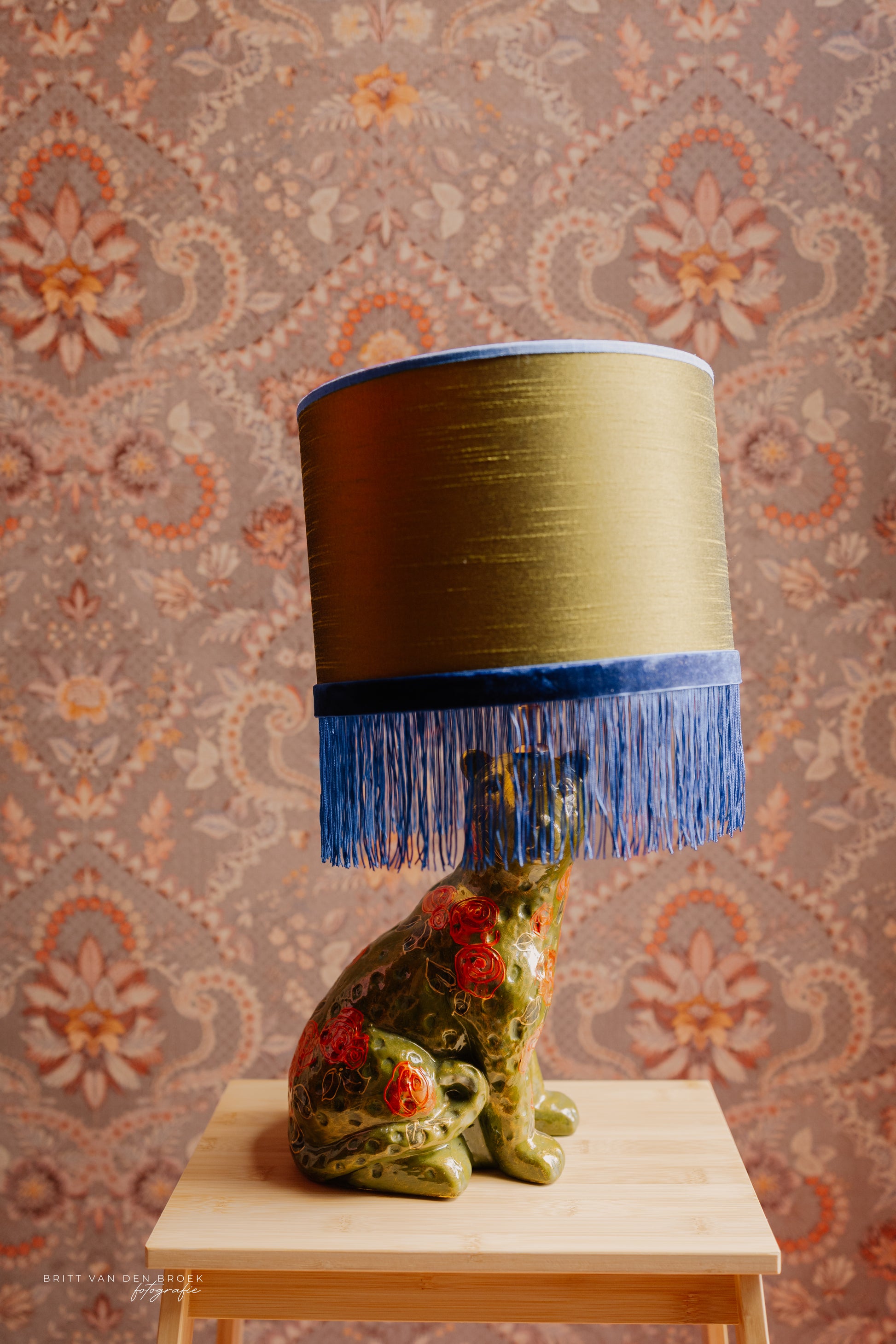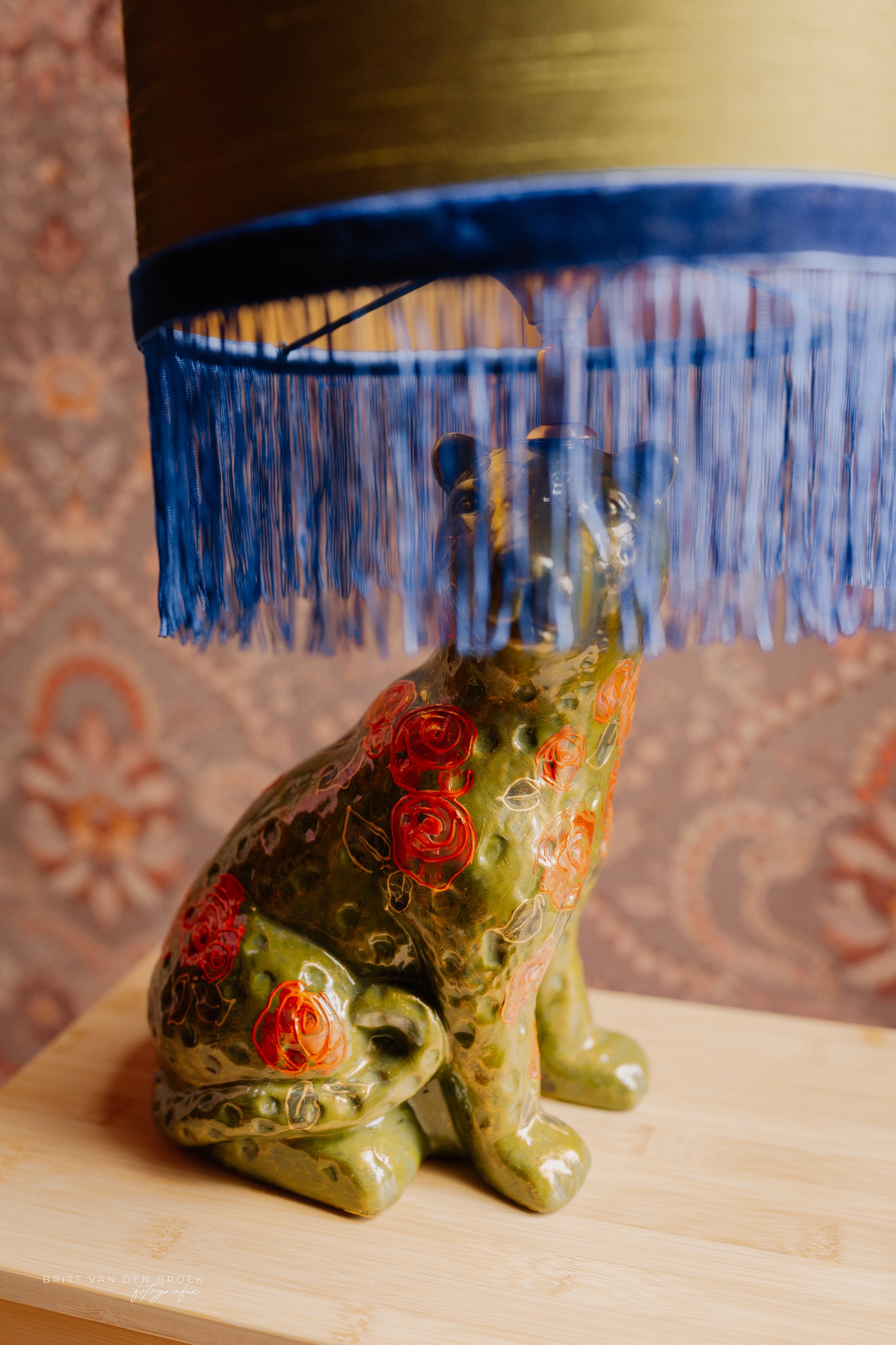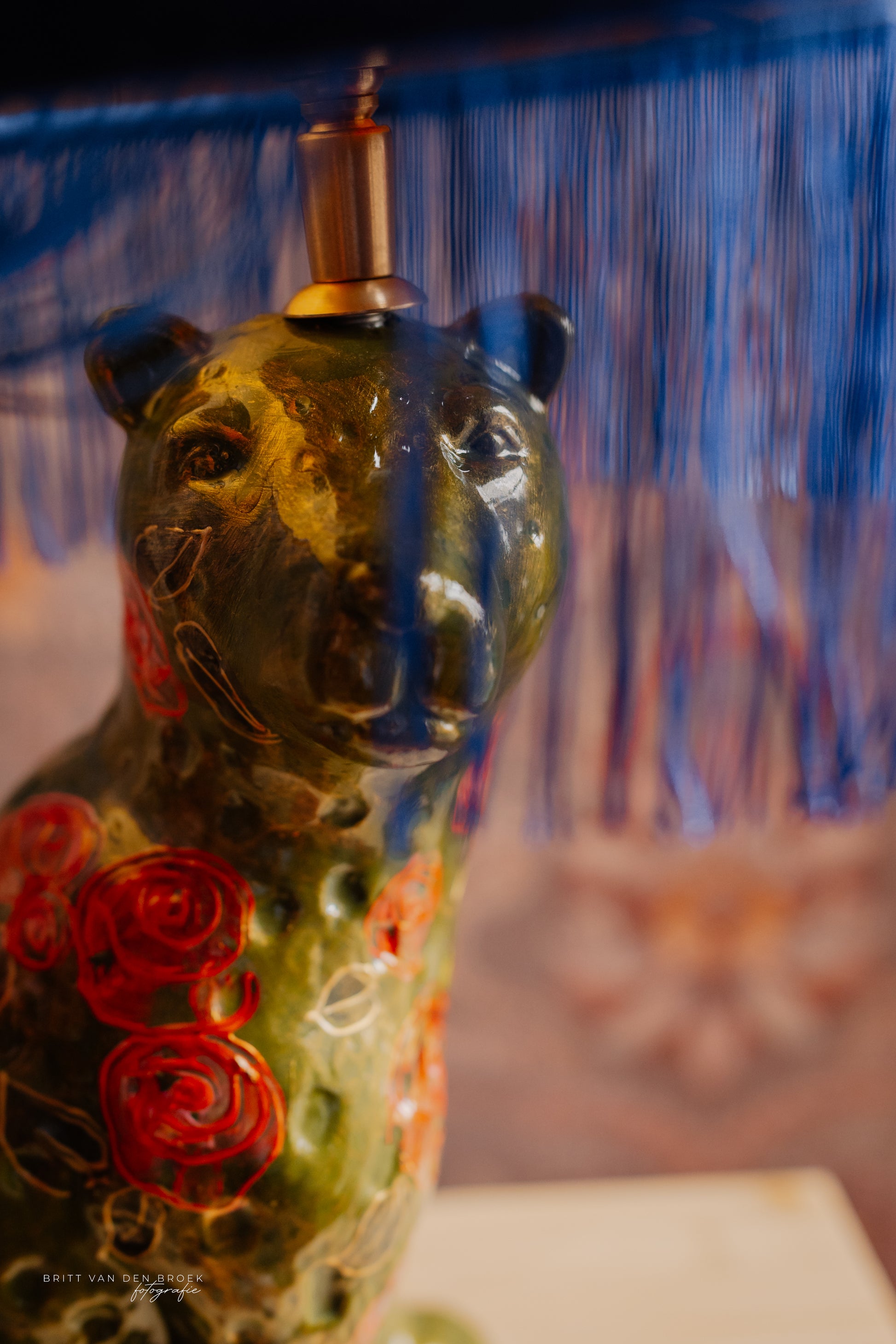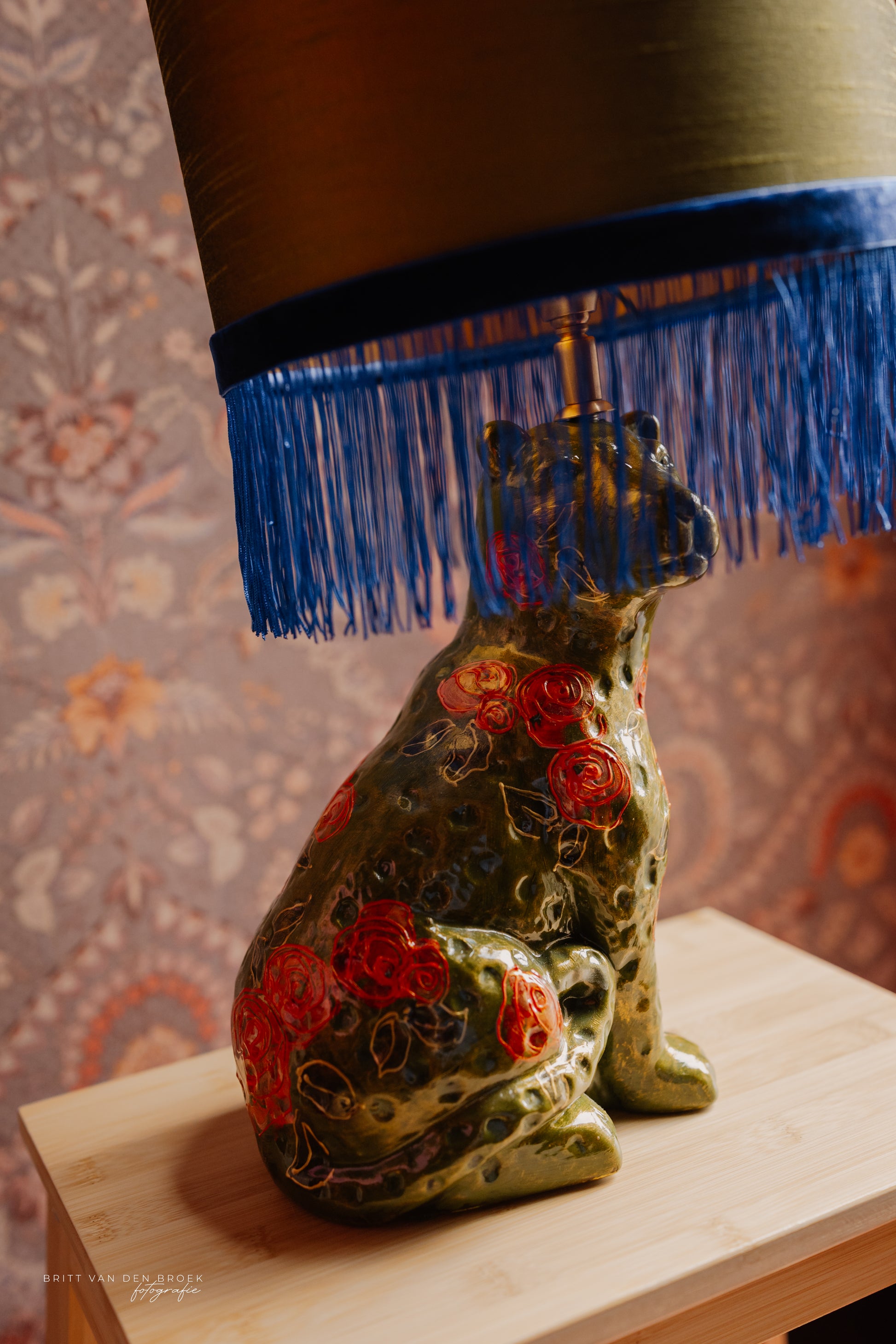 Deze lampenvoet is gemaakt van een beeld in de vorm van een luipaard. Het beeld is handgeschilderd door By Mariel en is groen met bloemen. Hij is tot de fitting 26 cm hoog. Op de foto staat er op de voet een lampenkap met een doorsnee van 25 cm en hoogte van 18 cm (exclusief franjes). Dit maakt de set zoals op de foto 44 cm hoog. Indien gewenst kan de lampenvoet zodanig gemonteerd worden dat de lampenkap er horizontaal op komt te staan.