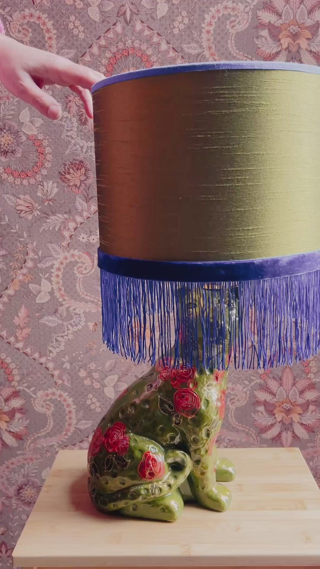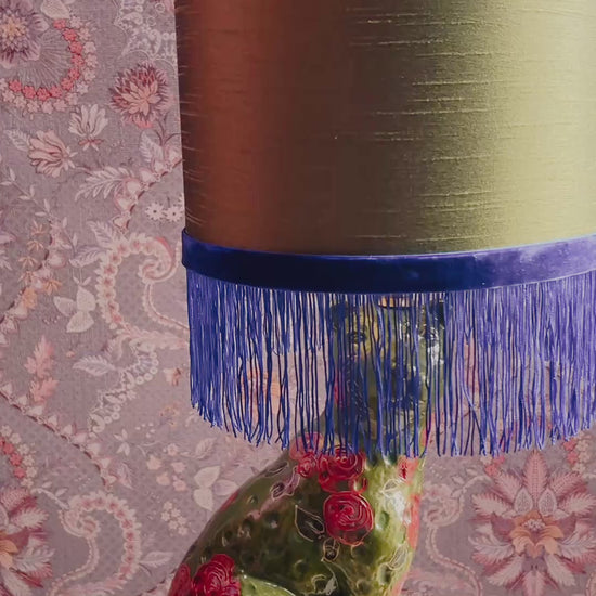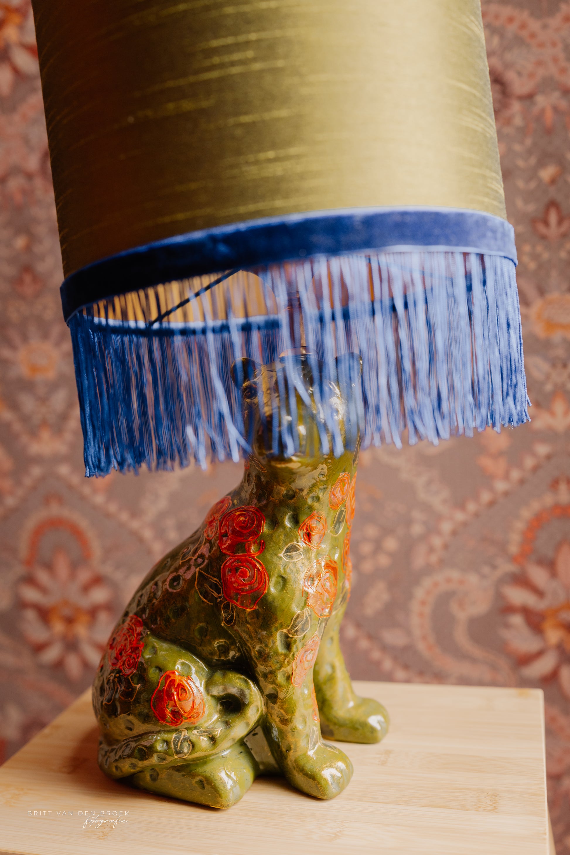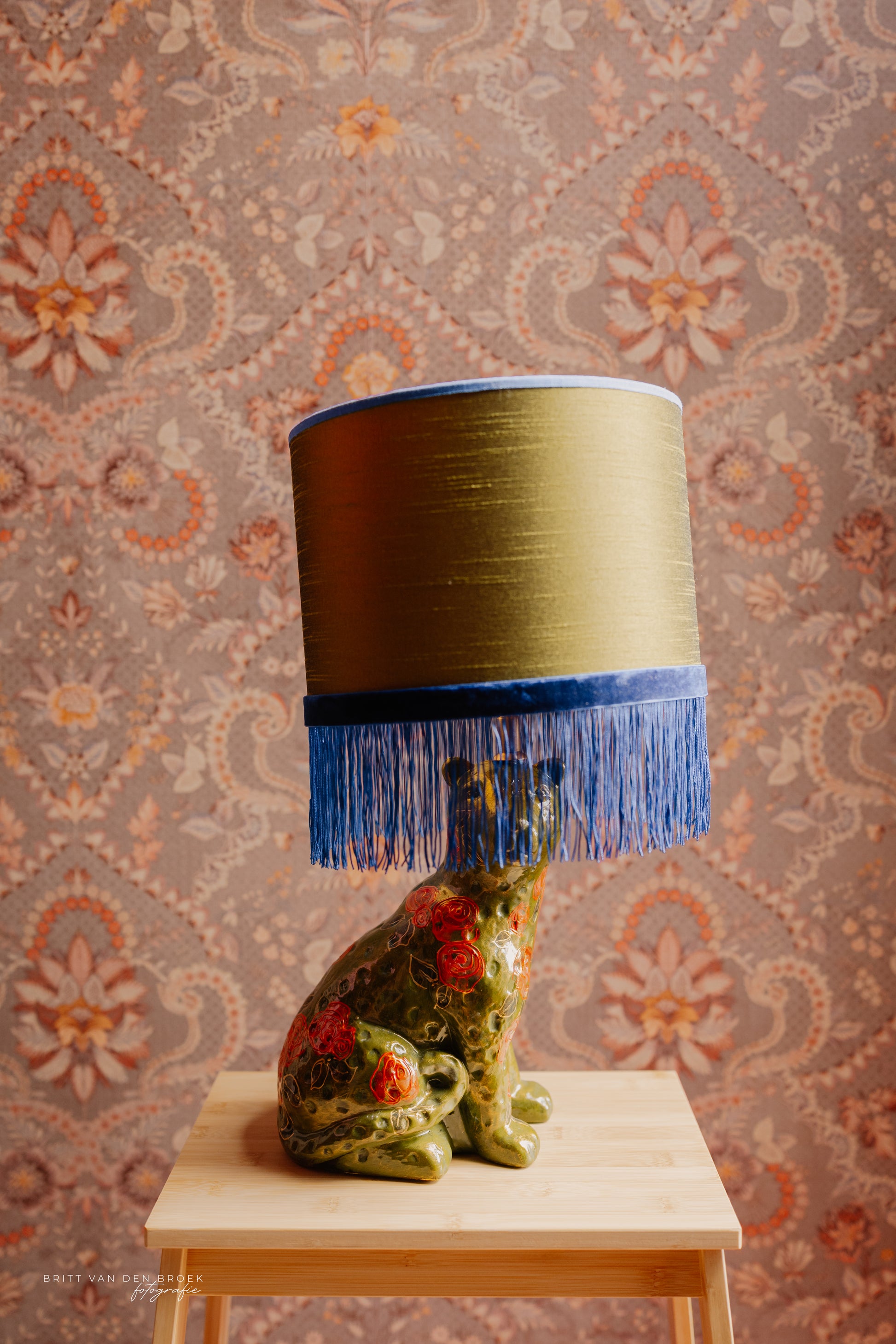 Deze lampenvoet is gemaakt van een beeld in de vorm van een luipaard. Het beeld is handgeschilderd door By Mariel en is groen met bloemen. Hij is tot de fitting 26 cm hoog. Op de foto staat er op de voet een lampenkap met een doorsnee van 25 cm en hoogte van 18 cm (exclusief franjes). Dit maakt de set zoals op de foto 44 cm hoog. Indien gewenst kan de lampenvoet zodanig gemonteerd worden dat de lampenkap er horizontaal op komt te staan.