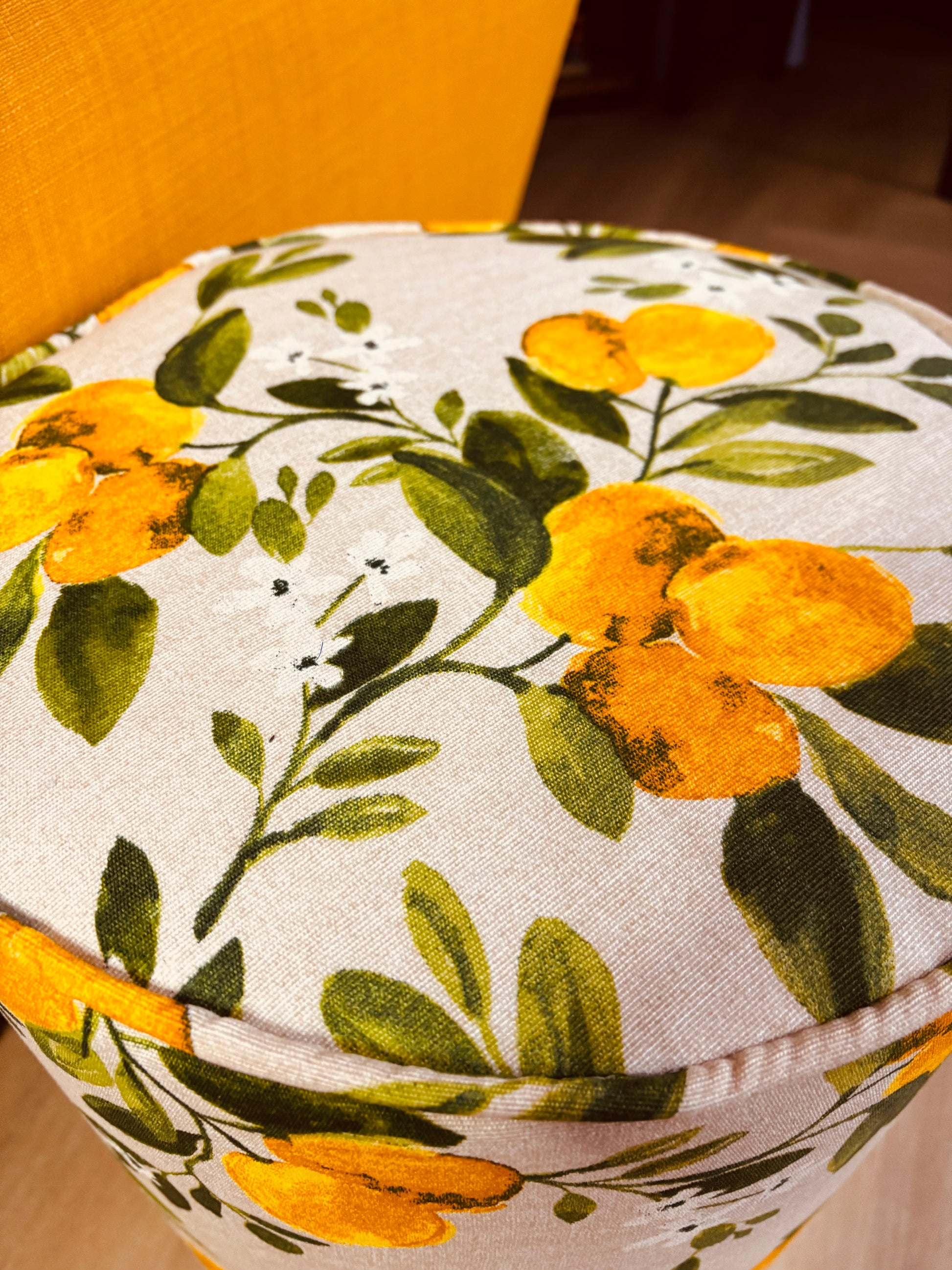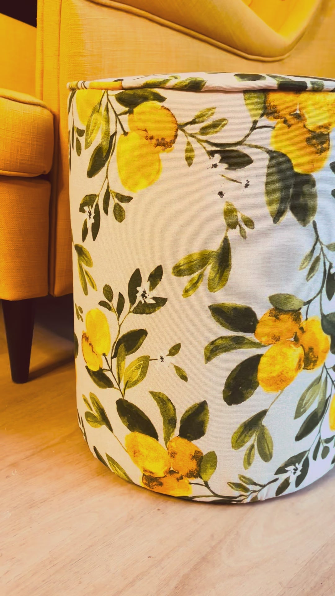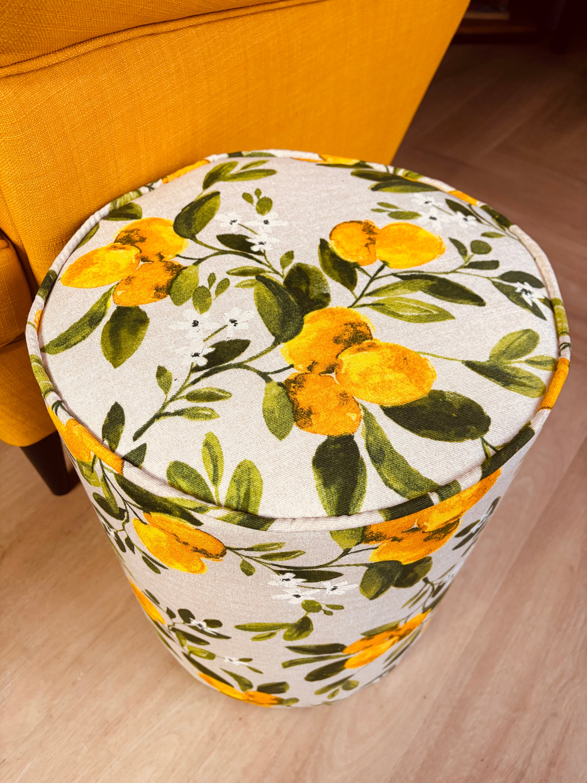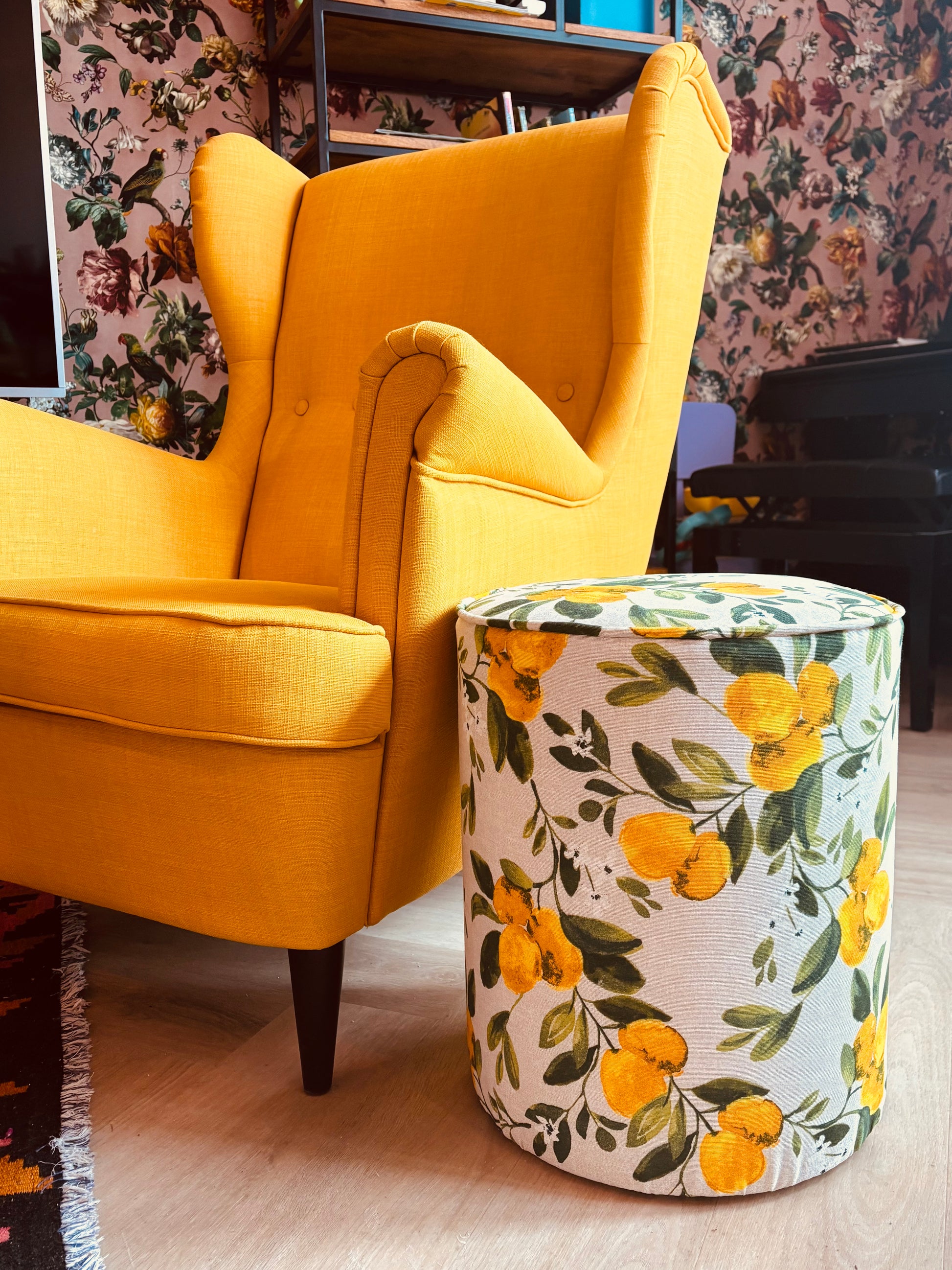 Leuke poef met citroenen. Doorsnee is 35 cm en hoogte 42 cm. De hele poef is bekleed met eenzelfde canvasstof; ook het biesje is gemaakt van dezelfde stof. De gehele poef is handgemaakt.