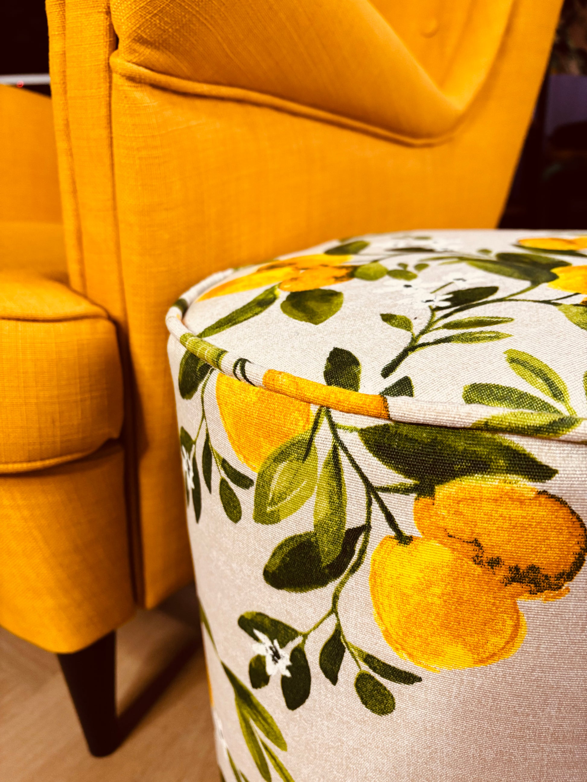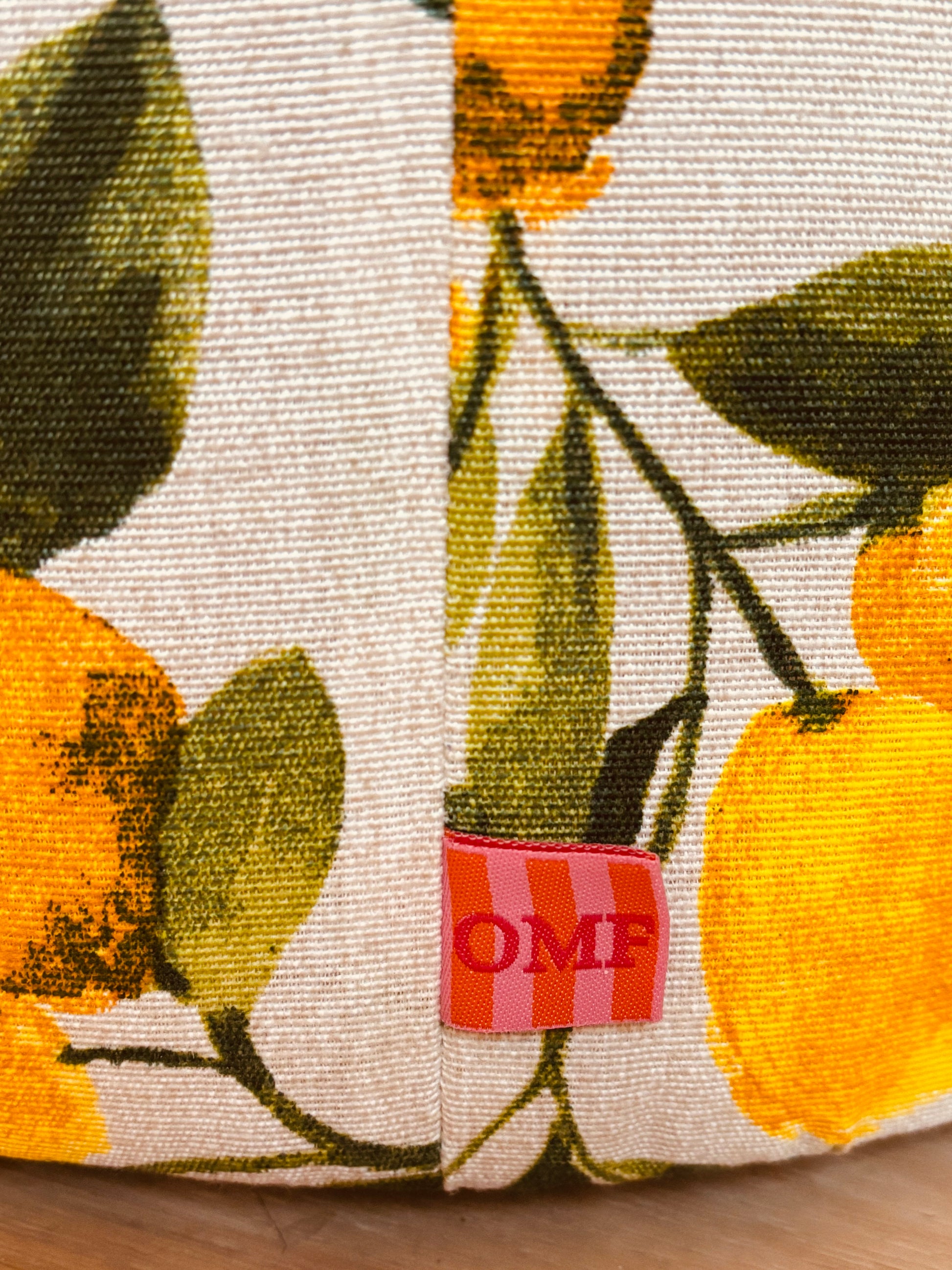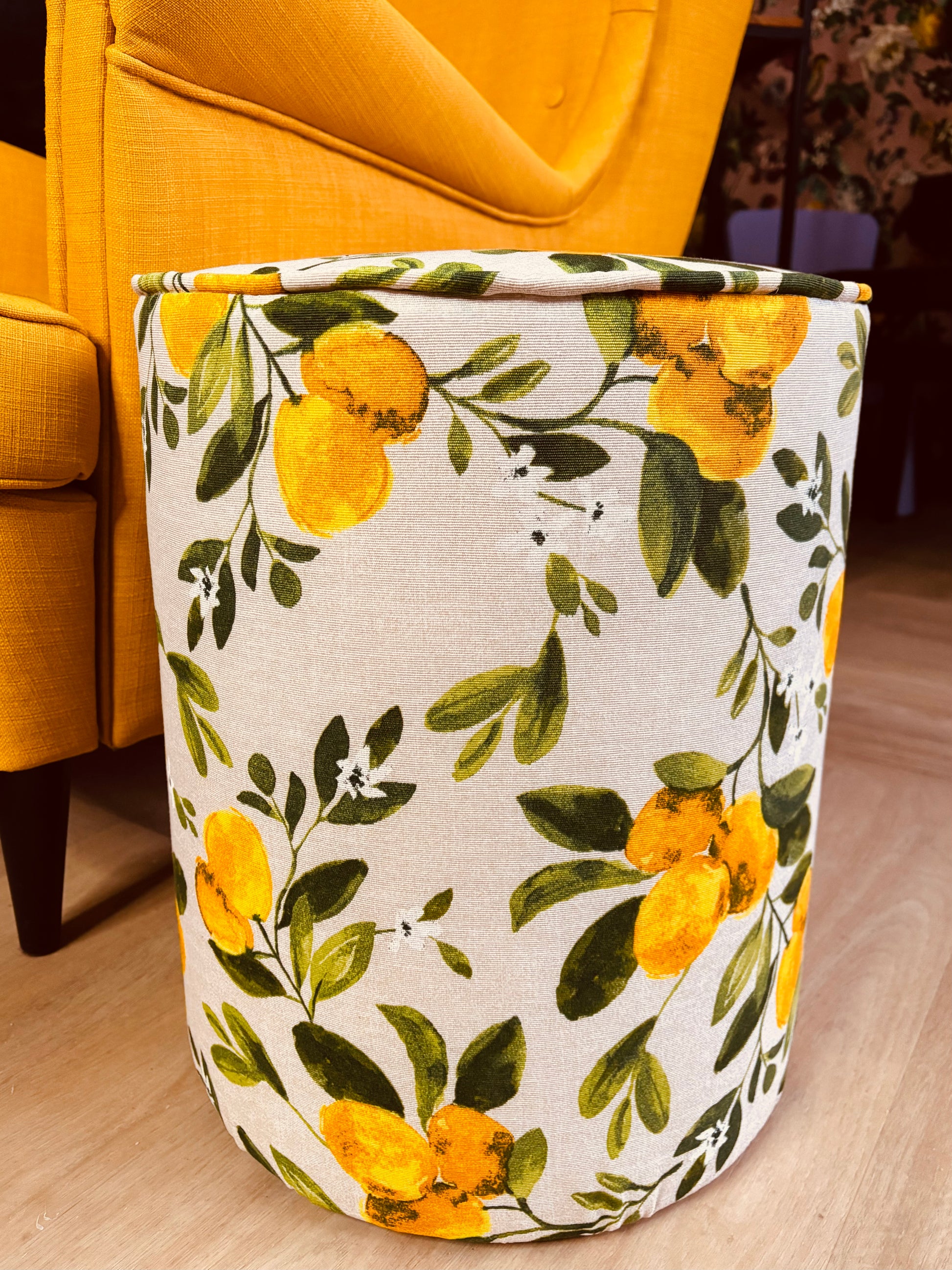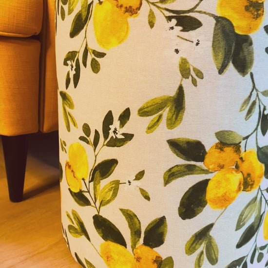 Leuke poef met citroenen. Doorsnee is 35 cm en hoogte 42 cm. De hele poef is bekleed met eenzelfde canvasstof; ook het biesje is gemaakt van dezelfde stof. De gehele poef is handgemaakt.
