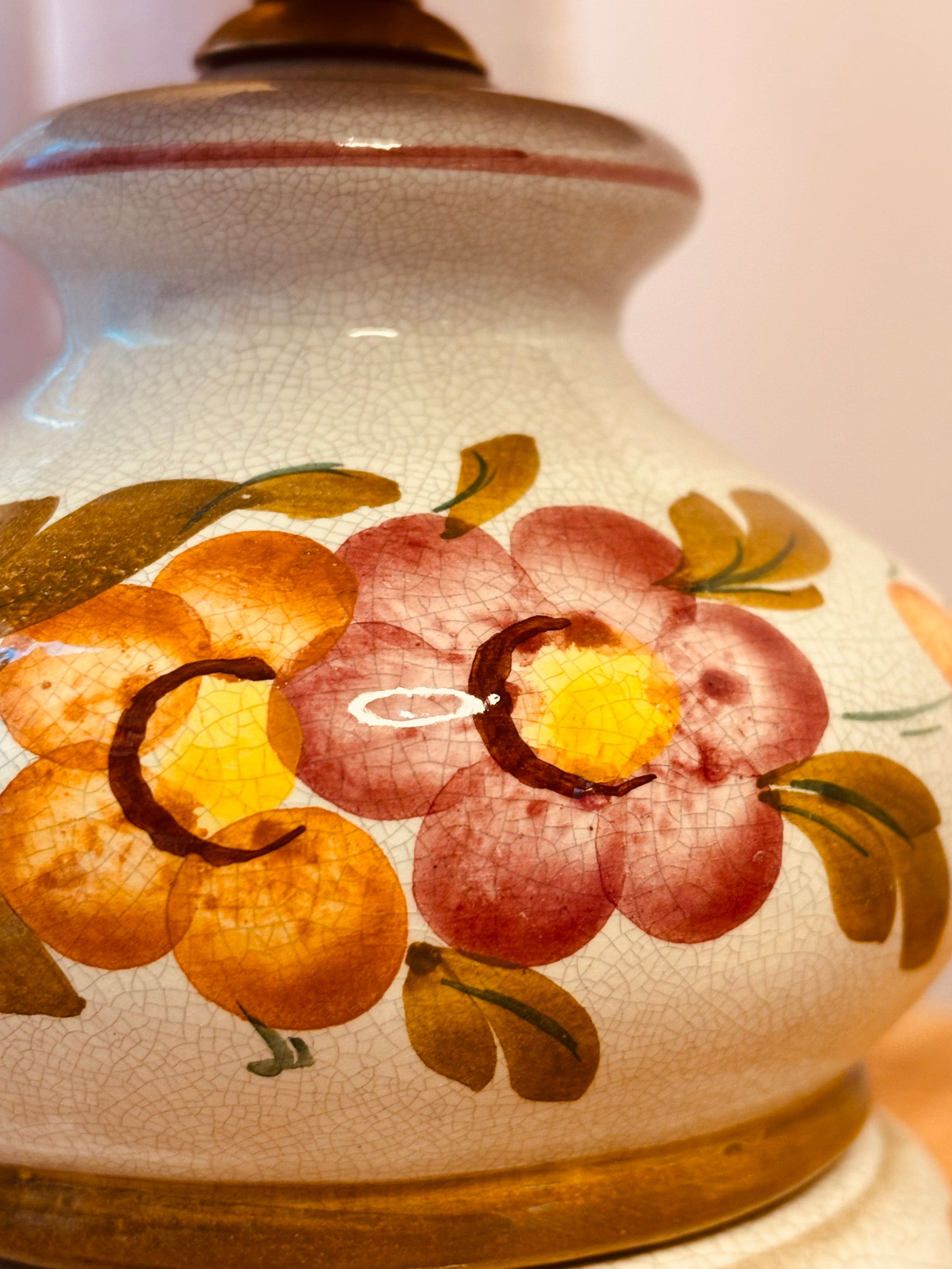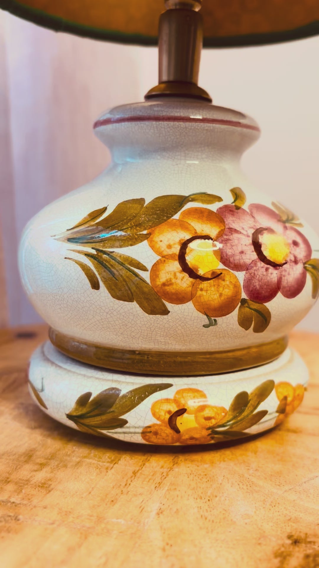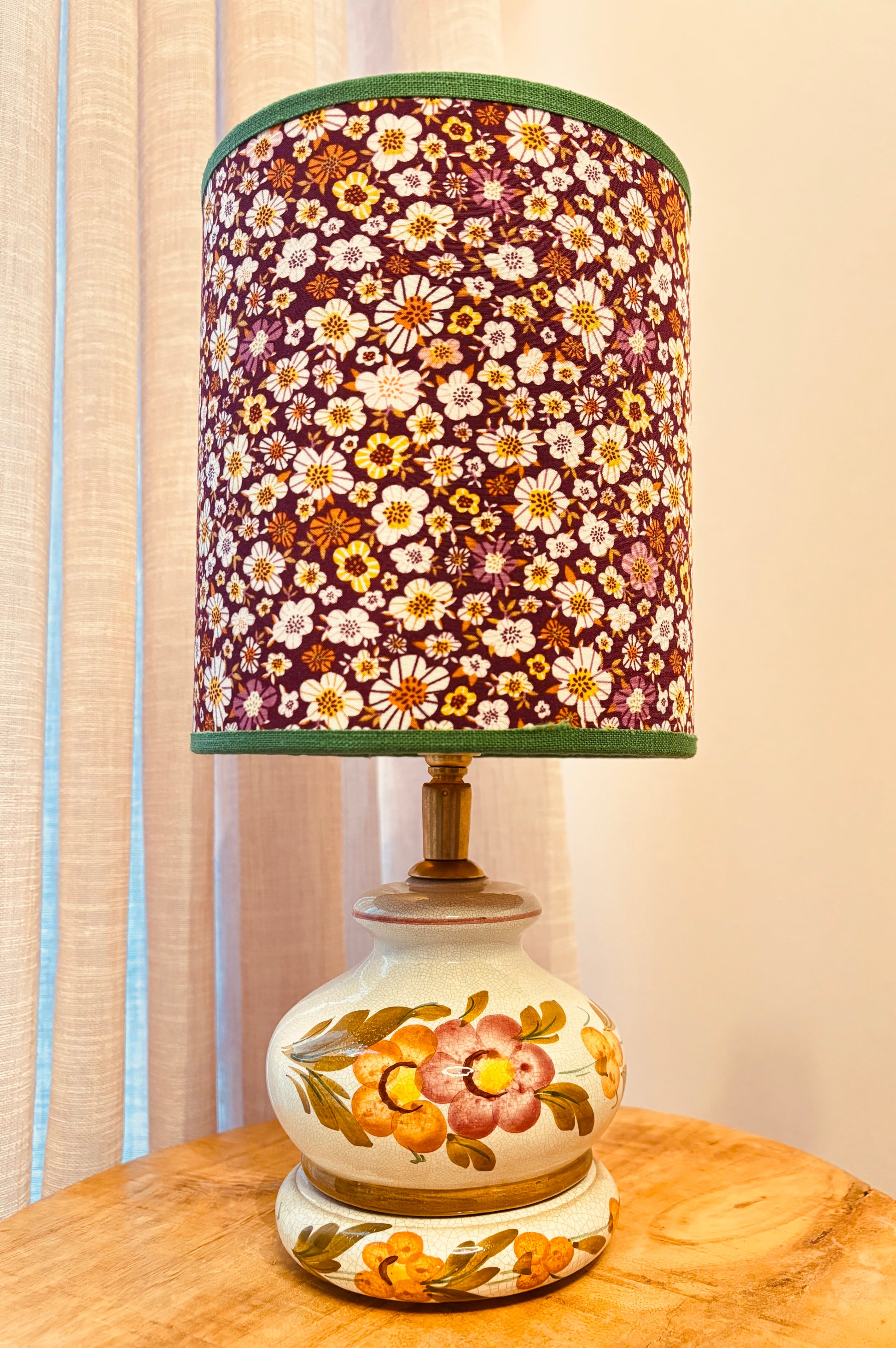 Deze retro lampenvoet is 15 cm hoog tot de fitting. Op de foto staat er een lampenkap op de lampenvoet met een doorsnee van 15 cm en hoogte van 17 cm. De set zoals op de foto is 32 cm hoog.